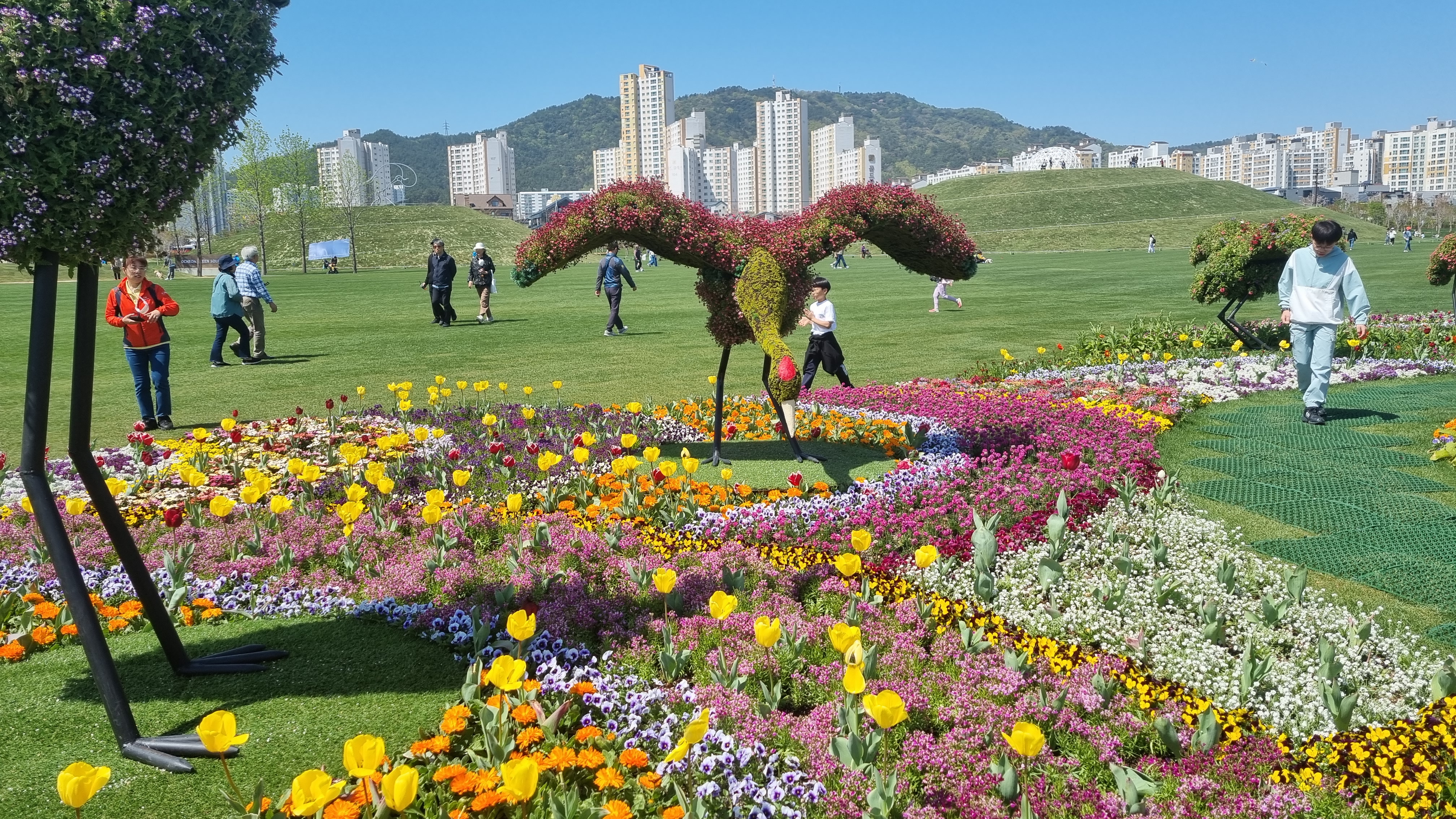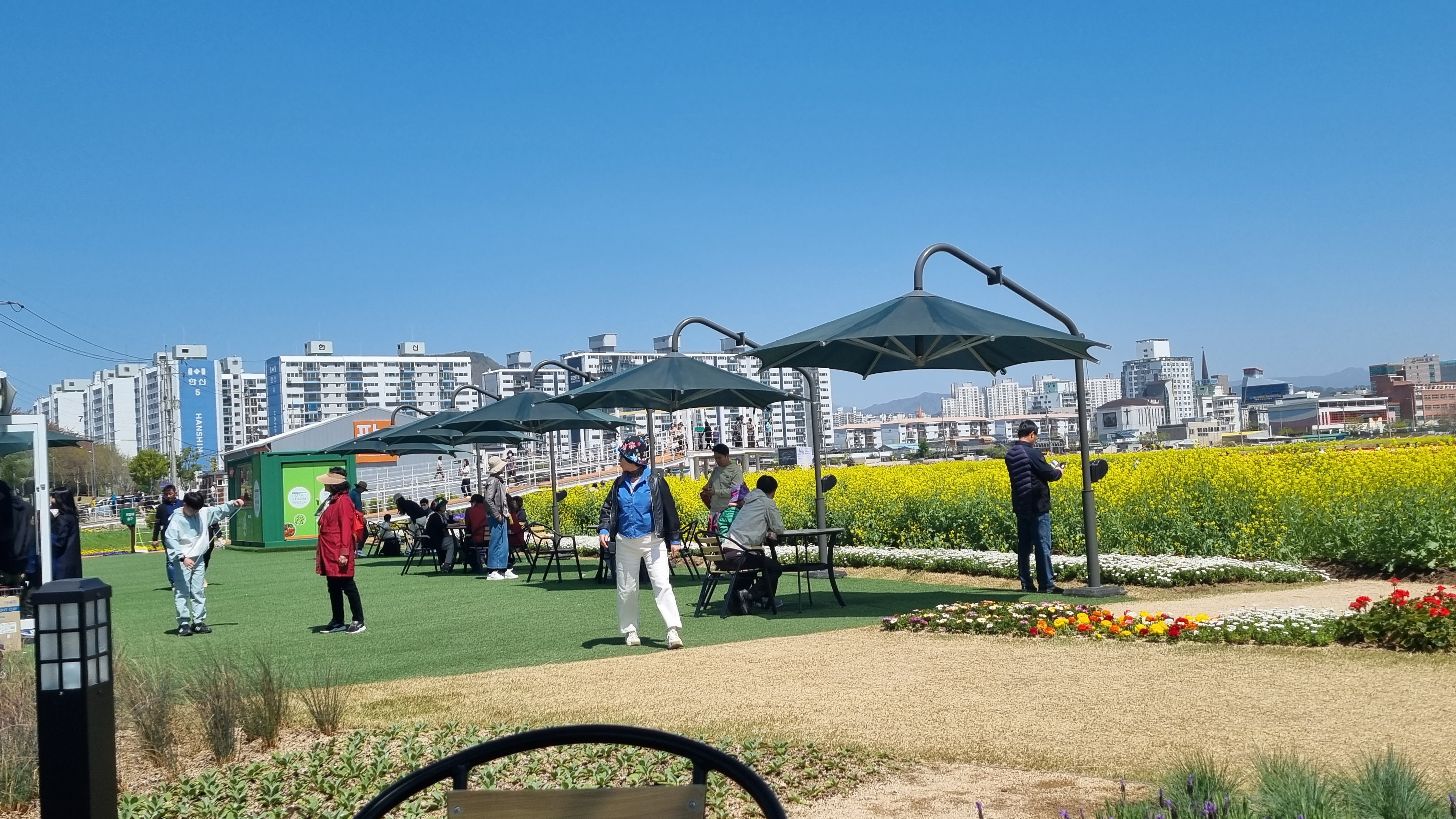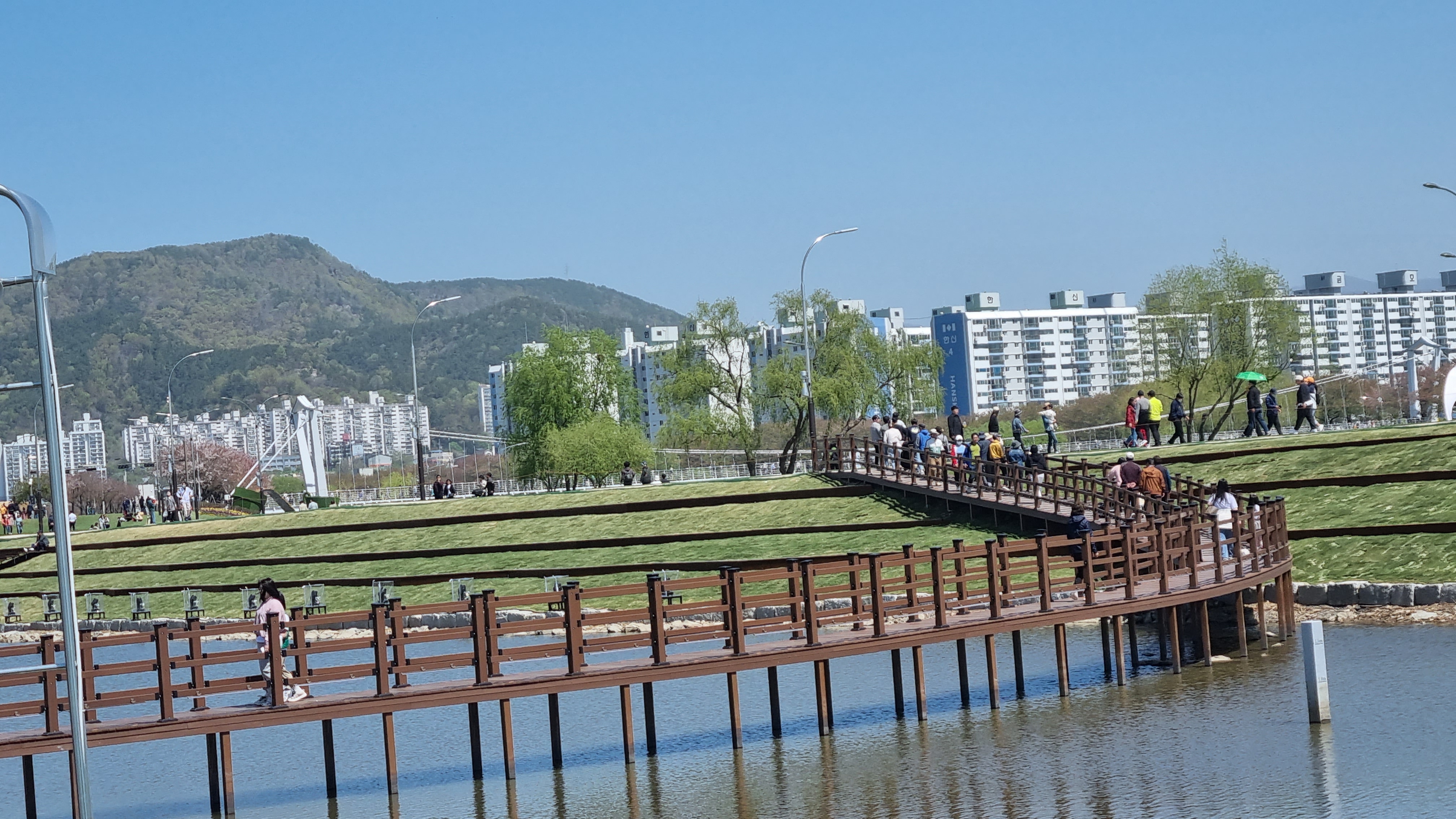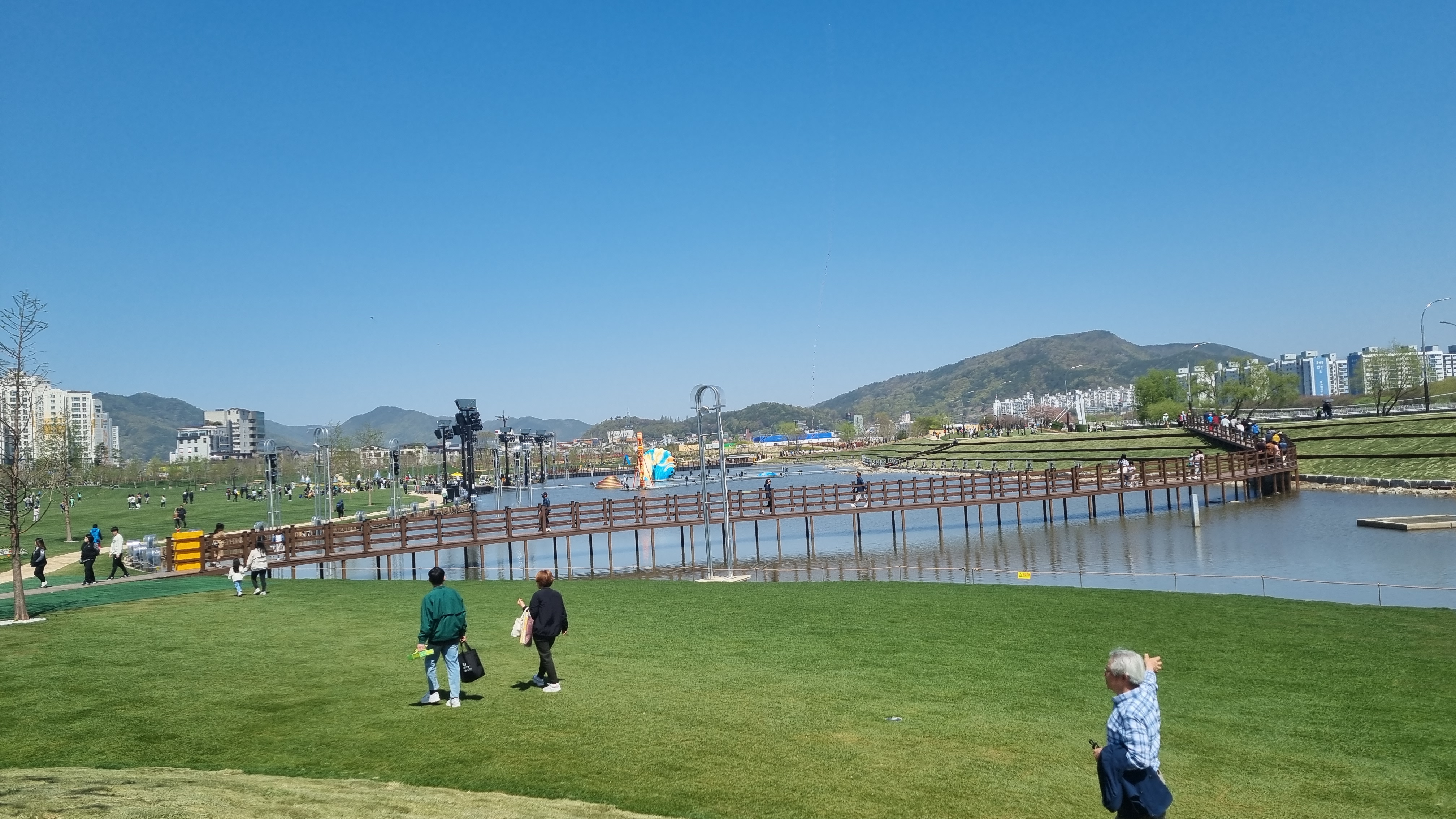 이곳은 이전에 4차선 강변로가 있던 곳인데 이번 박람회를 맞이하여 도로를 폐쇄하고 잔디밭을 만들어 동천과 함께 어우러져 아름다운 자연경관이 만들어졌습니다.