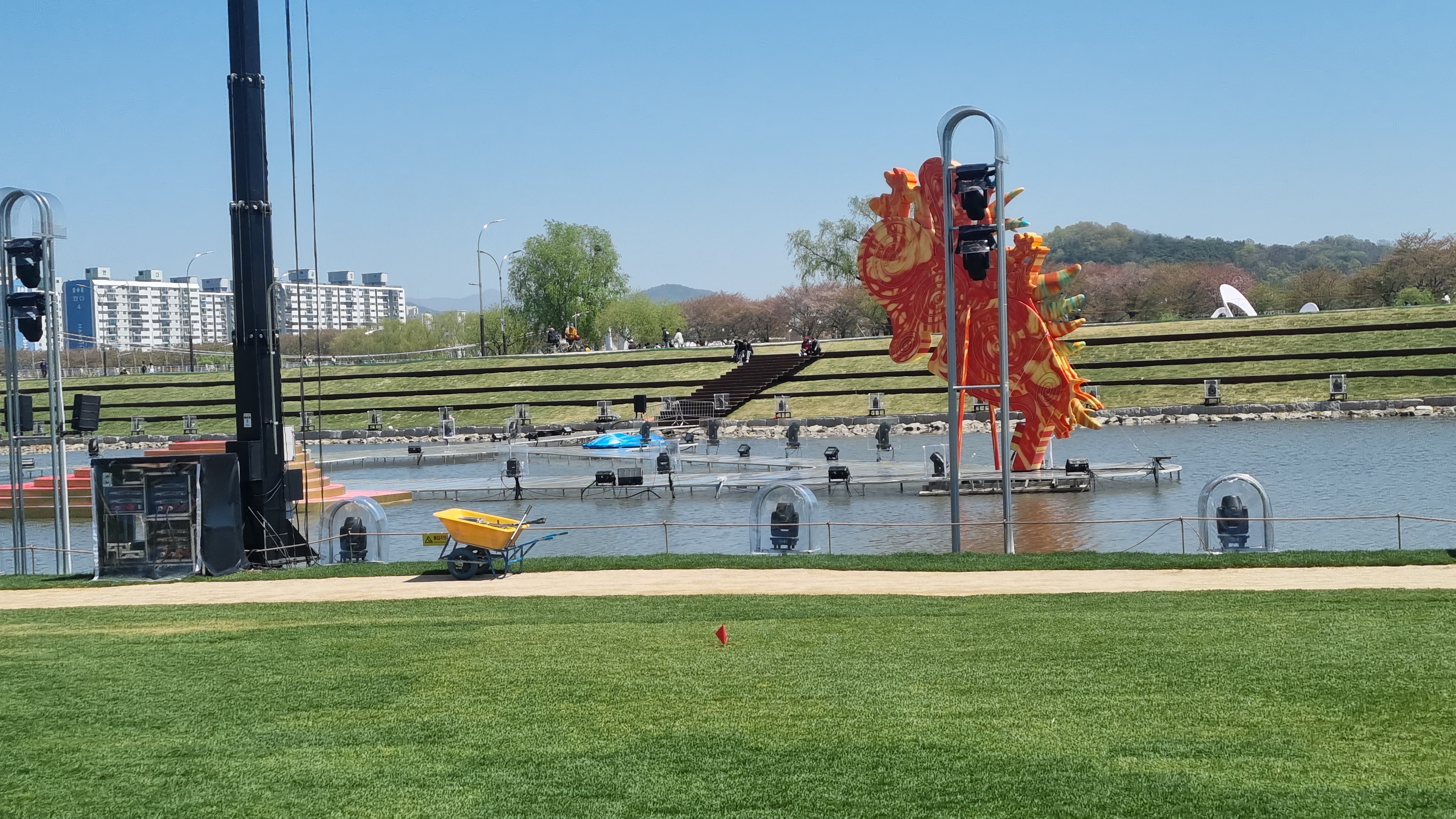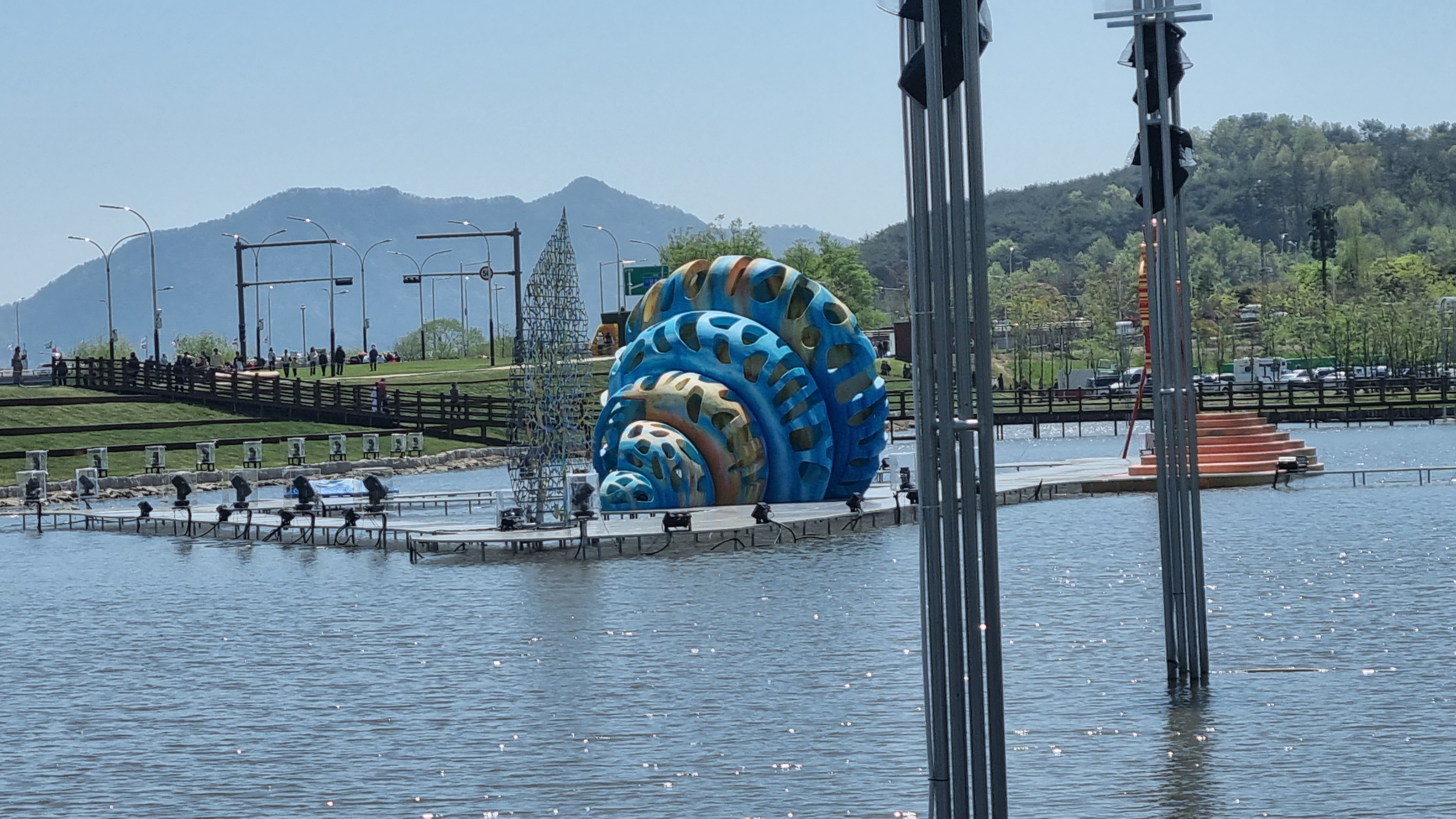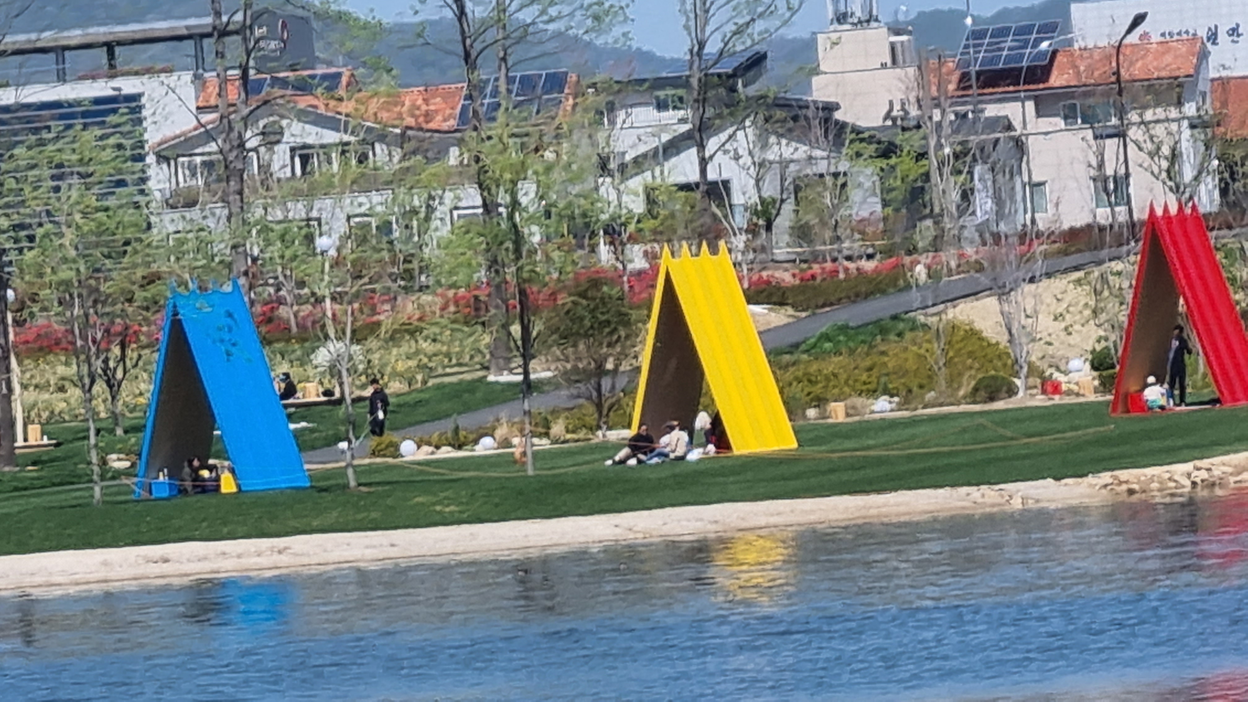 저류지 공원의 호수입니다. 바로 뒤쪽은 동천인데 작은 유람선이 다니고 출렁다리도 있는데 그냥 괜찮습니다. 이곳 호수에 무대도 설치되어 있어 각종 공연이 펼쳐지는데 잔디밭에 호수공원에서 펼쳐지는 공연도 볼만하다고 합니다.