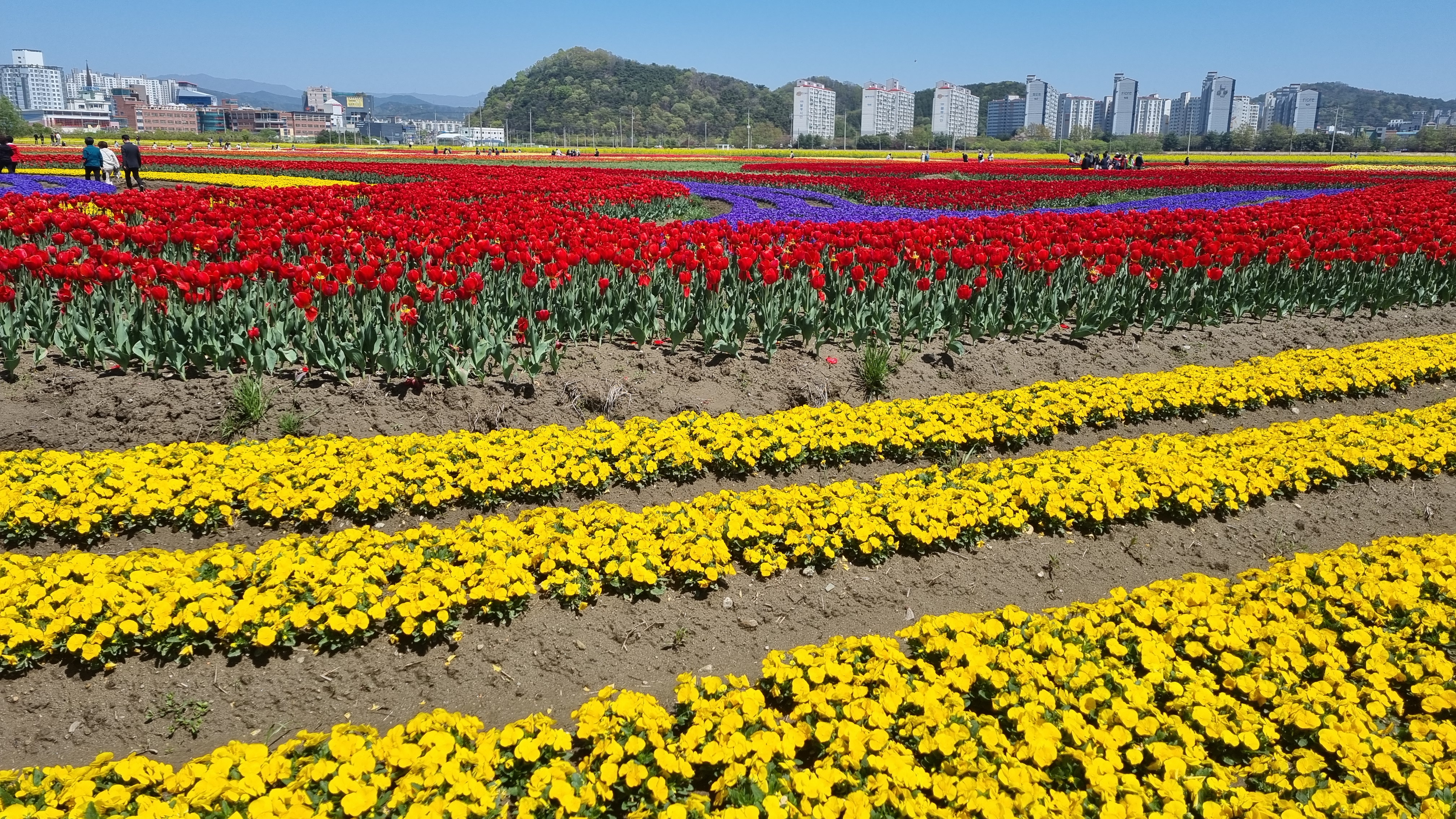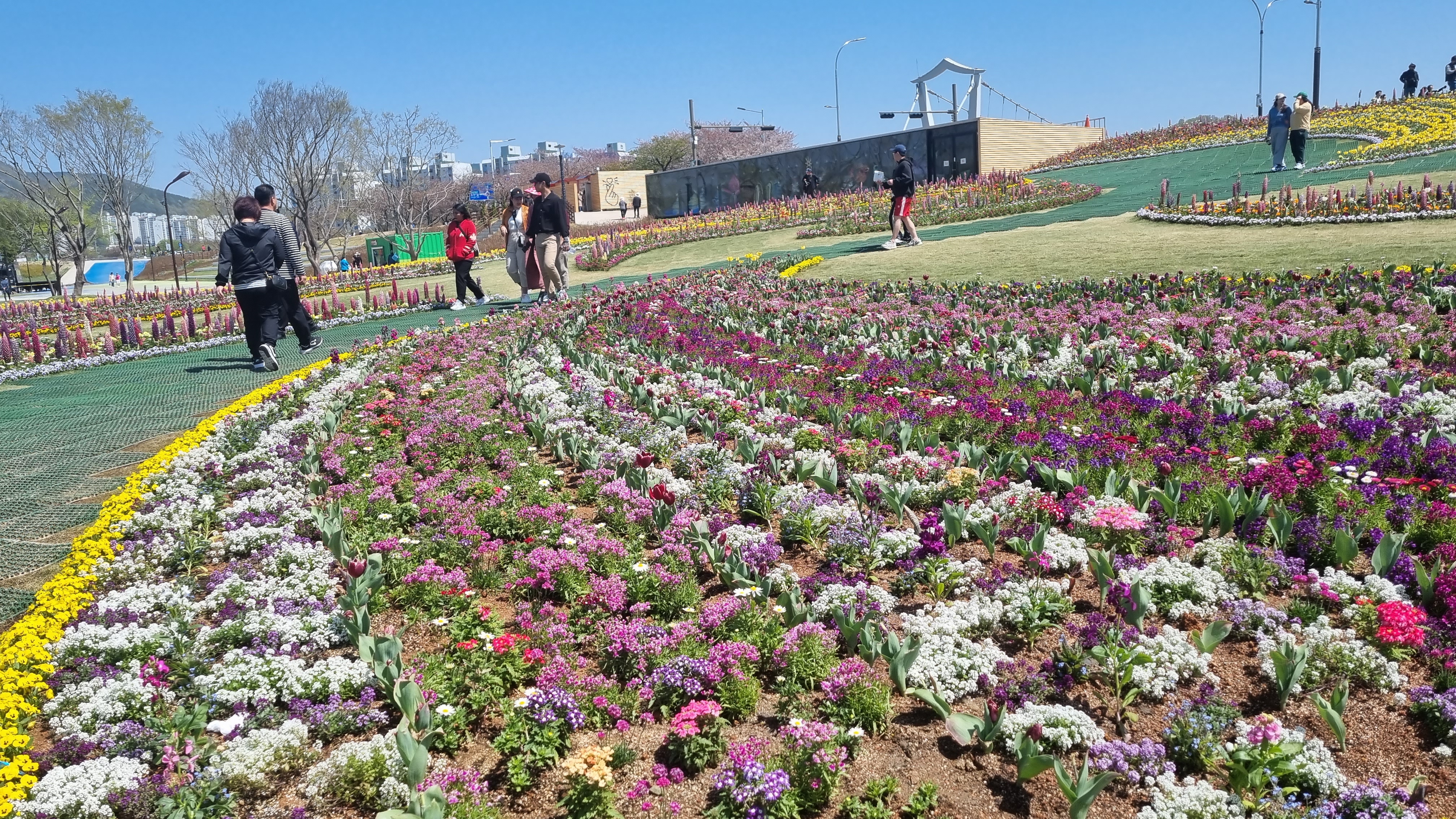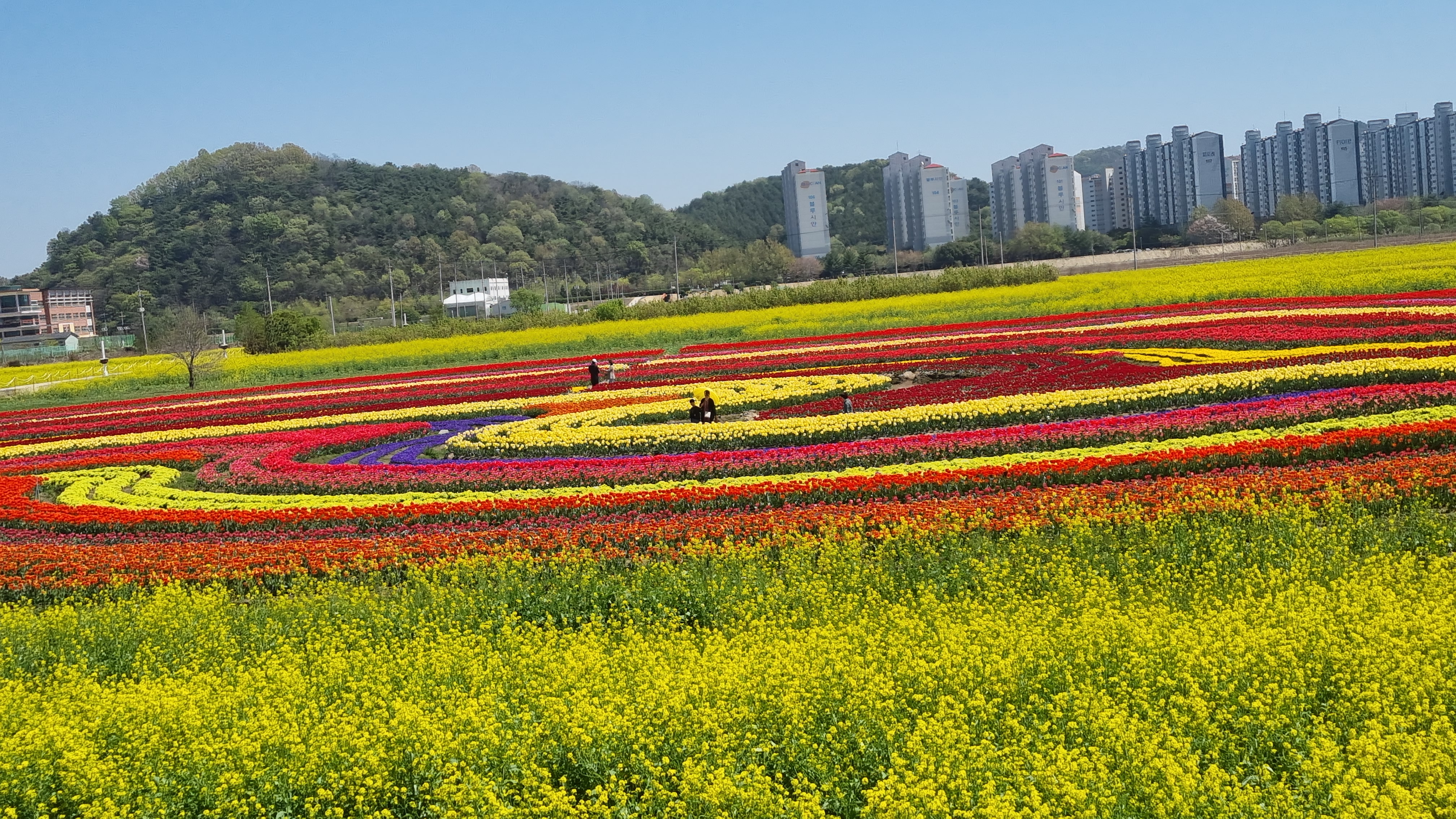 이곳은 동천 출렁다리를 건너오면 풍덕지구인데 현재 꽃밭을 꾸며 놓았습니다. 워낙 넓게 되어 있어 감탄사가 절로 나오고 꽃길 사이로 걸을 수 있도록 편리하게 산책로가 설치되어 애들이나 노인들도 편하게 구경할 수 있습니다.