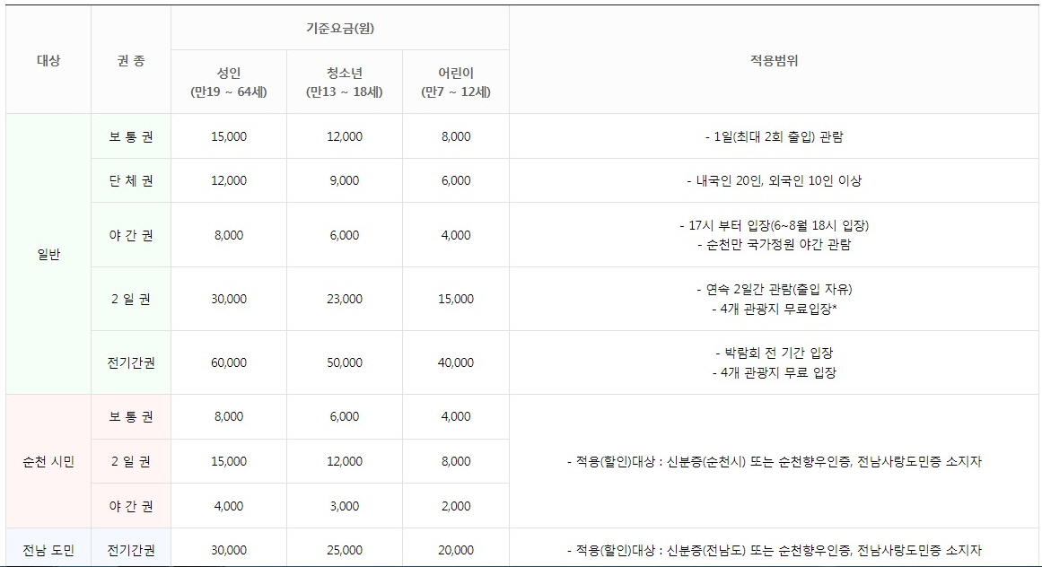 위 사진은 입장료 입인데 가격이 성인기준 일반권이 15,000입니다. 단체권이나 야간권등 다양하고 저렴한 입장료도 있으니 잘 선택하시고 입장권으로 순천시내에서 10% 또는 5% 할인된 식당이나 기타 업소들이 많이 있으니 미리 알아보시는 것이 좋습니다.