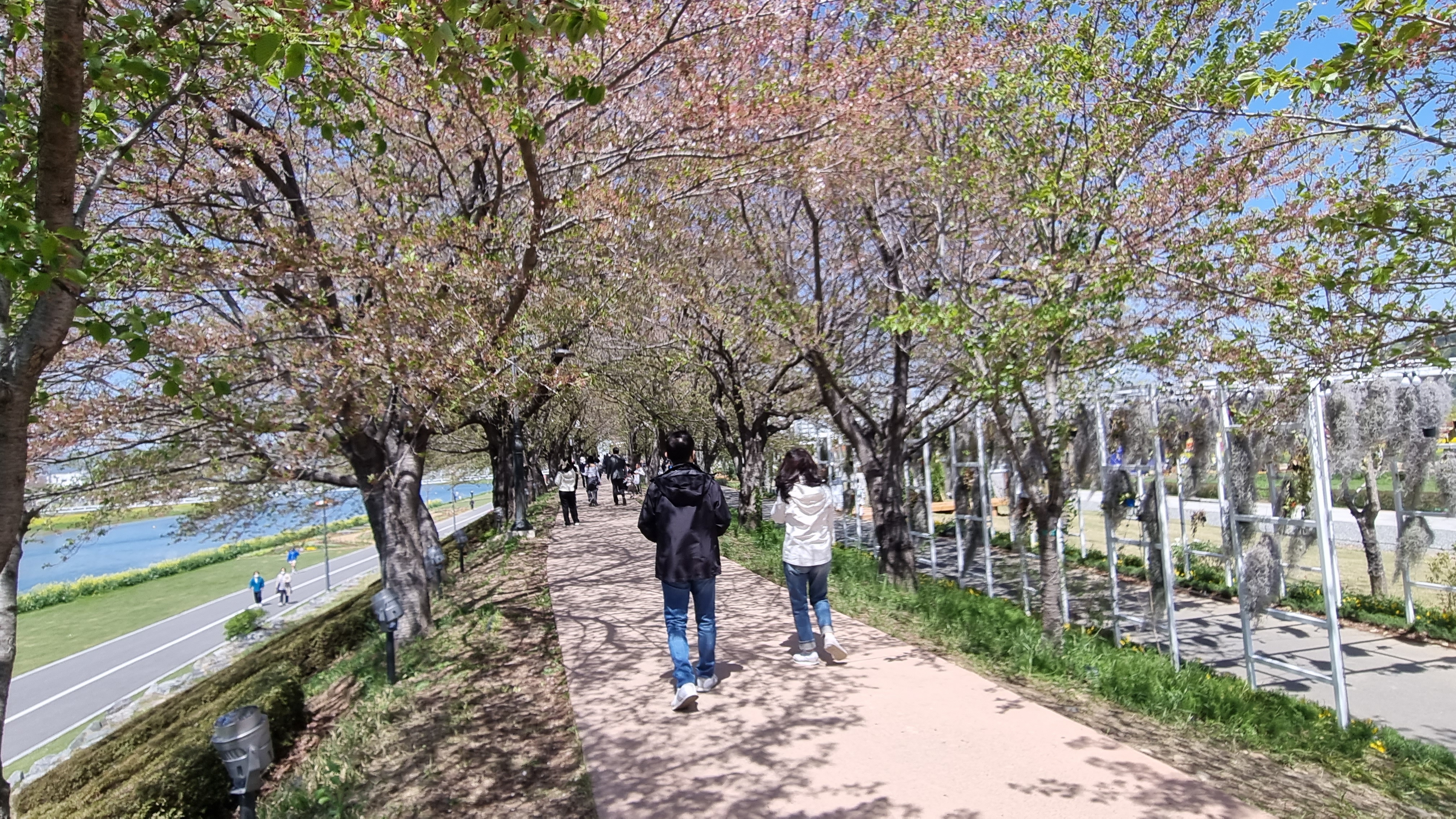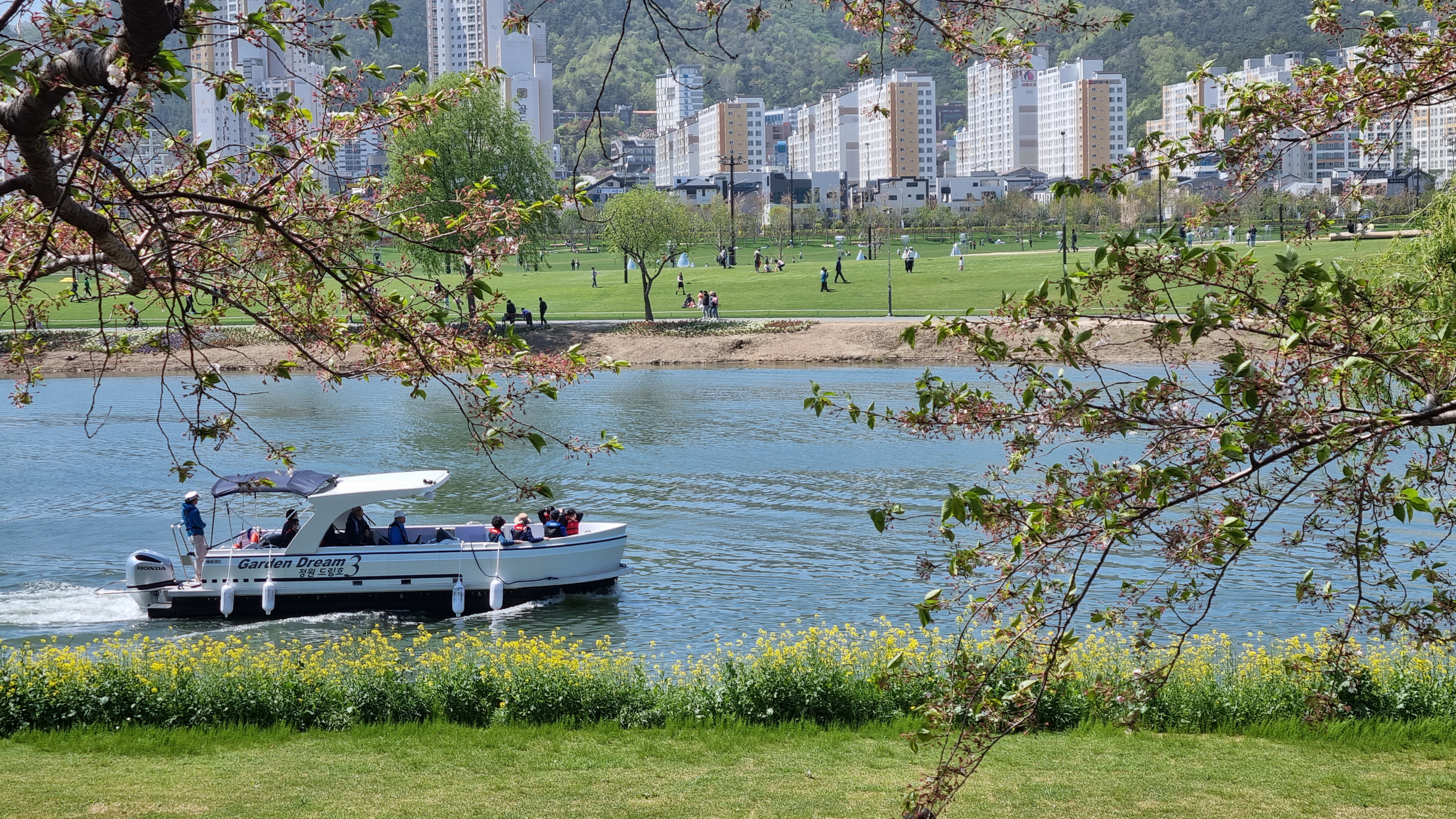 동천 산책로인데 벚꽃이 져는데도 아름답네요. 옆으로는 동천이 아담하게 있으면서 유람선도 지나가고 오른쪽에는 꽃밭이고 가족들과 걸으면 좋은 코스입니다.