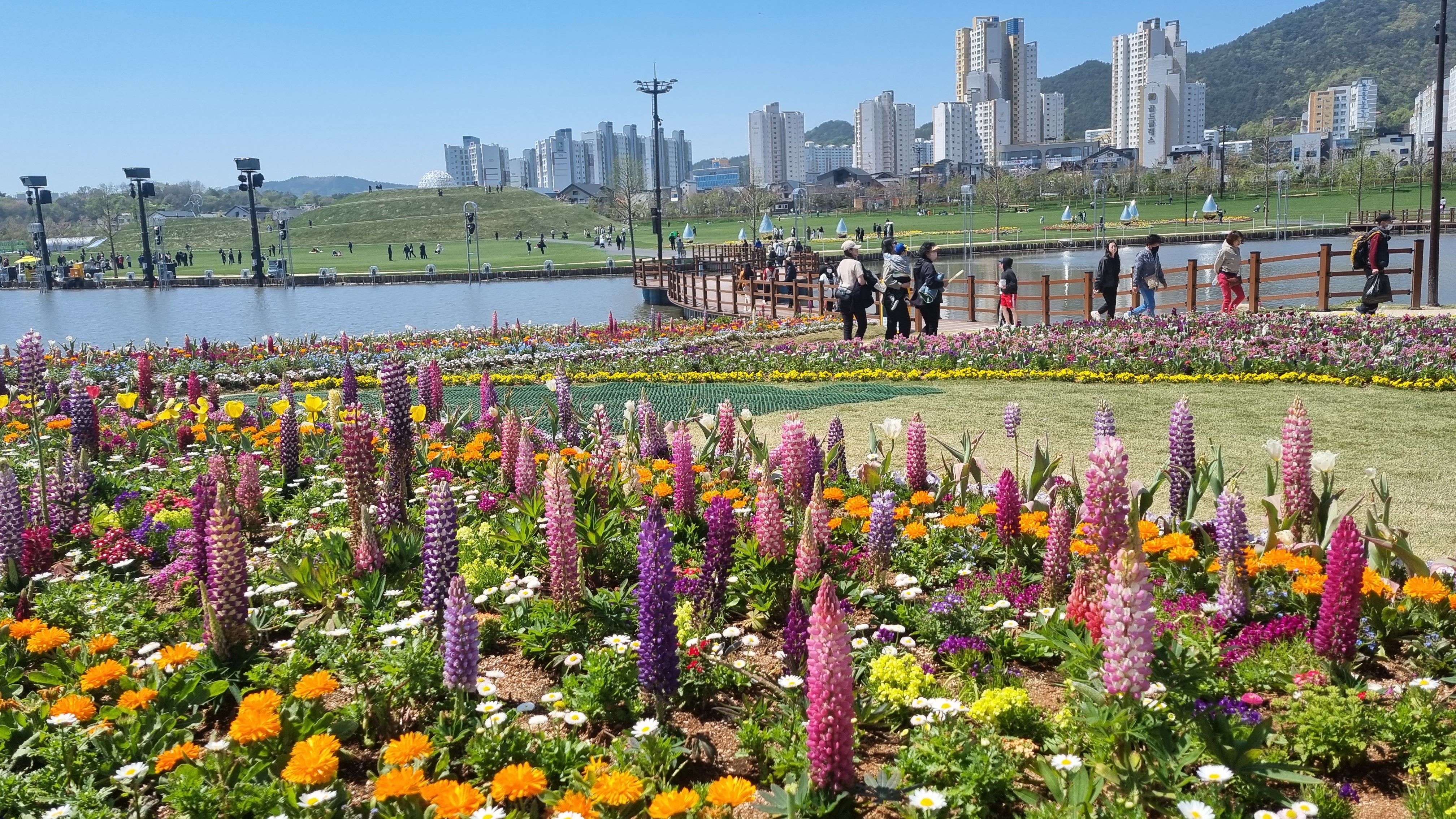 이곳도 화려한 꽃동산이 드넓게 환상적으로 되어 있고 호수공원과 동천의 경치를 느끼면서 유람선이 지나가는 코스이기도 합니다.
