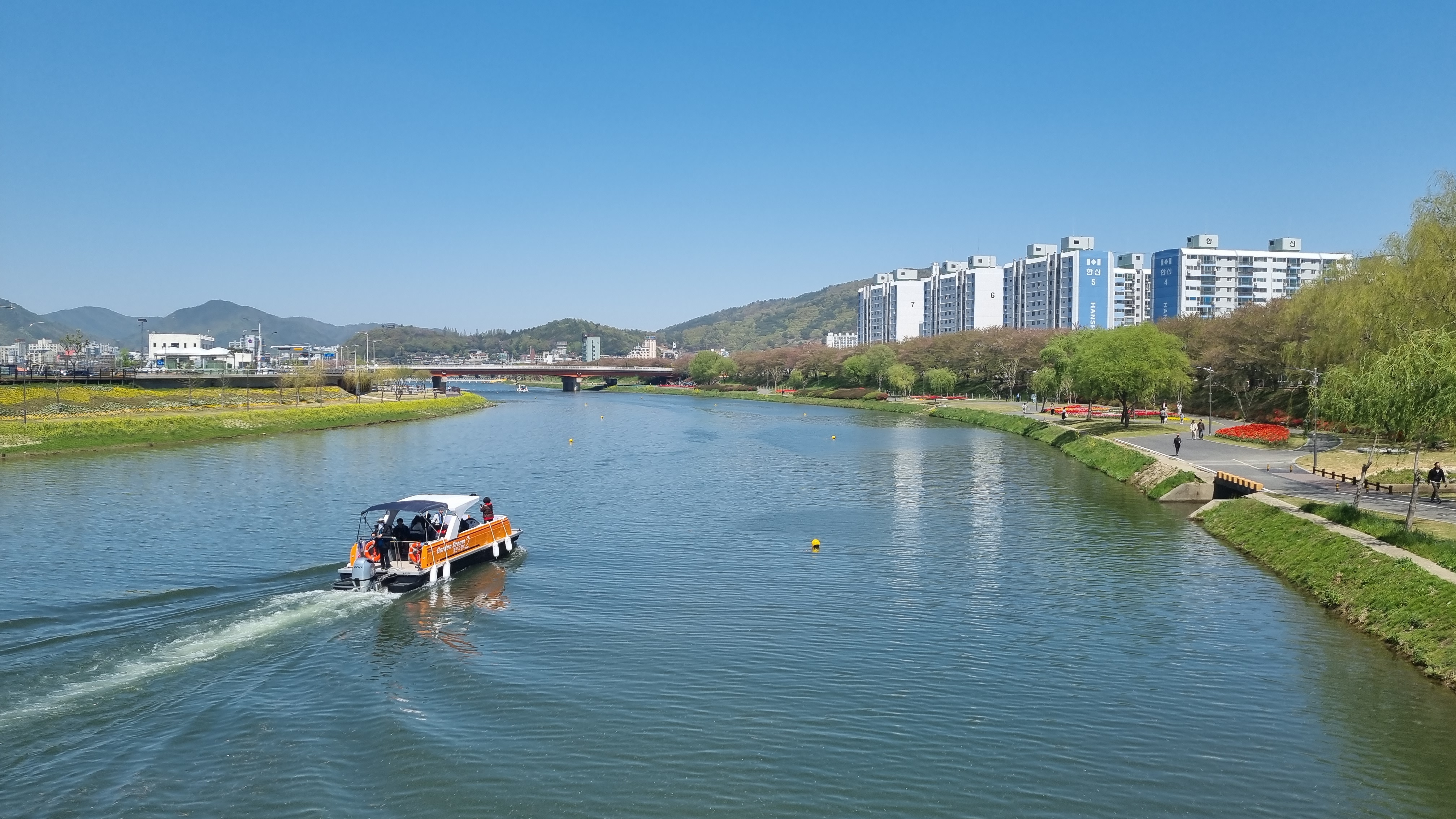 동천이 큰 하천은 아니지만 그래도 작은 유람선이 다닐 정도는 되며 그린아일랜드 광장과 주변 경치가 어우러져 생각보다 괜찮습니다.