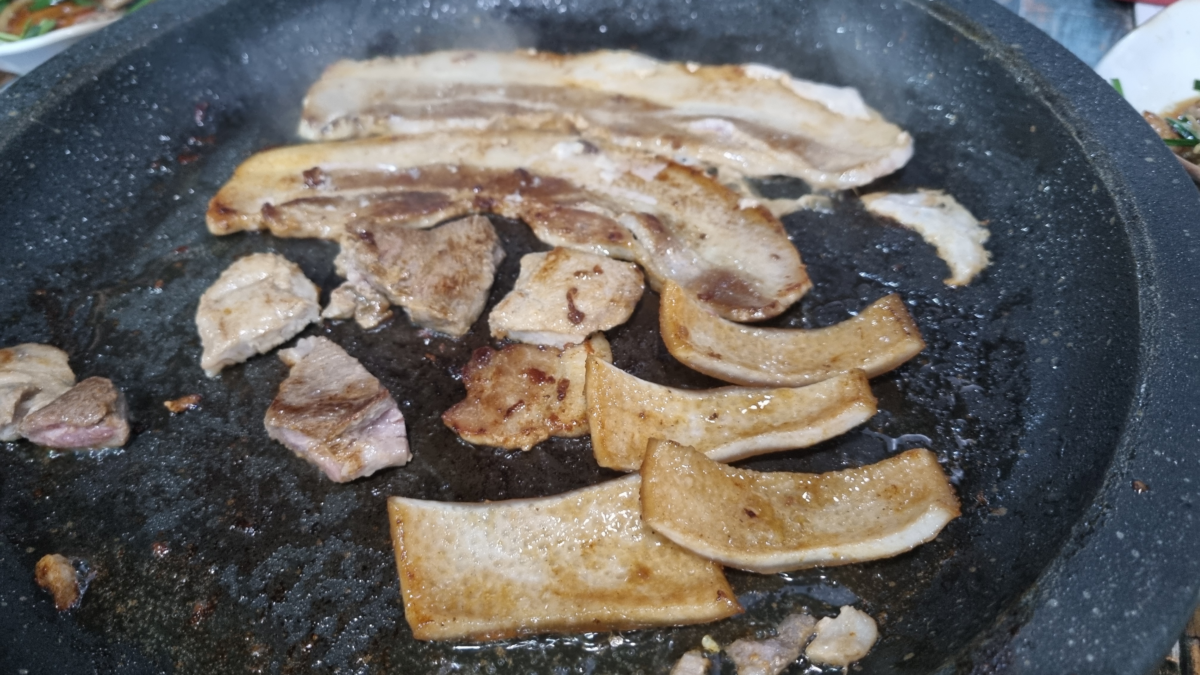 고기도 잘 구워지고 상추쌈에 마늘까지 구워 먹은데 일반 비싸게 먹는 삼겹살과 비슷했고 이어서 돼지껍질을 구워 먹는데 이것도 별비로 쫀득하여 먹을 만합니다.