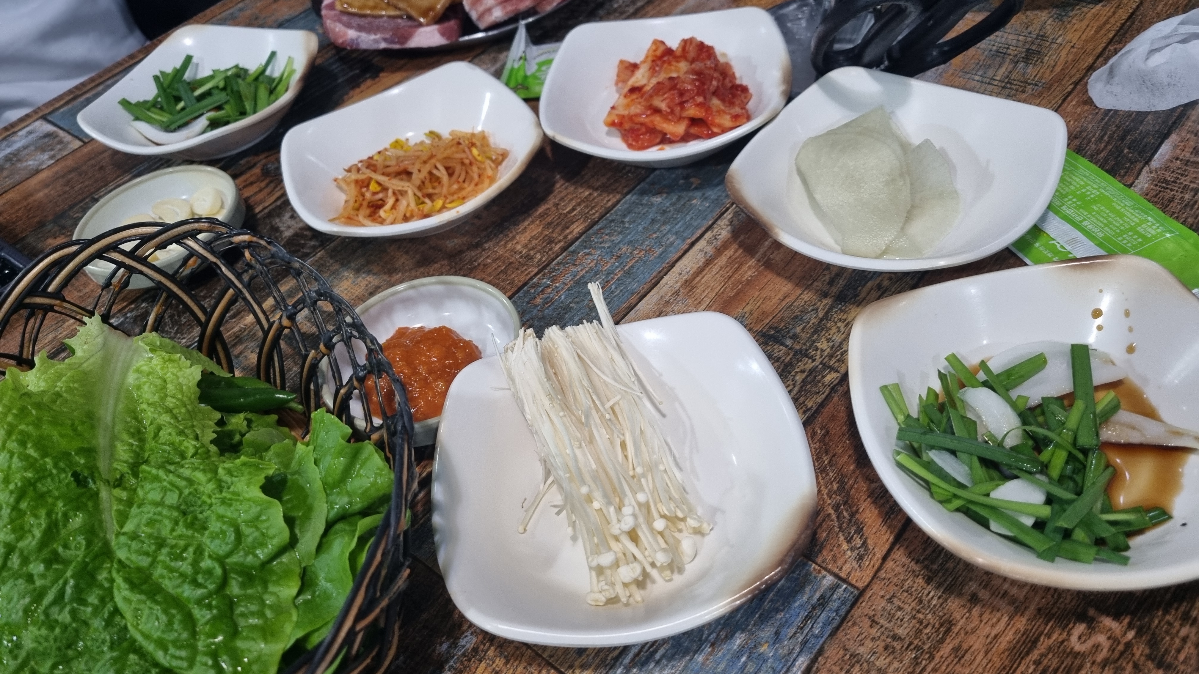 식당으로 들어와 자리에 앉으면 처음에는 불판과 기본반찬을 세팅하여 줍니다. 이후로는 모든 것이 셀프인데 나중에 후식메뉴만 종업원에게 주문하는 형식입니다.