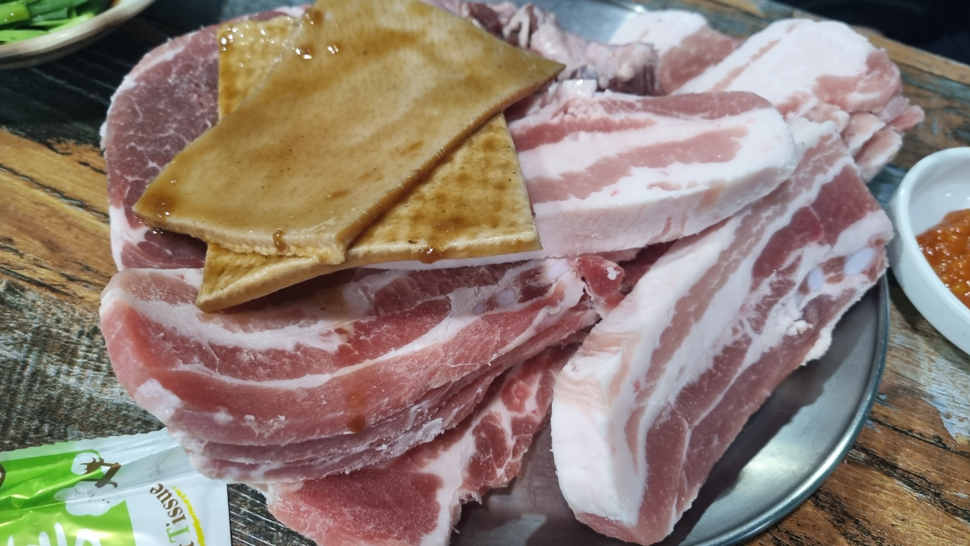 고기는 삼겹살 얇은 것 두꺼운 것, 목살 살치살, 갈배기살이 있으며 돼지주물럭도 있고 껍데기등이 있으며 닭갈비도 양념과 간장양념이 있고 오리불고기도 있을 때가 있습니다.