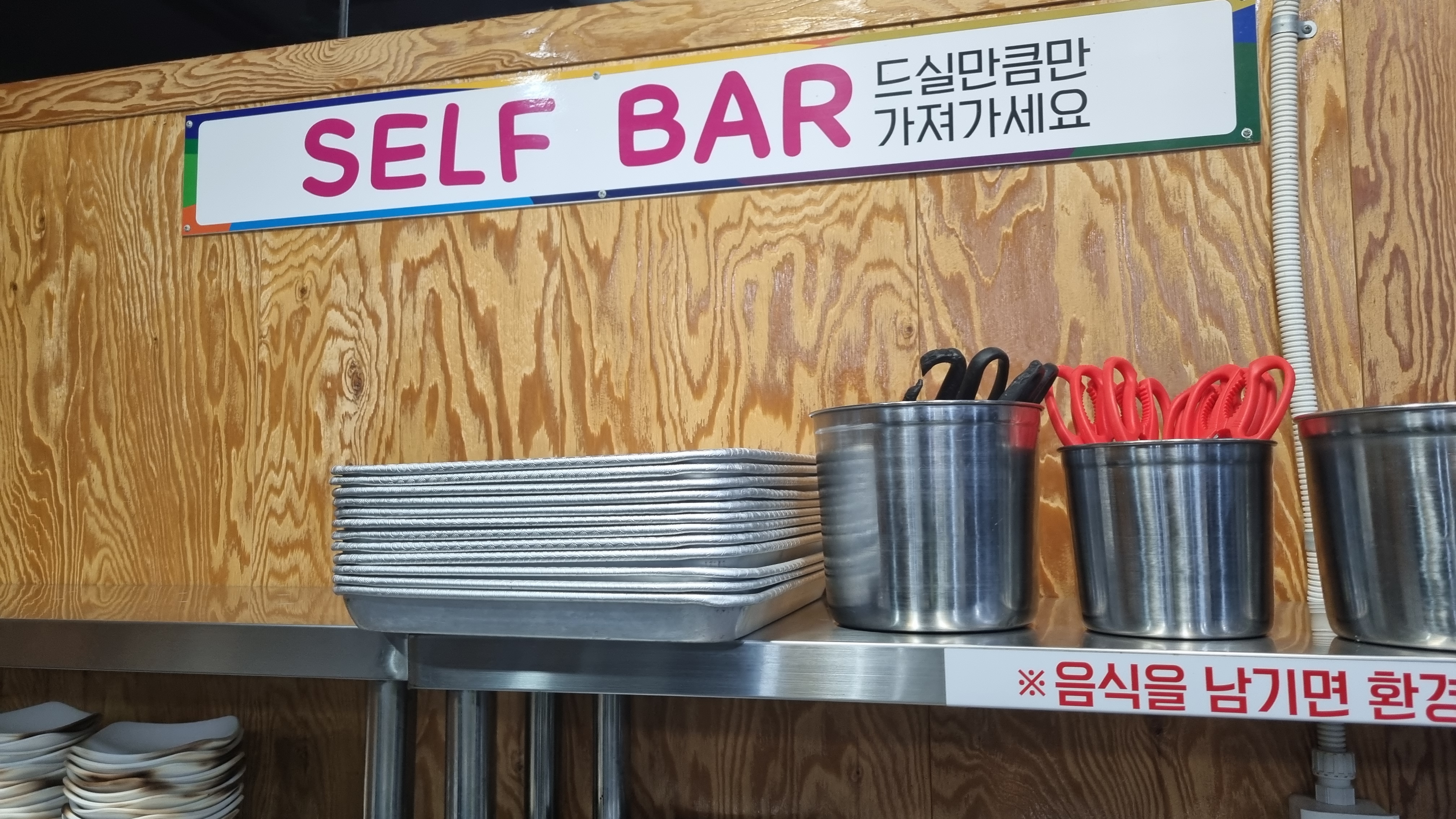 셀프바가 있는데 여기서 본인들이 원하는 만큼 직접 가져가서 드시면 됩니다. 고기류도 많고 종류도 많으면 다른 반찬이나 음식들이 많이 있습니다.