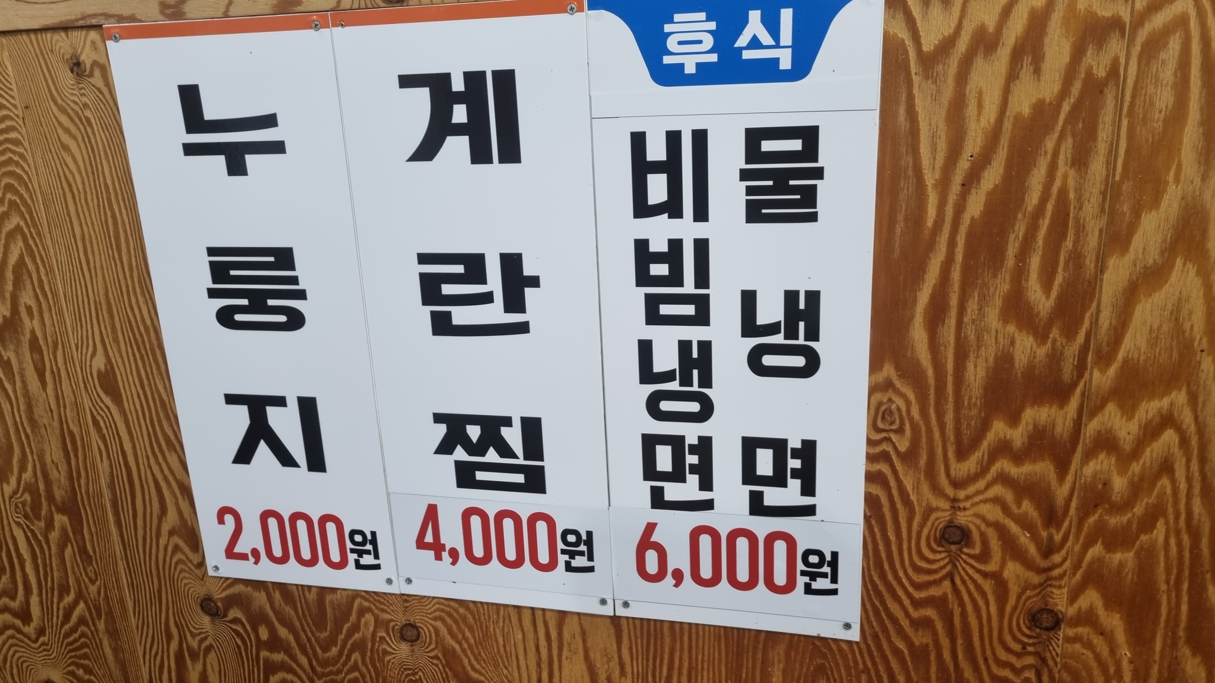 후식메뉴는 별도의 비용으로 주문해야 하는데 누룽지 2천 원, 계란찜 4천 원 , 물냉면 비빔냉변이 6천 원에 판매되고 있습니다. 또한 팥빙수도 2천 원에 판매됩니다.