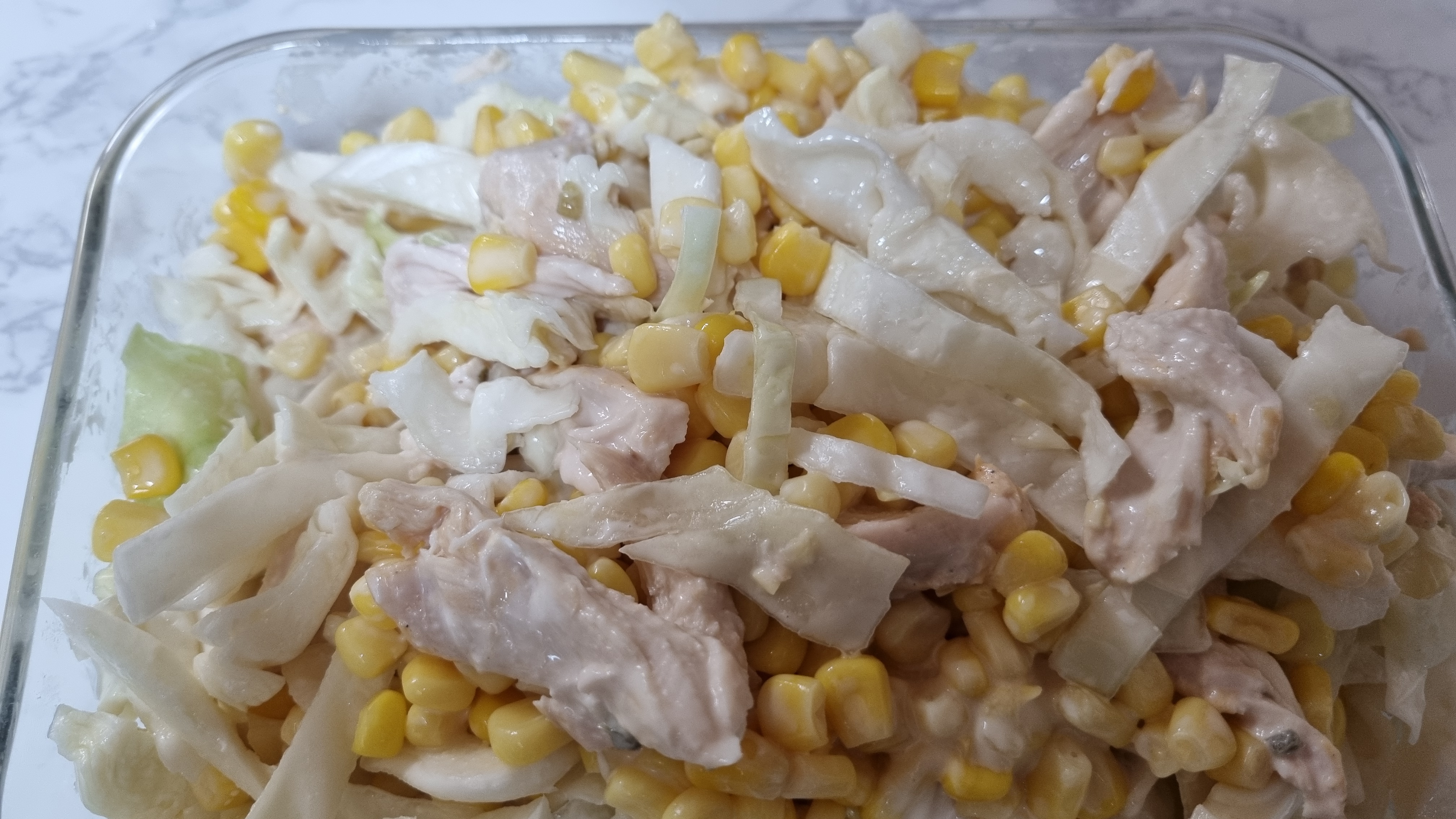 저의 경우 양배추 어른 주먹만 한 양의 2개와 스위트콘 100g 닭가슴살 2개 260g을 넣어서 잘 혼합하여 먹었는데 아주 맛있고 만족스러웠습니다.