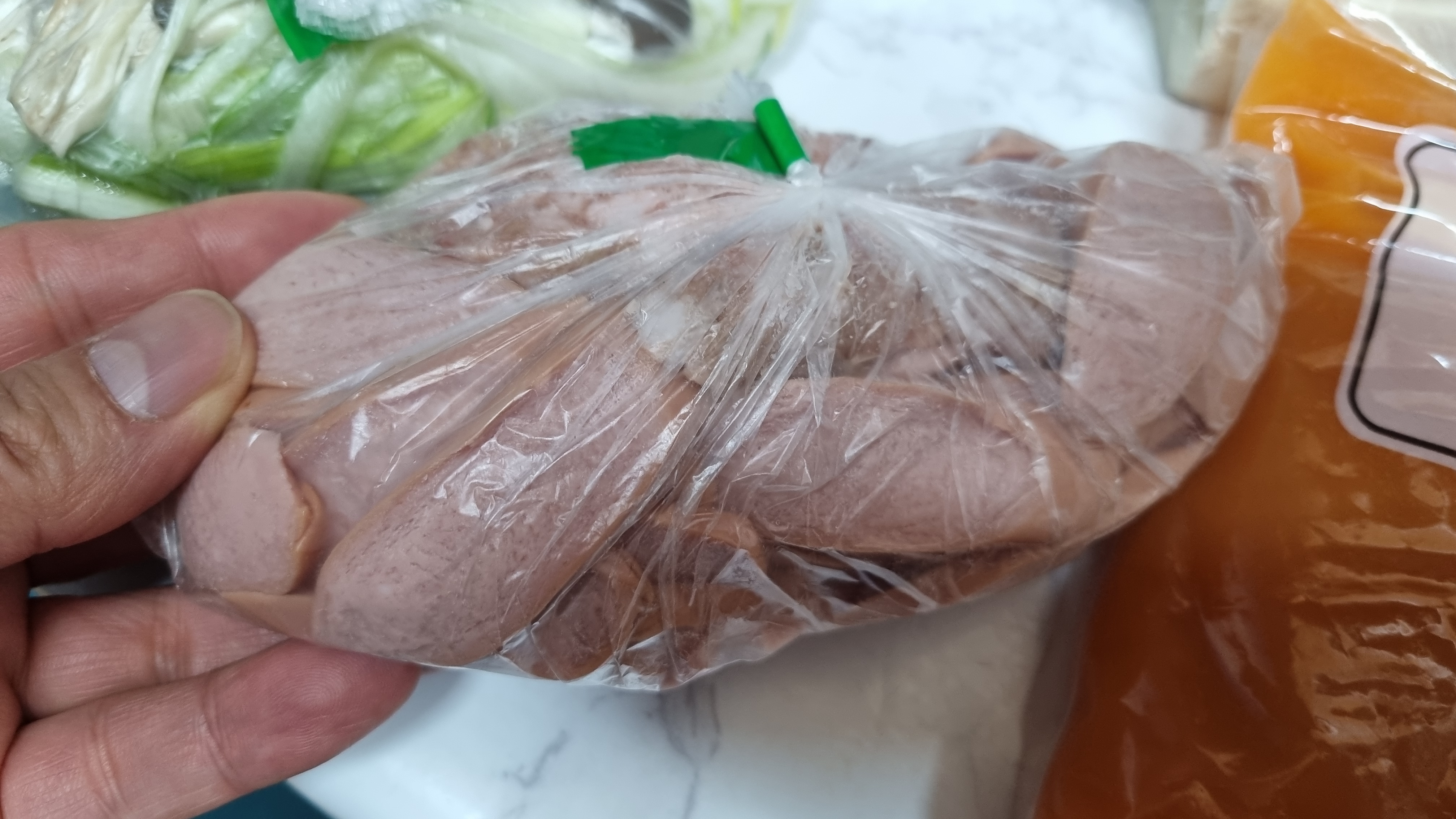왼쪽 사진이 육수이며 잘 포장되어 조리법까지 잘 설명서가 나와있습니다. 오른쪽은 소시지인데 저렇게 일반 식품용 비늘봉투에 담아져 있습니다.