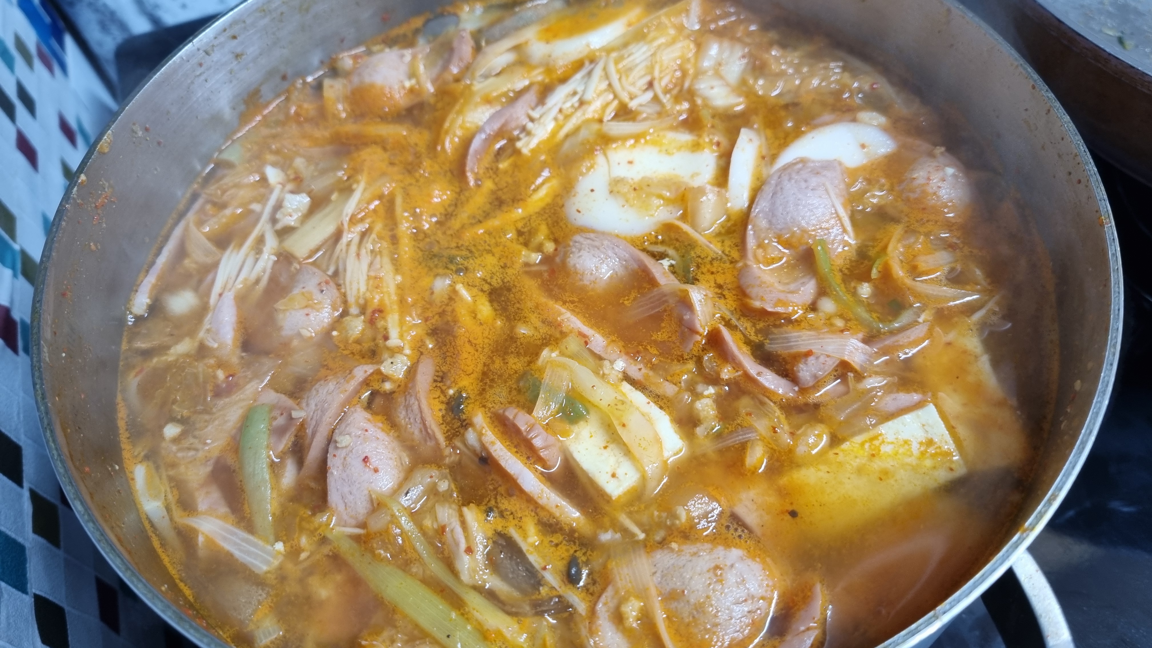 이렇게 물도 추가하고 기타 추가한 재료들을 모두 넣은 모습니다. 김치와 스팸을 넣어 별도로 간을 맞추기 위해 추가로 넣은 양념은 없습니다.