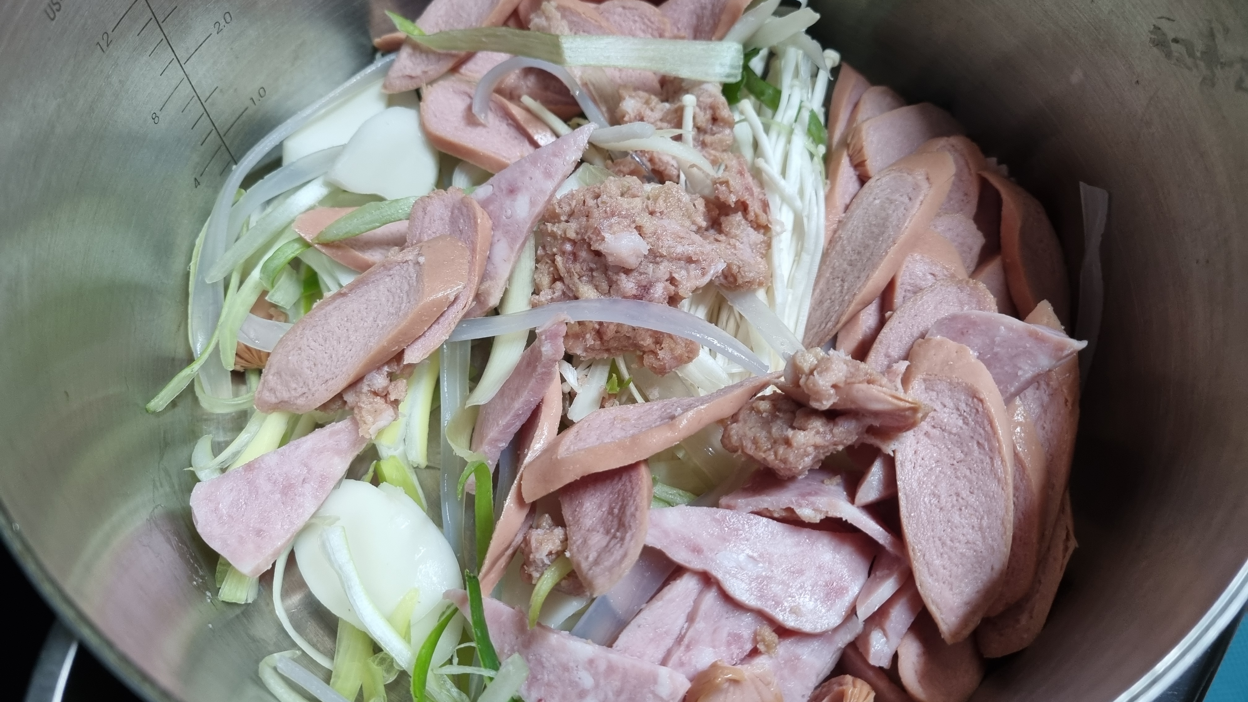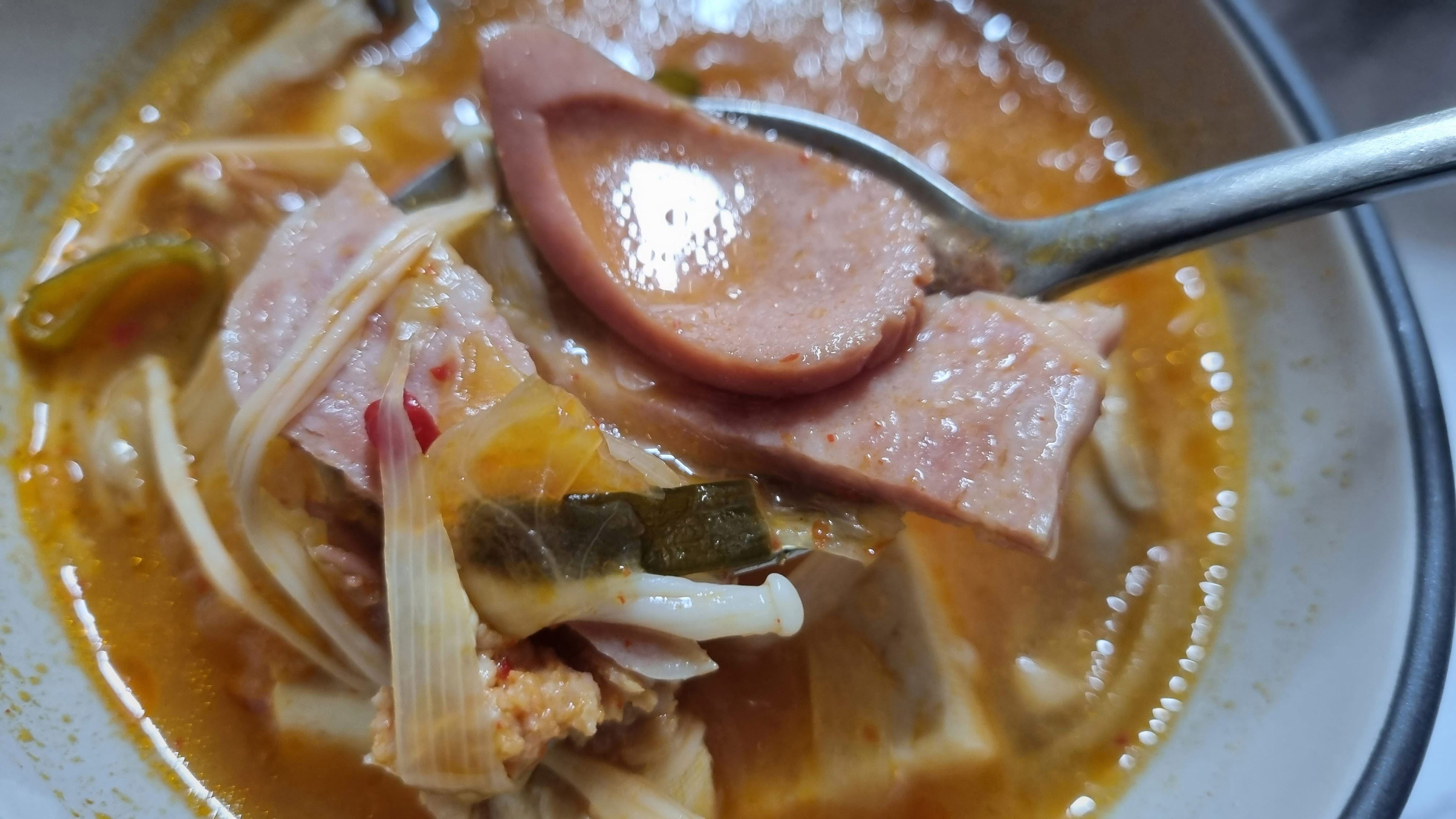 집에 소시지나 햄이 없어 스팸을 한 개 넣었는데 이것도 정말 맛있고 간이 짭짤하게 되어 있어 국물 요리 만들 때 넣으면 잘 어울리는 재료입니다.