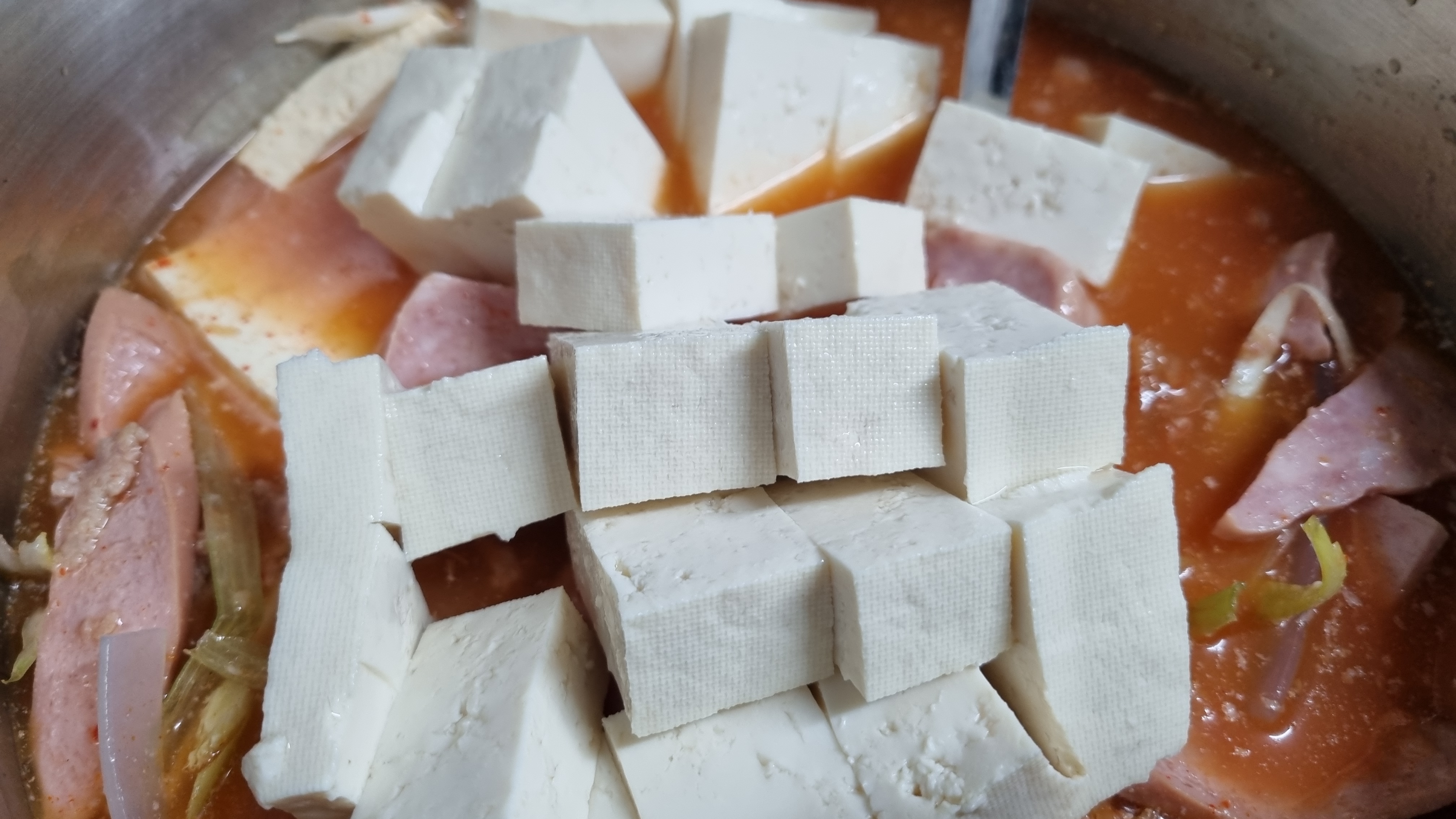 먼저 김치를 적당량으로 추가했습니다. 두부도 집에 한모 있어 모두 넣었는데 크기는 본인이 먹기 편한 기준으로 썰어 넣으면 좋습니다.