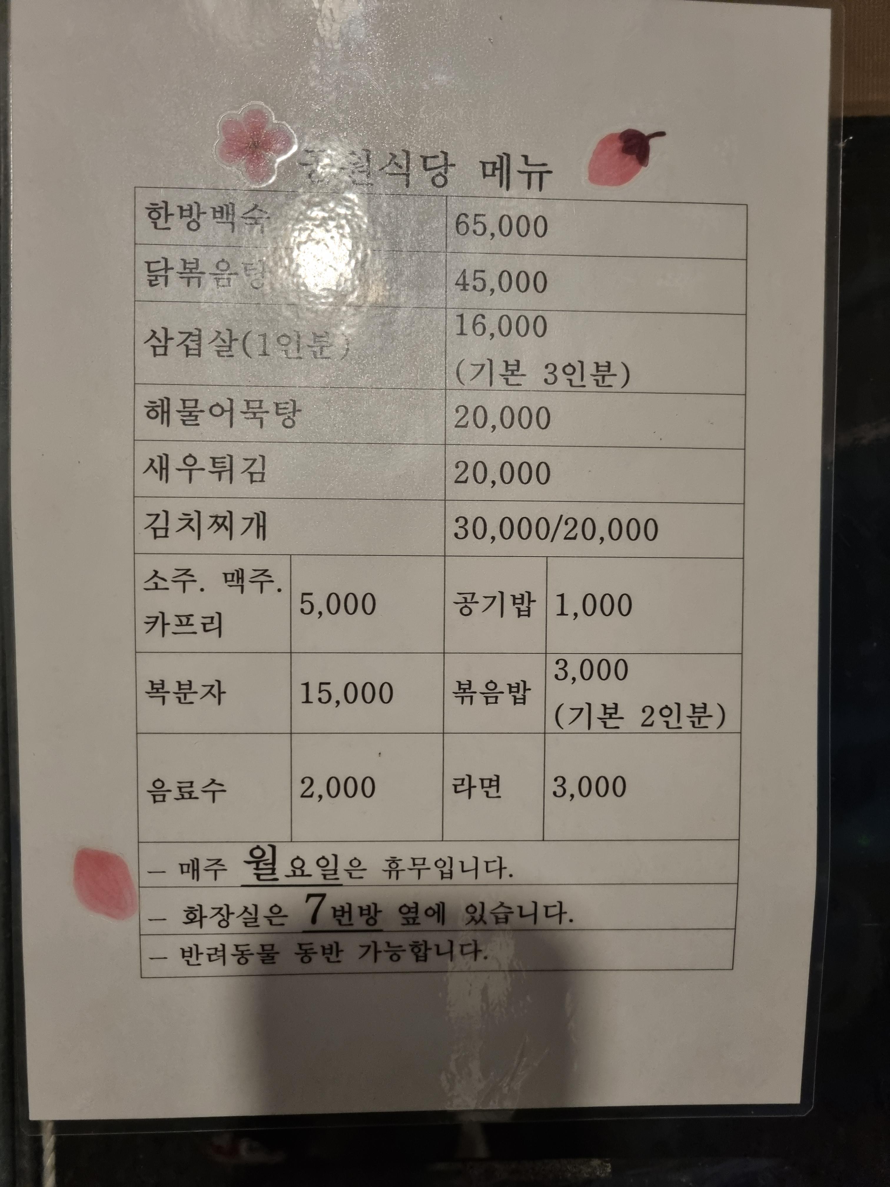 한방백숙은 가격이 65,000원인데 미리 예약을 해야 시간을 절약할 수 있으며 삼겹살은 1인분에 16,000원인데 양은 정확히 모르겠습니다.