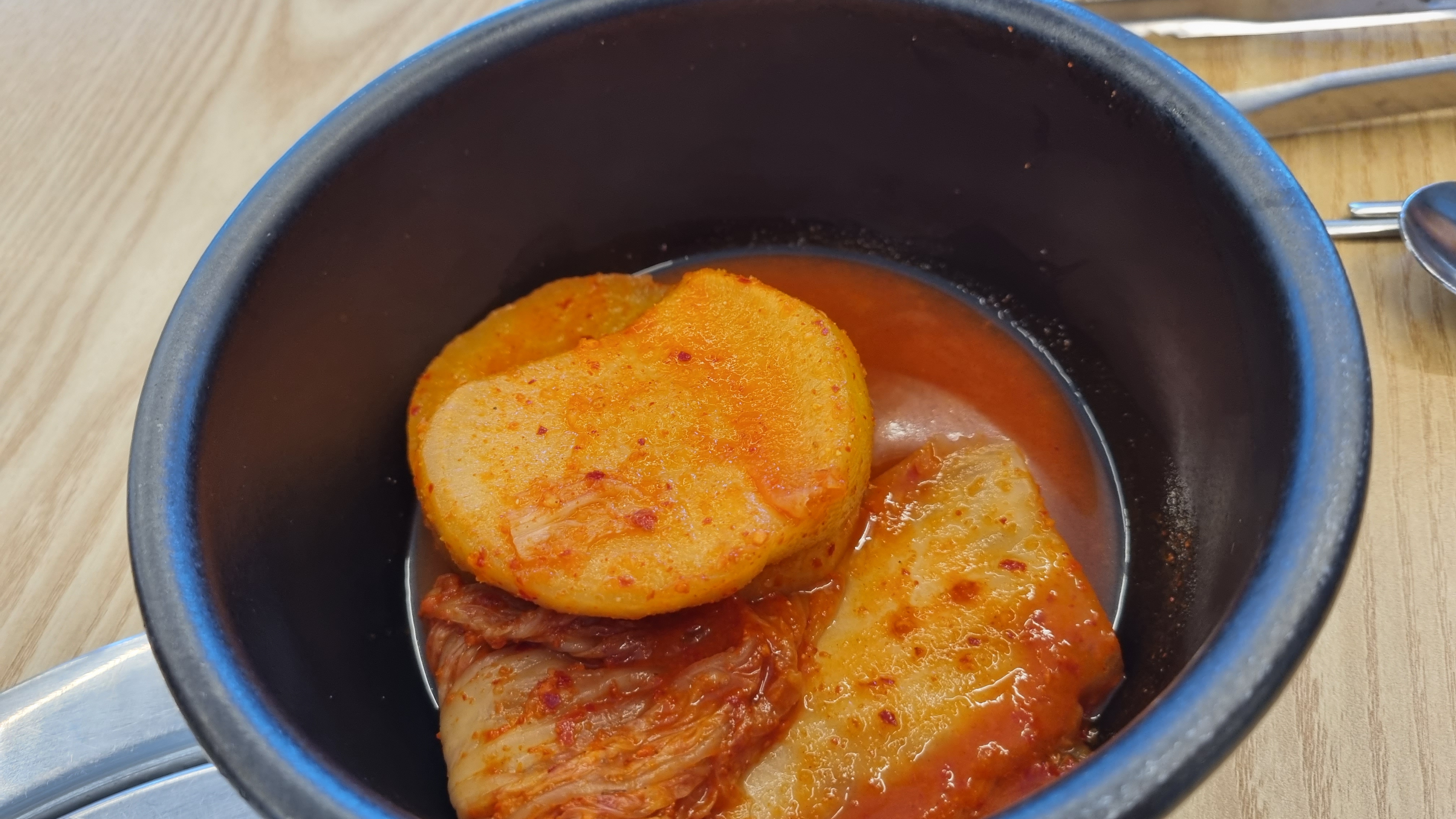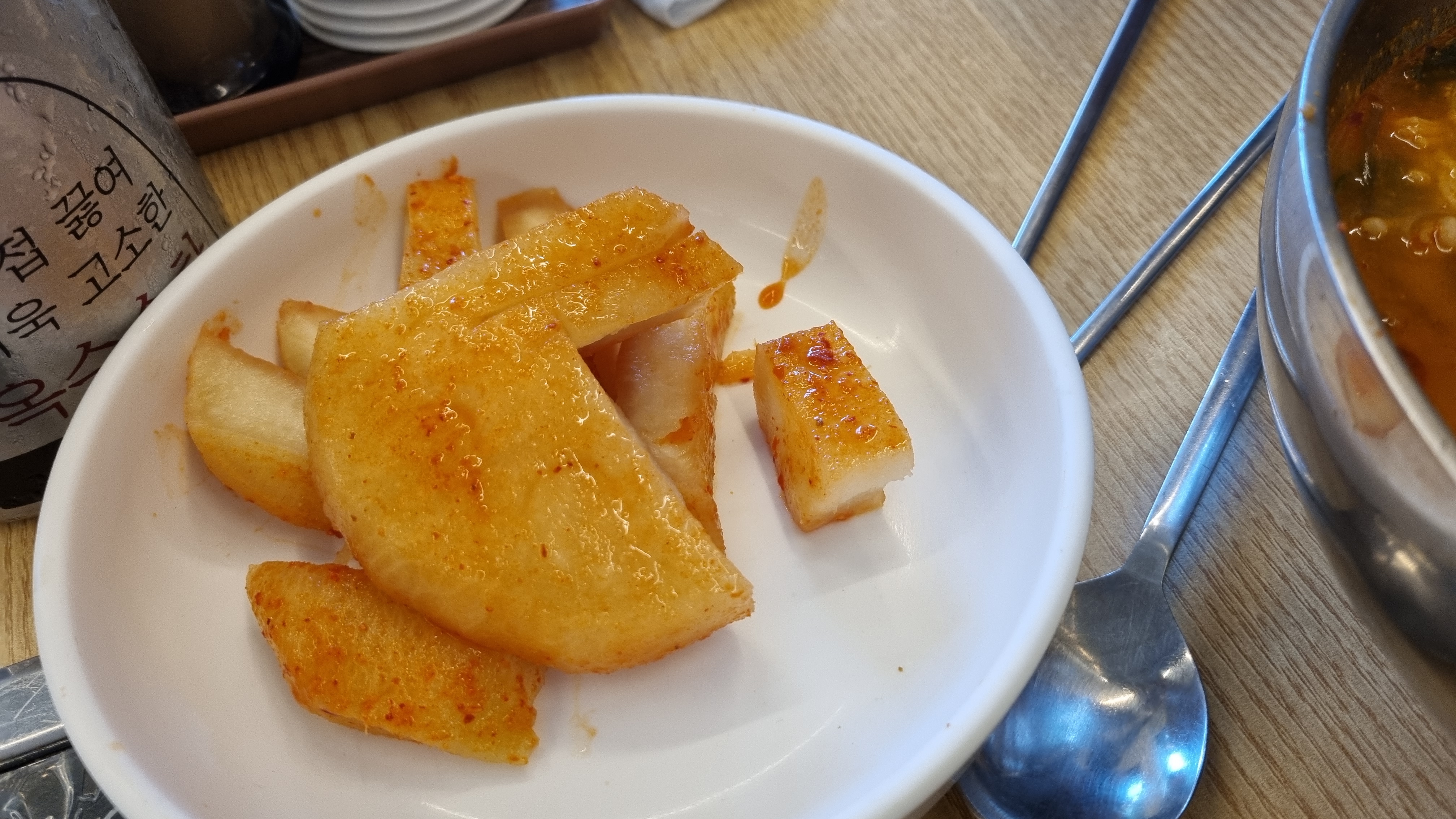 반찬은 딱 한 가지 나오는데 바로 무김치입니다. 뚝배기에 담겨 미리 테이블에 세팅되어 있는데 배추김치도 있는 듯한데 그날 우리는 무김치만 있었습니다.