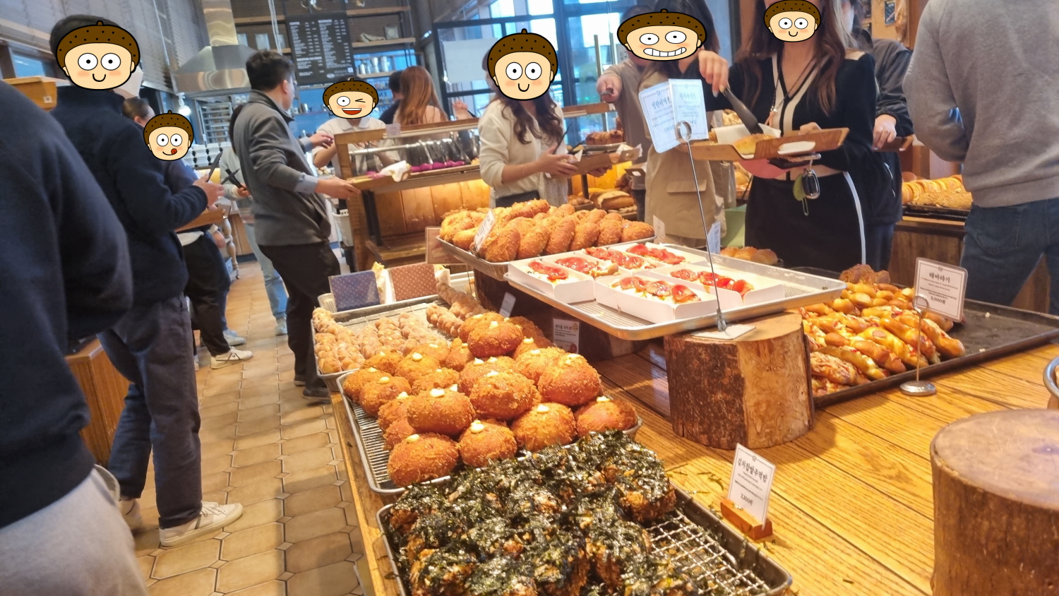 평일 오후에 방문했는데도 사람이 엄청 많았습니다. 갓 구운 향기로운 빵이 많이 있었으며 사람이 많아 움직임이 자유롭지 않은 상태에서 빵을 구경하고 골랐습니다.