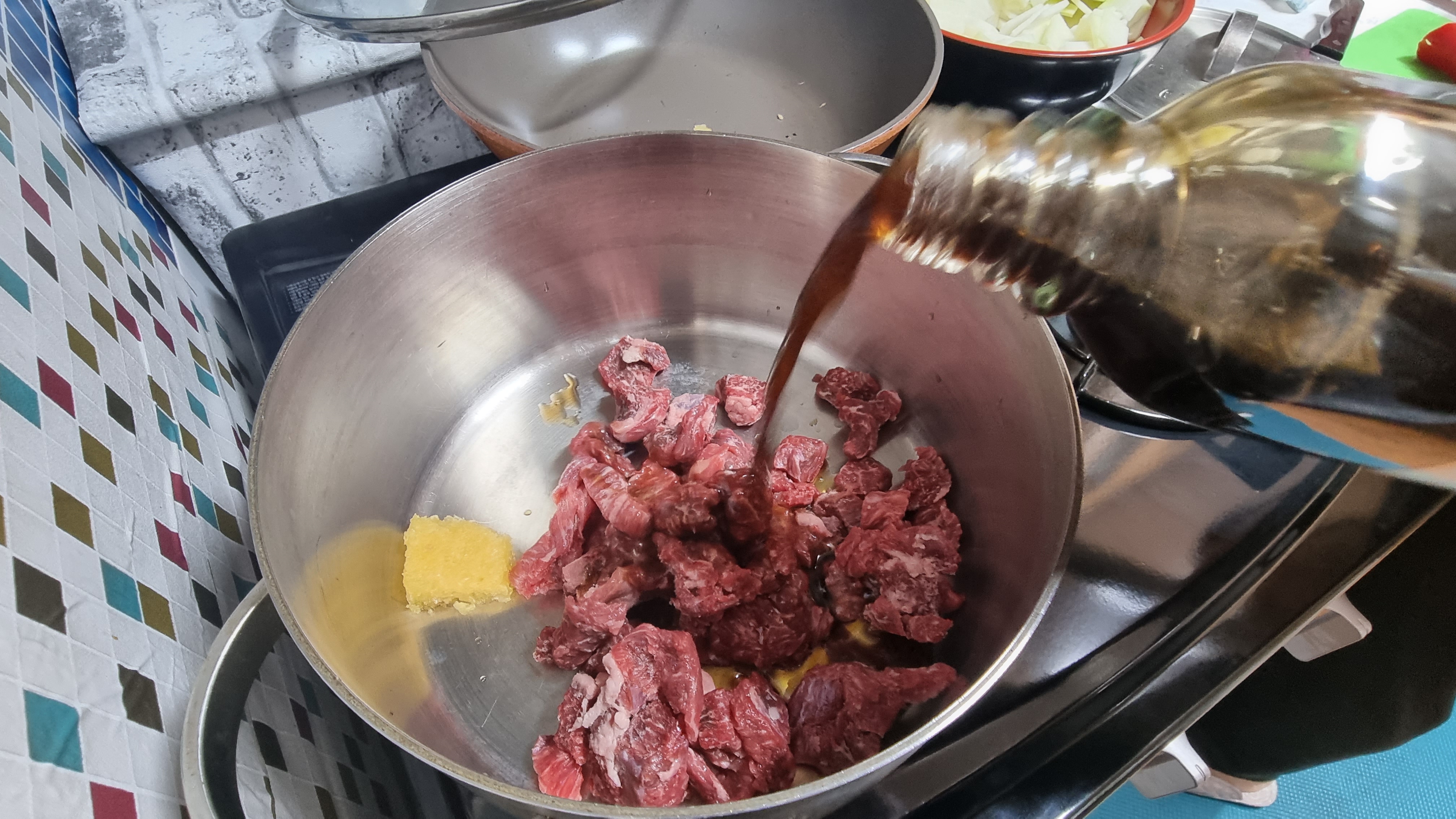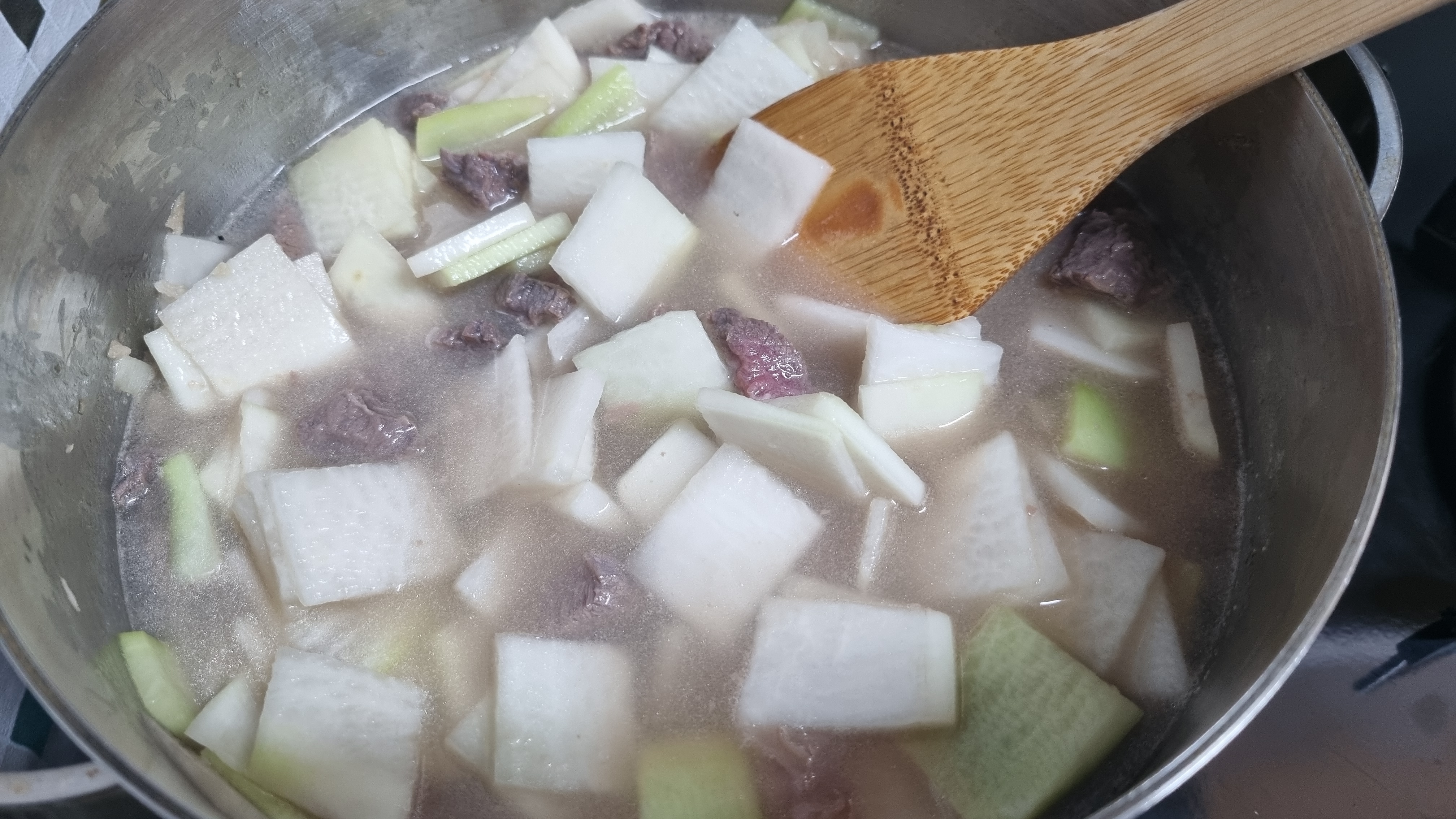 일반적으로 물의 양은 무와 소고기의 양을 고려하여 결정하는데 냄비의 재료보다 더 높이 부으면 되겠습니다.