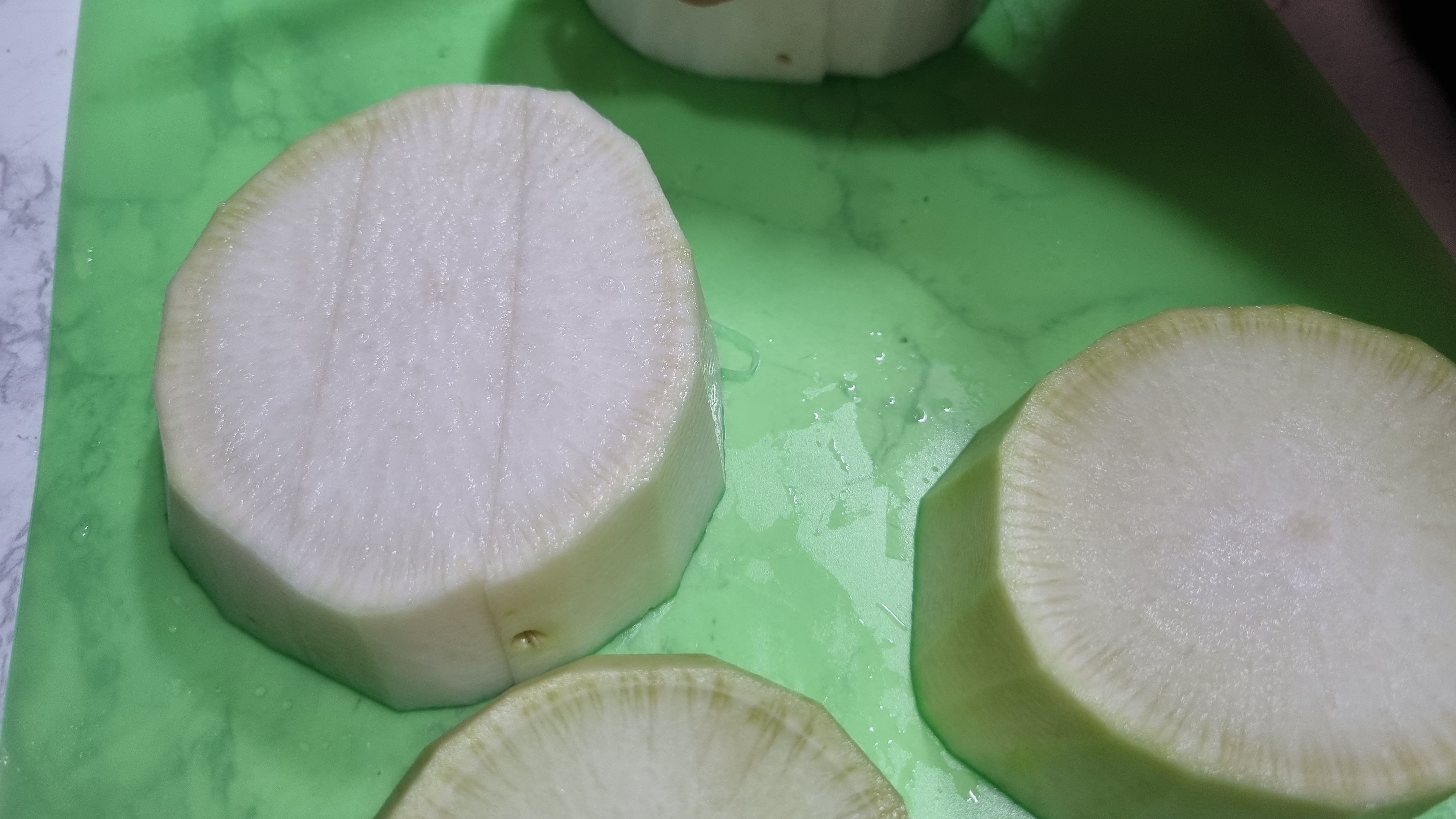 무의 양은 어른 큰 주먹만한 정도로 준비했으며 이전에 사용하고 남은 것입니다. 본인들의 취향에 따라먹기 좋은 크기로 잘라 준비합니다.