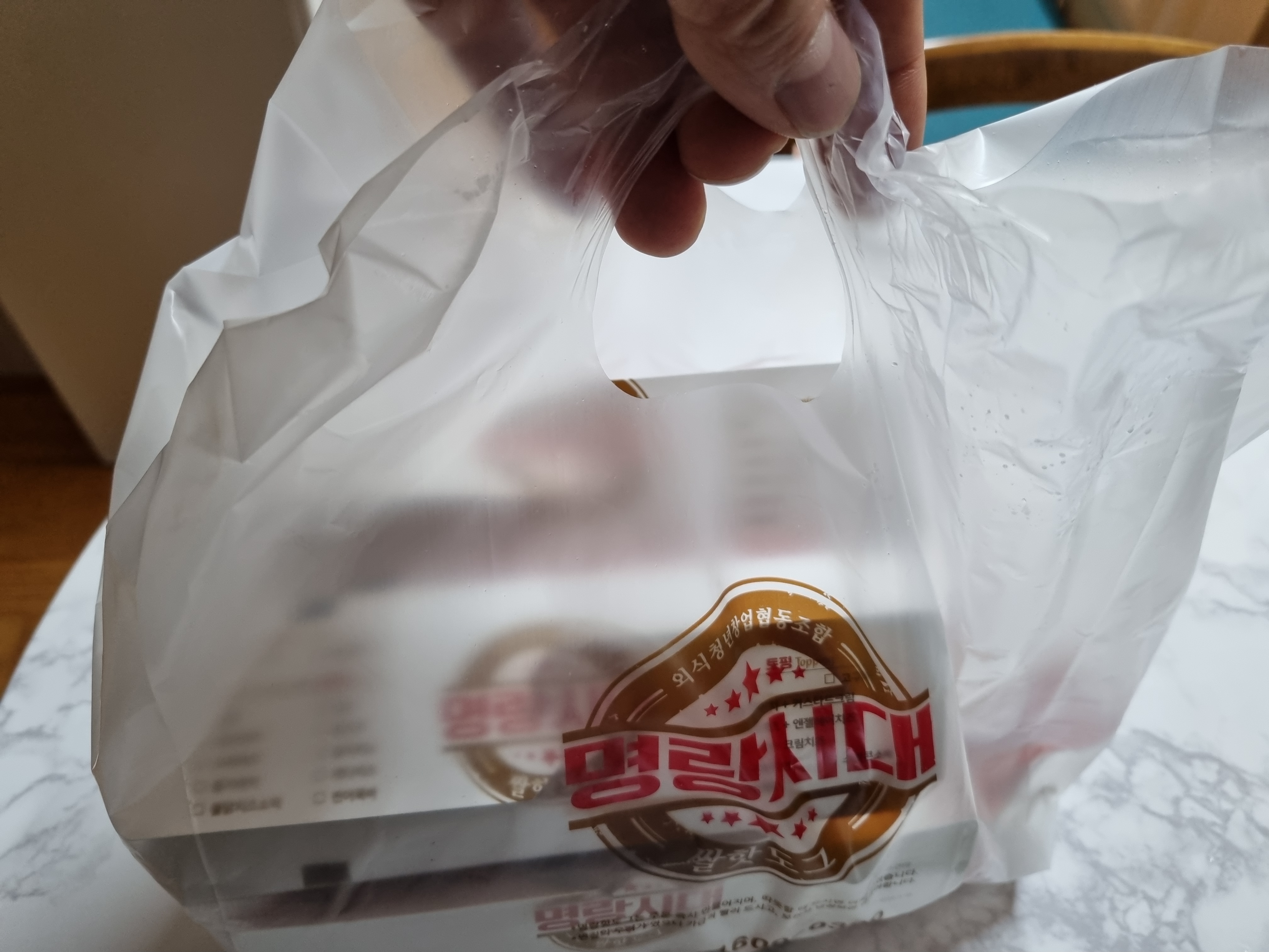 이렇게 개별로 종이박스로 포장을 하고 다시 봉투에 넣어 포장을 하여 손님에게 전달 됩니다. 만약 매장에서 드시면 이렇게 포장을 안 하고 바로 소스나 설탕을 발라 드시며 됩니다.