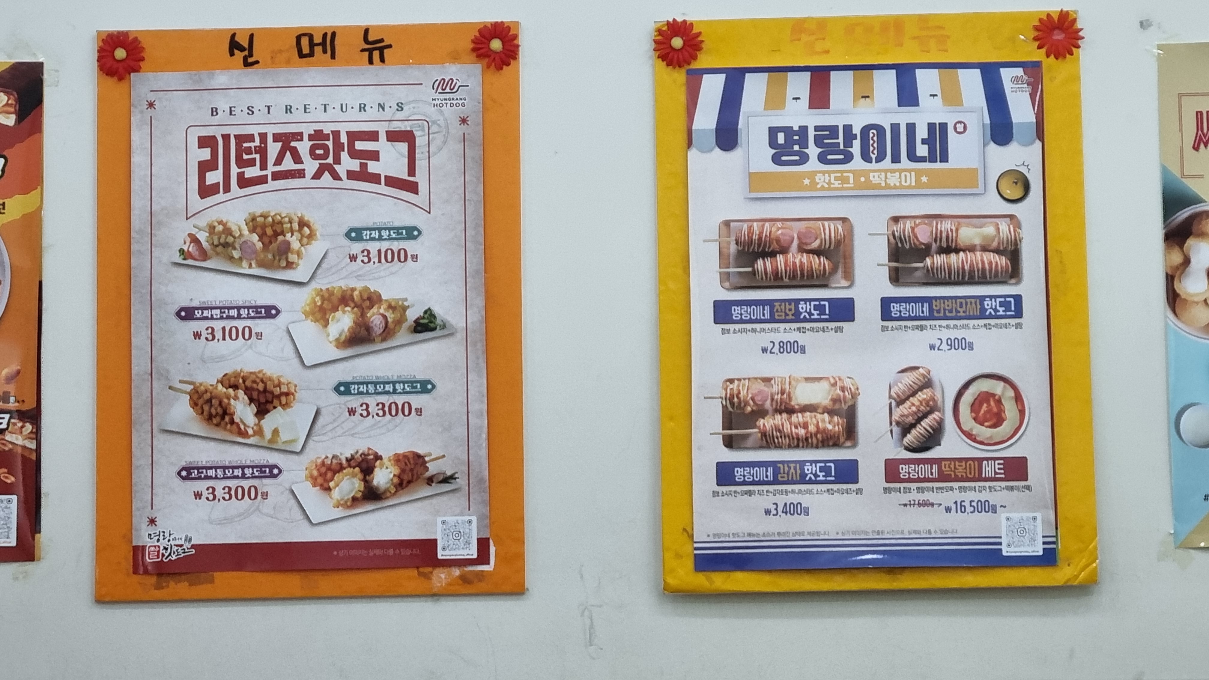 가격은 2,500원에서 최고값이 3,400원까지 있습니다. 감자핫도그가 3,100원이며 제일 저렴한 메뉴는 명랑핫도그로 1,800원입니다.