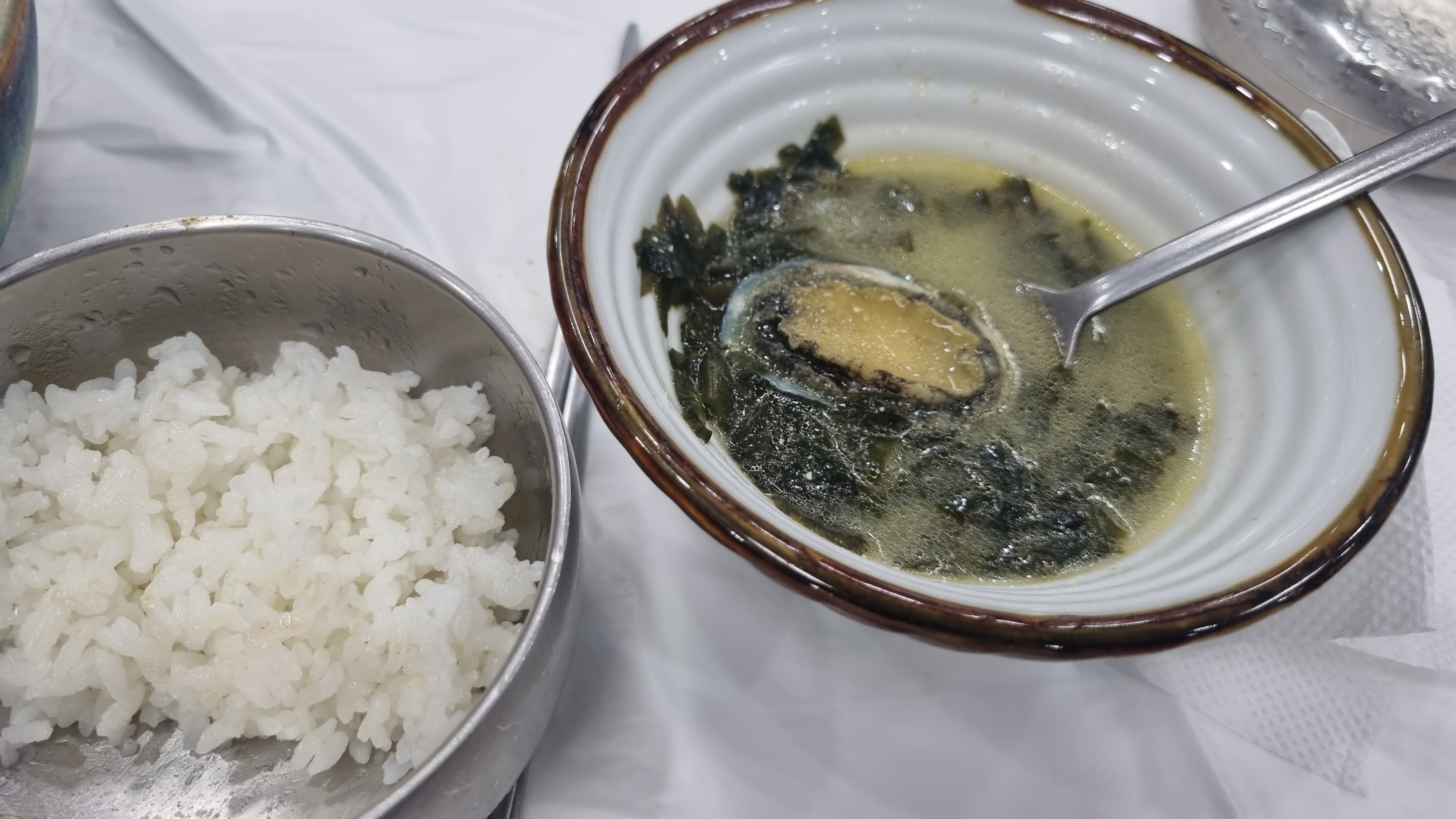 마지막으로 공깃밥과 전복미역국을 먹었습니다. 사진으로 보이듯이 전복이 한 개 있습니다. 개별접시에 조금씩 덜어 드시면 되는데 전복이 맛이 좋습니다.
