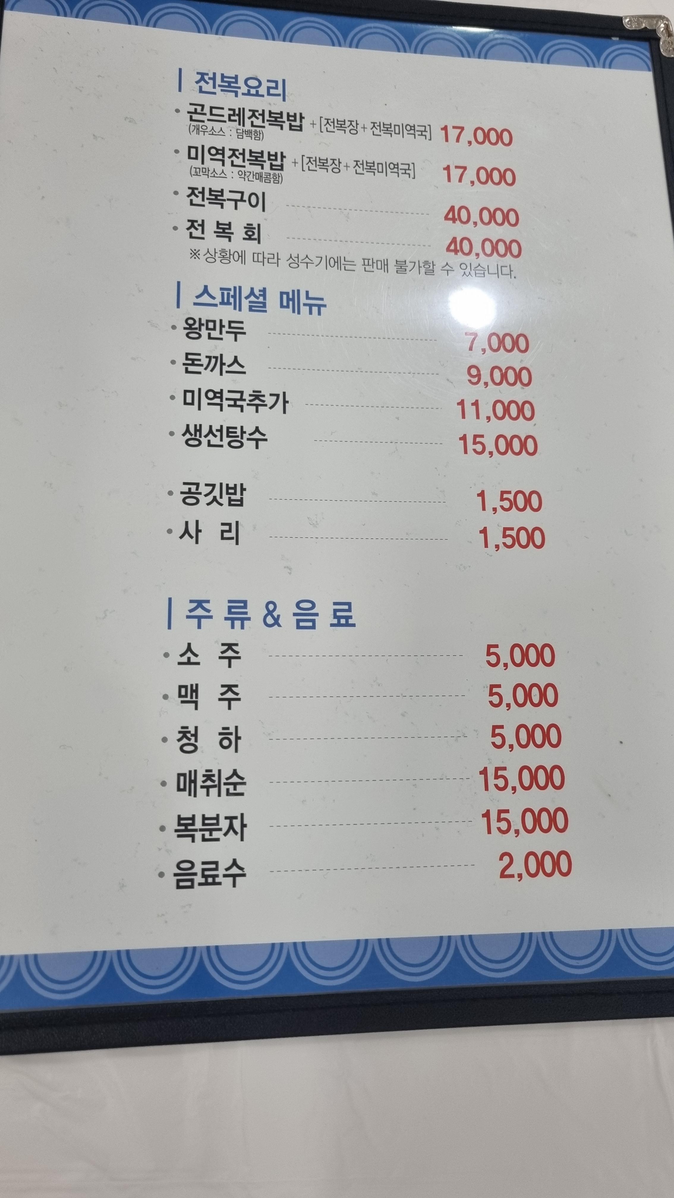 그외 메뉴로는 곤드레전복밥 17,000원이며 미역전복밥, 전복구이, 회가 판매됩니다.