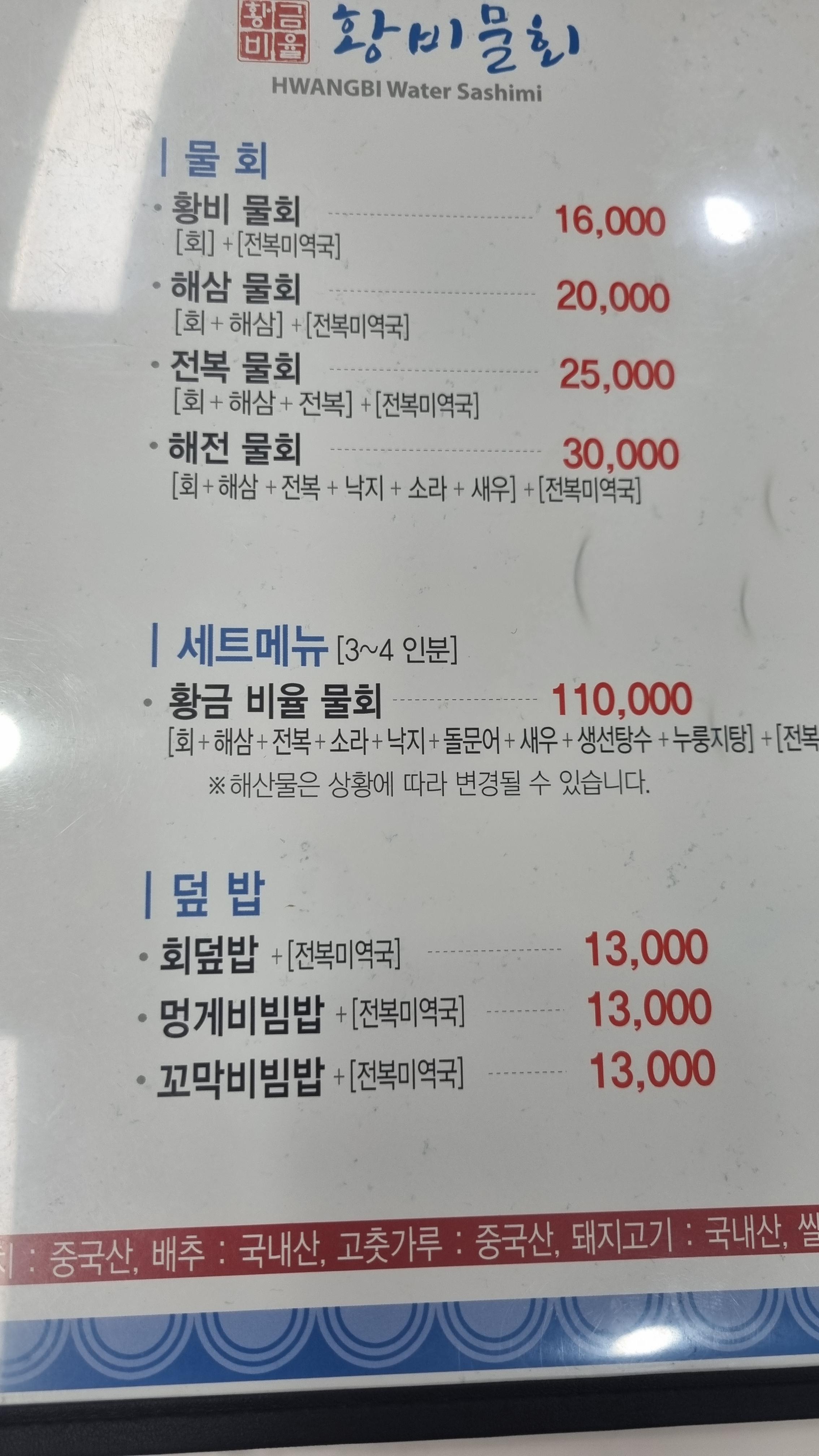 물회종류도 여러 가지가 판매되는데 기본인 황비물회가 가장 많이 찾는 메뉴입ㄴ디ㅏ. 가격이 16,000원이며 전복미역국이 함께 따라 나옵니다.