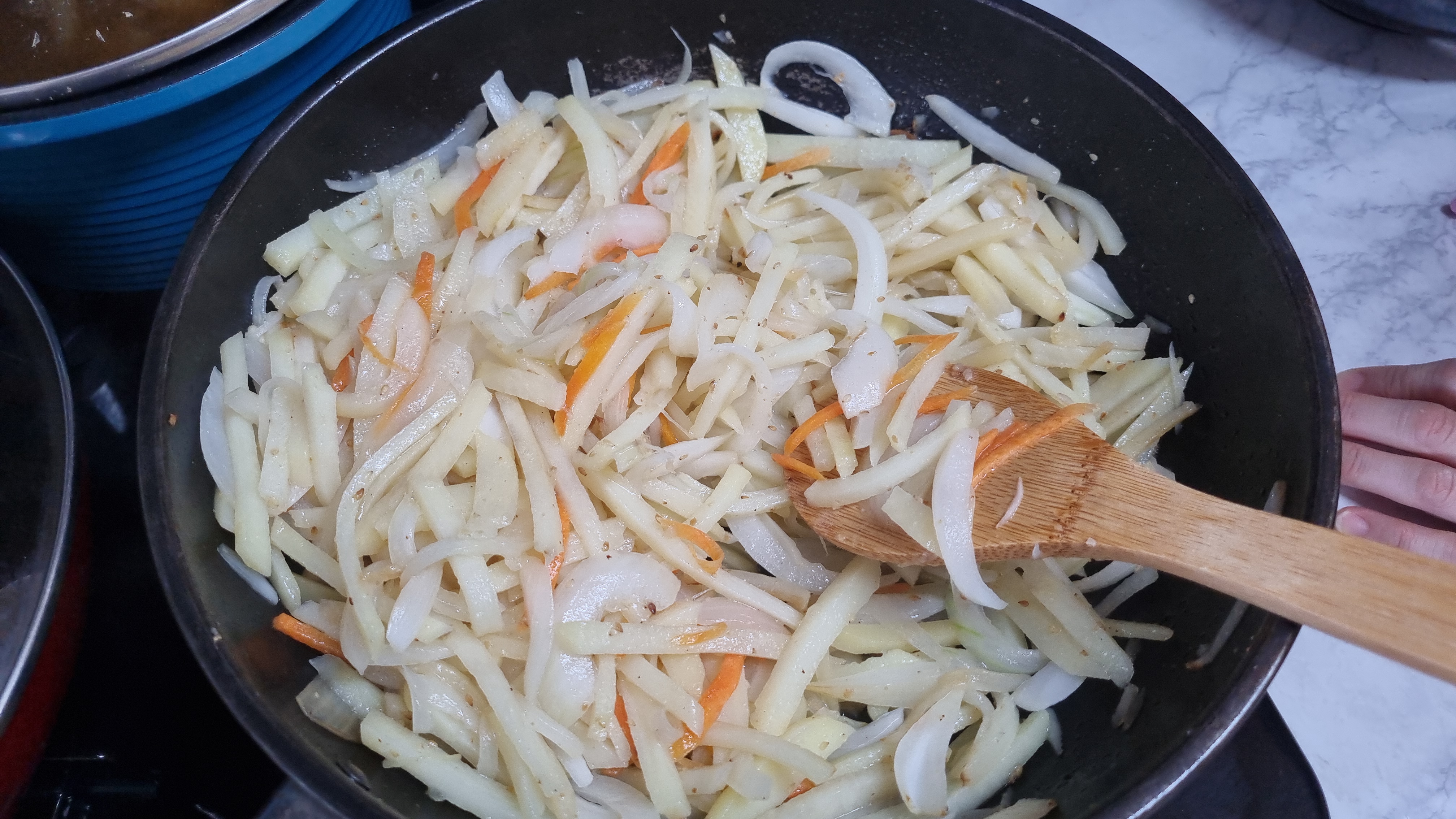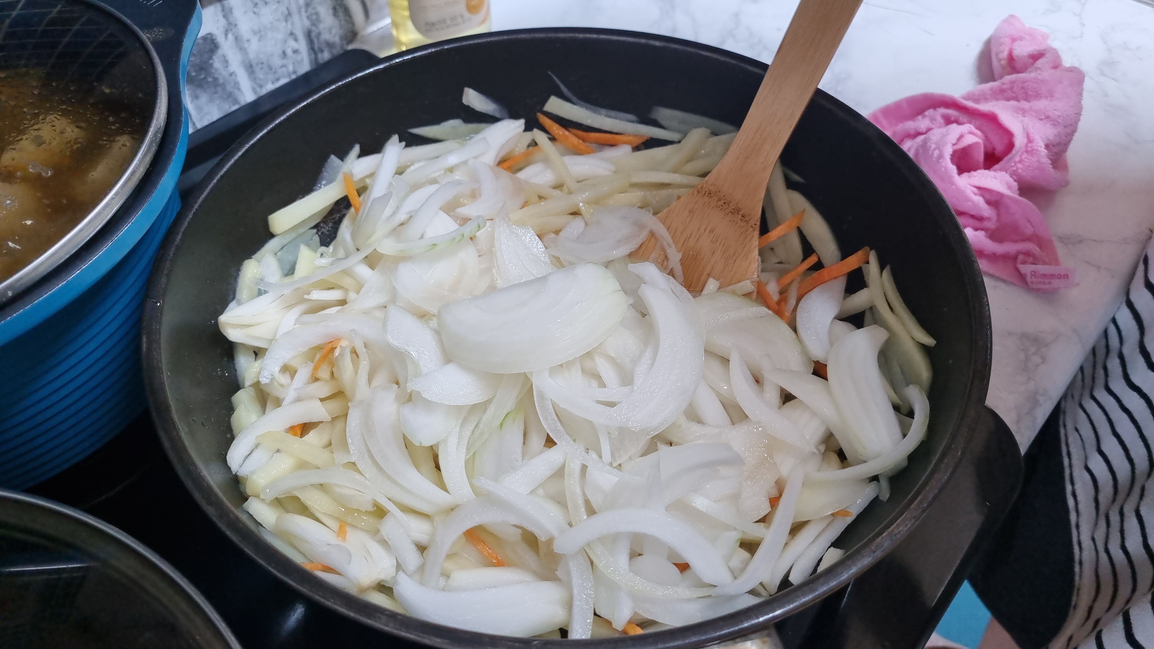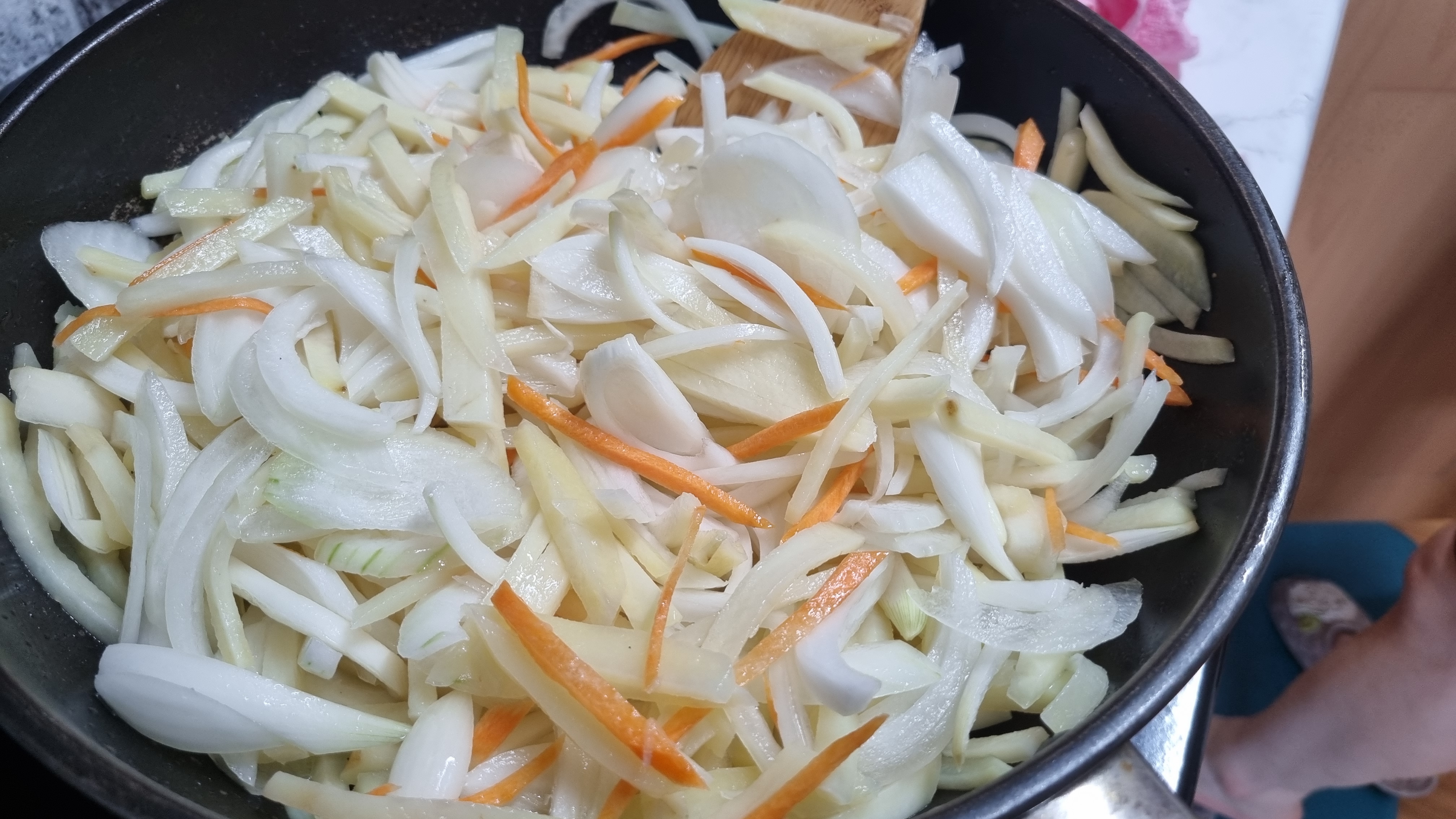 하나는 볶는 요리에 반드시 필요한 양파가 필요하고 나머지는 당근을 준비했습니다.