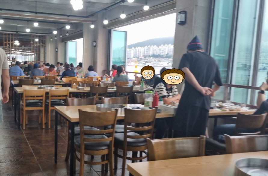 식당은 모두 입식 테이블로 되어있고 상당히 넓습니다. 바로 창문 너머로 바다이고 전망도 괜찮습니다.
