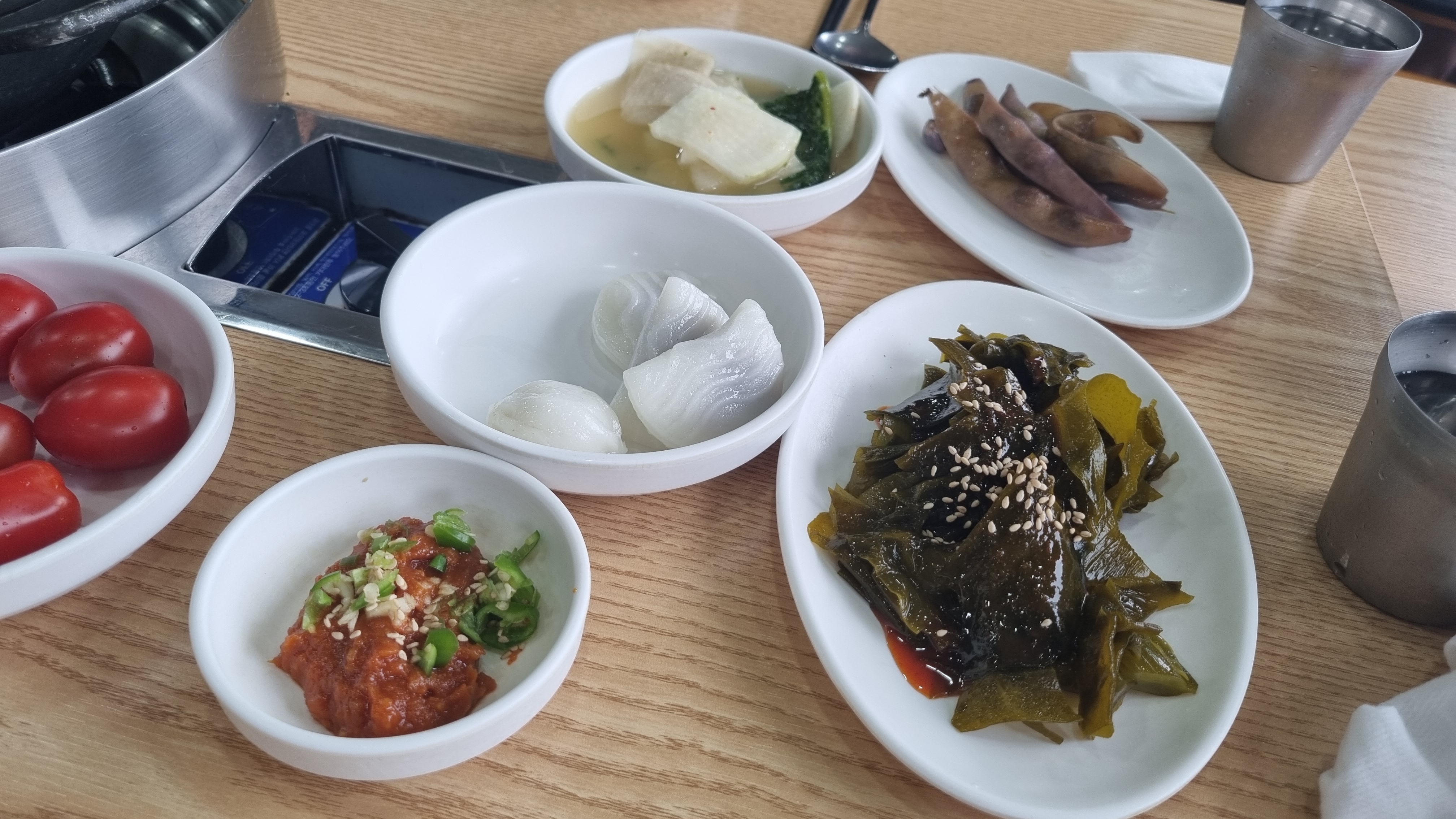 떡, 방울토마토, 옥수수, 미역무침이 나오는데 미역이 참 맛있었습니다.