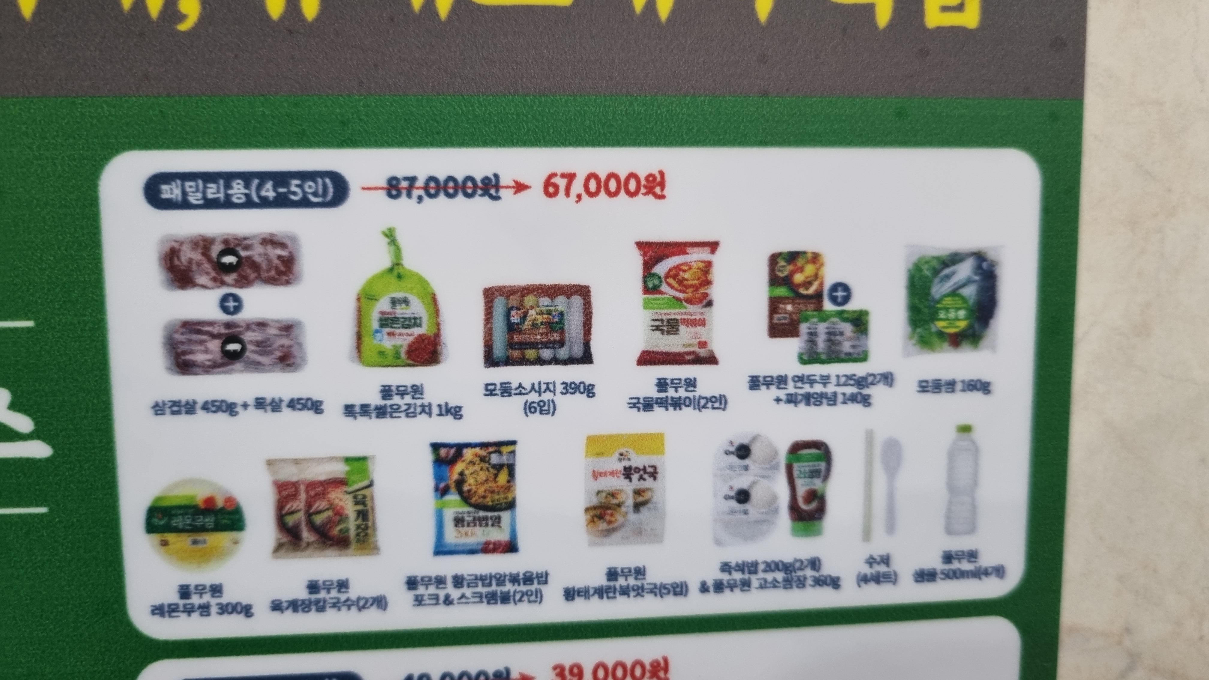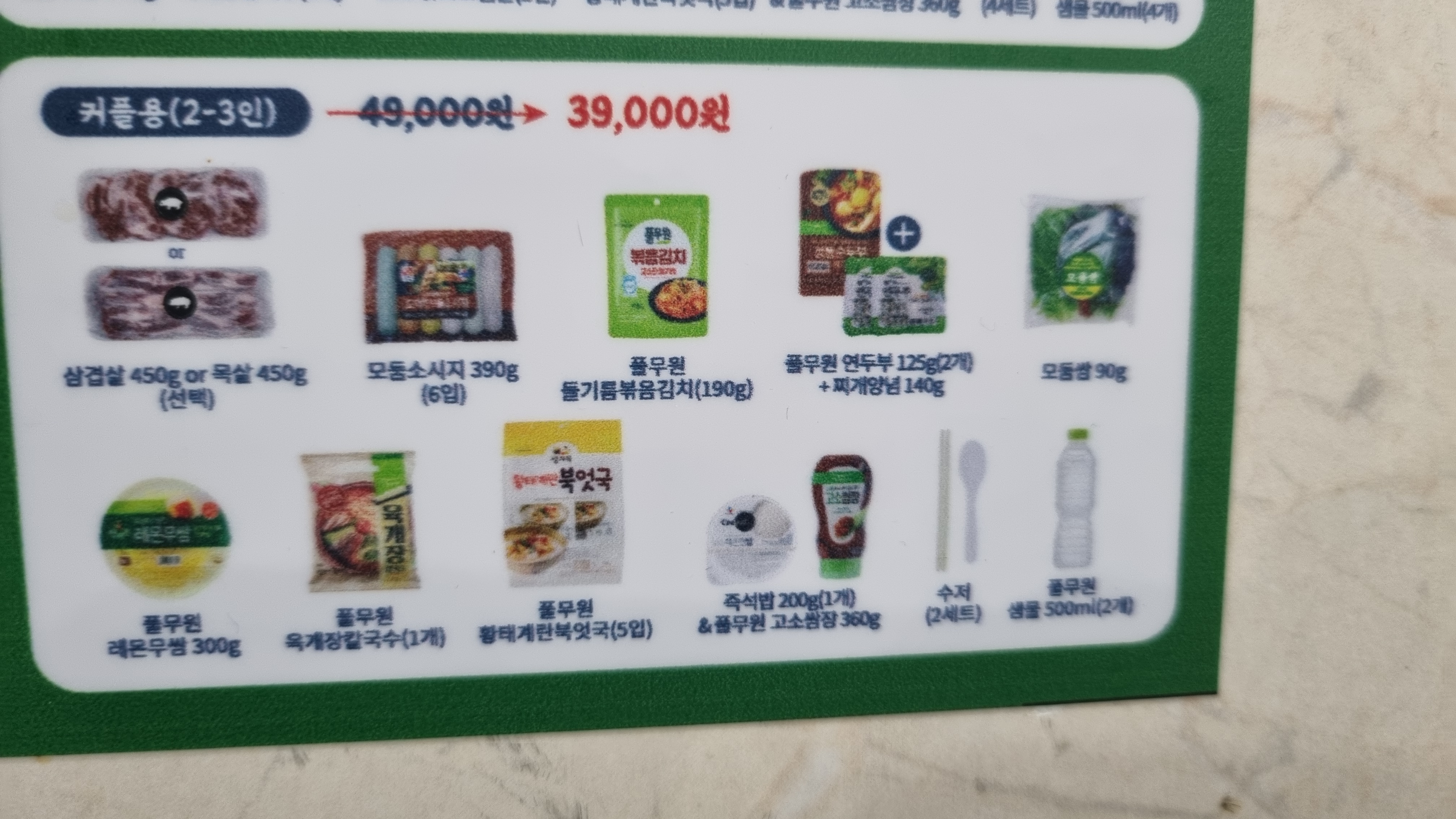 이것은 가격이 조금 낮은 것인데 삼겹살이나 목살에서 하나를 선택하고 11 품복인데 가격은 39,000원이었습니다.