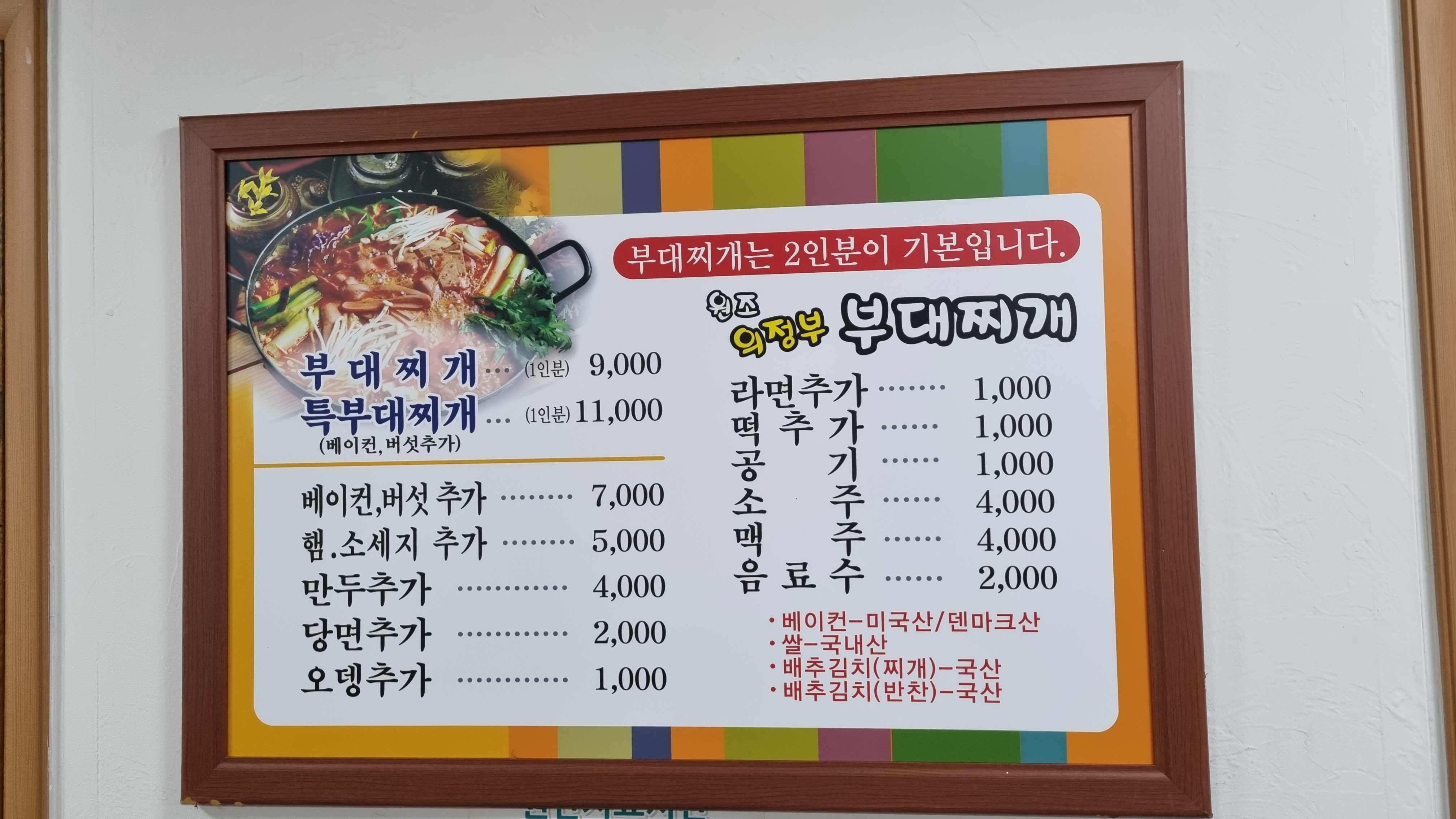 메뉴는 딱 2개인데 부대찌개와 특부대찌개입니다. 두개의 차이는 베이컨과 버섯이 추가된 특부대가 가격이 조금 더 비싸는데 각각 9,000원과 11,000원입니다.