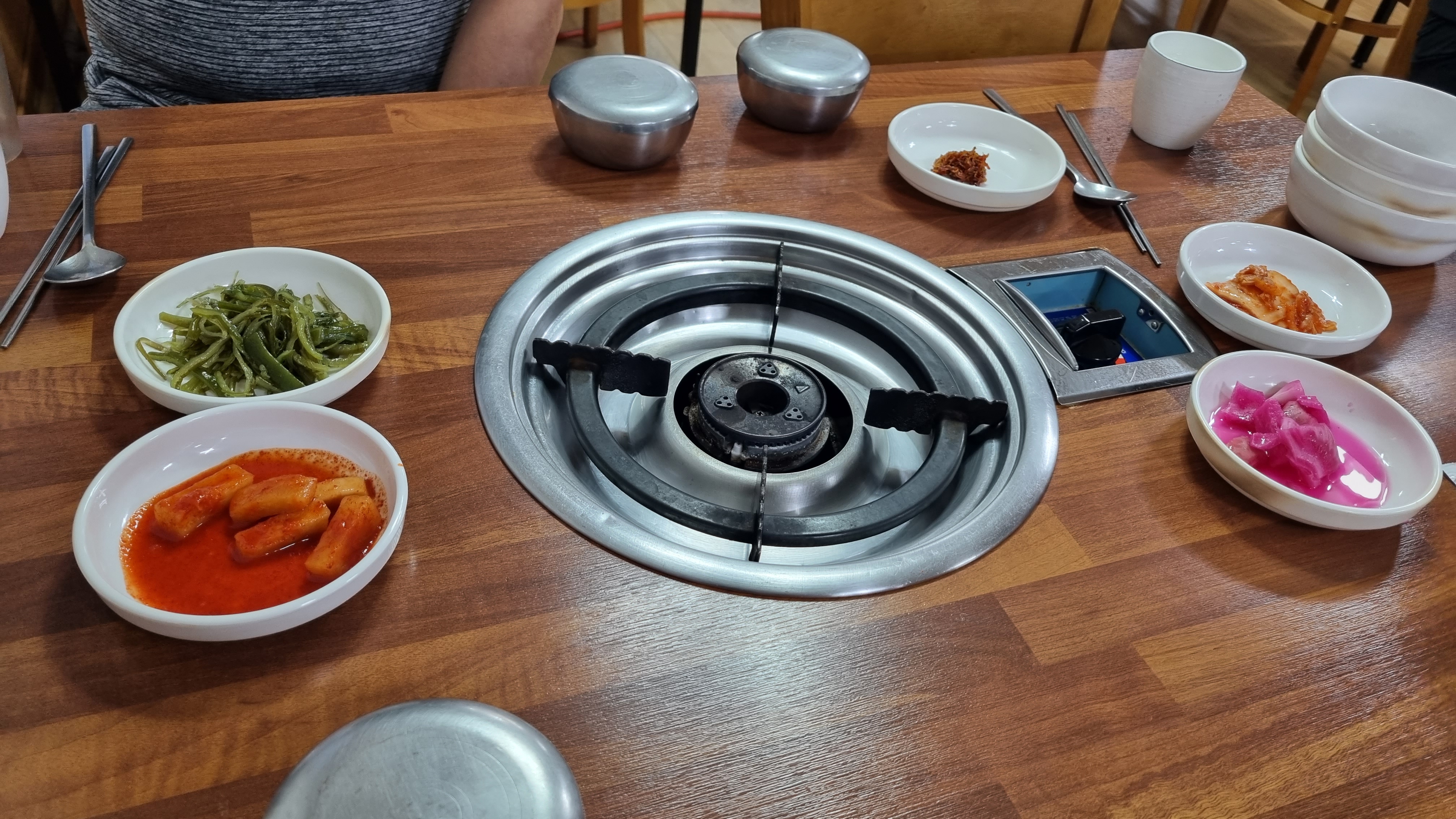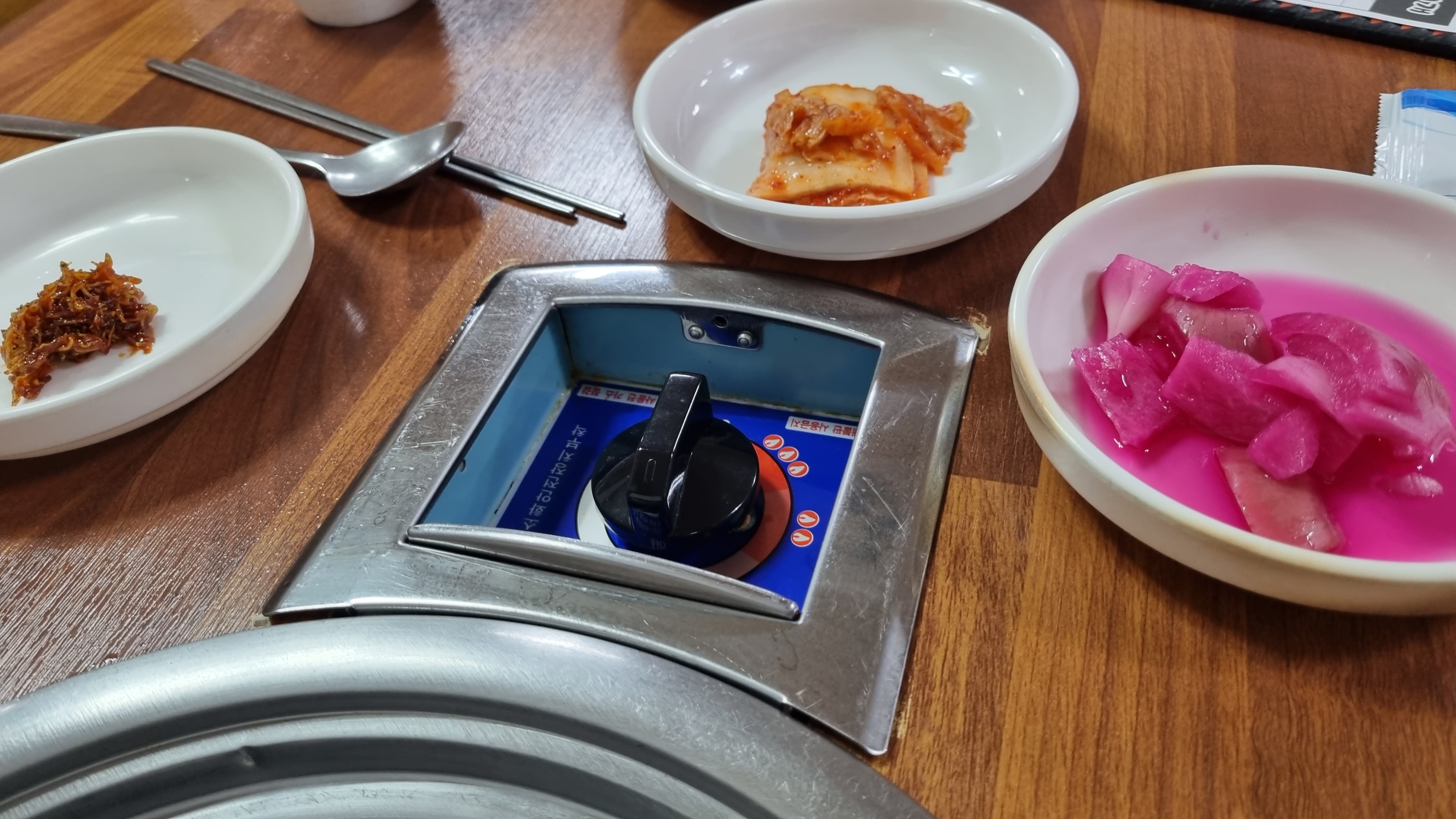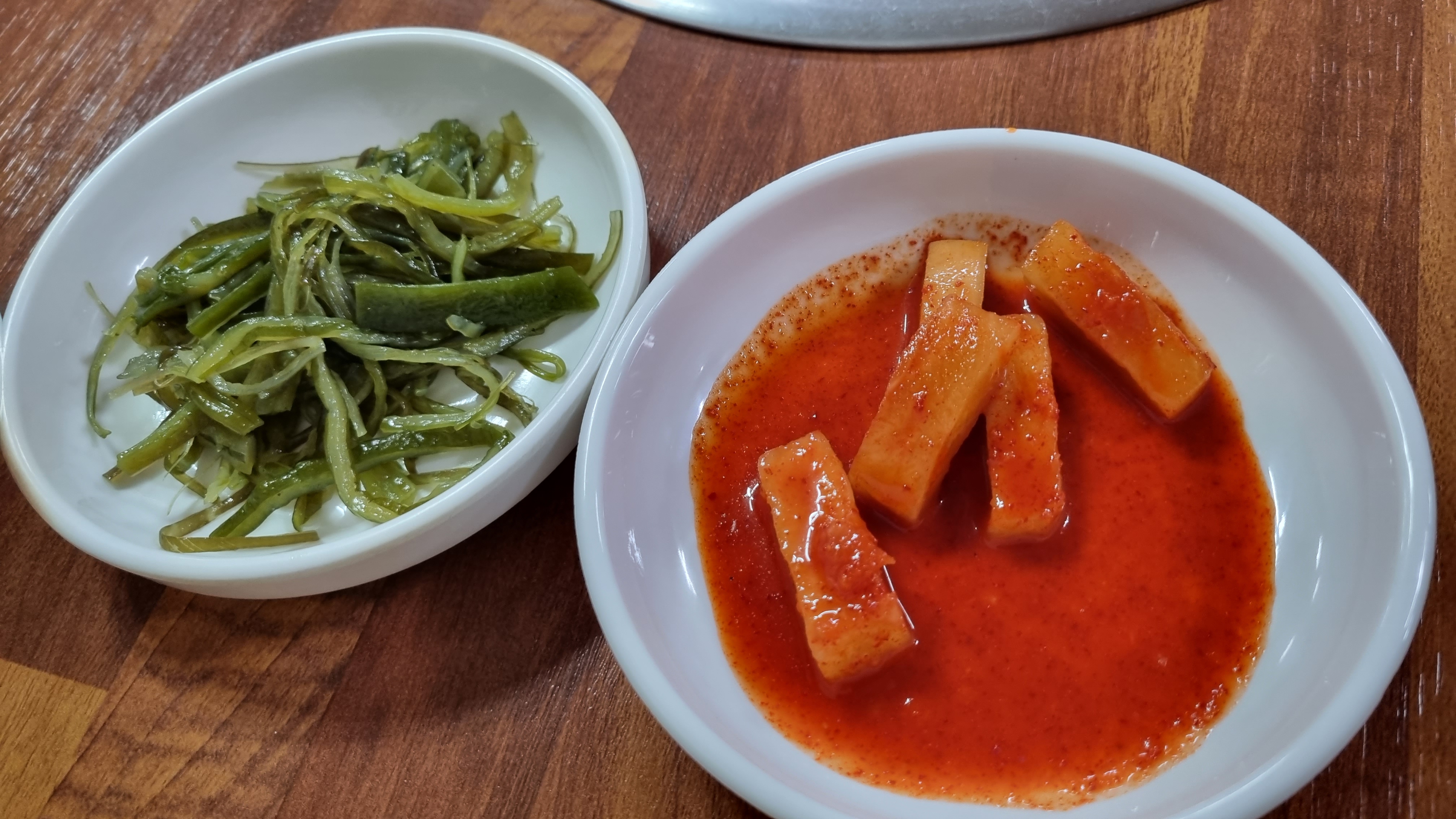 기본반찬은 5가지가 나오는데 깍두기, 미역줄기볶음, 배추김치, 새우젓등이 나오는데 맛은 보통으로 먹을만합니다. 추가 리필은 가능하며 셀프가 아닌 종업원에게 요청하면 됩니다.