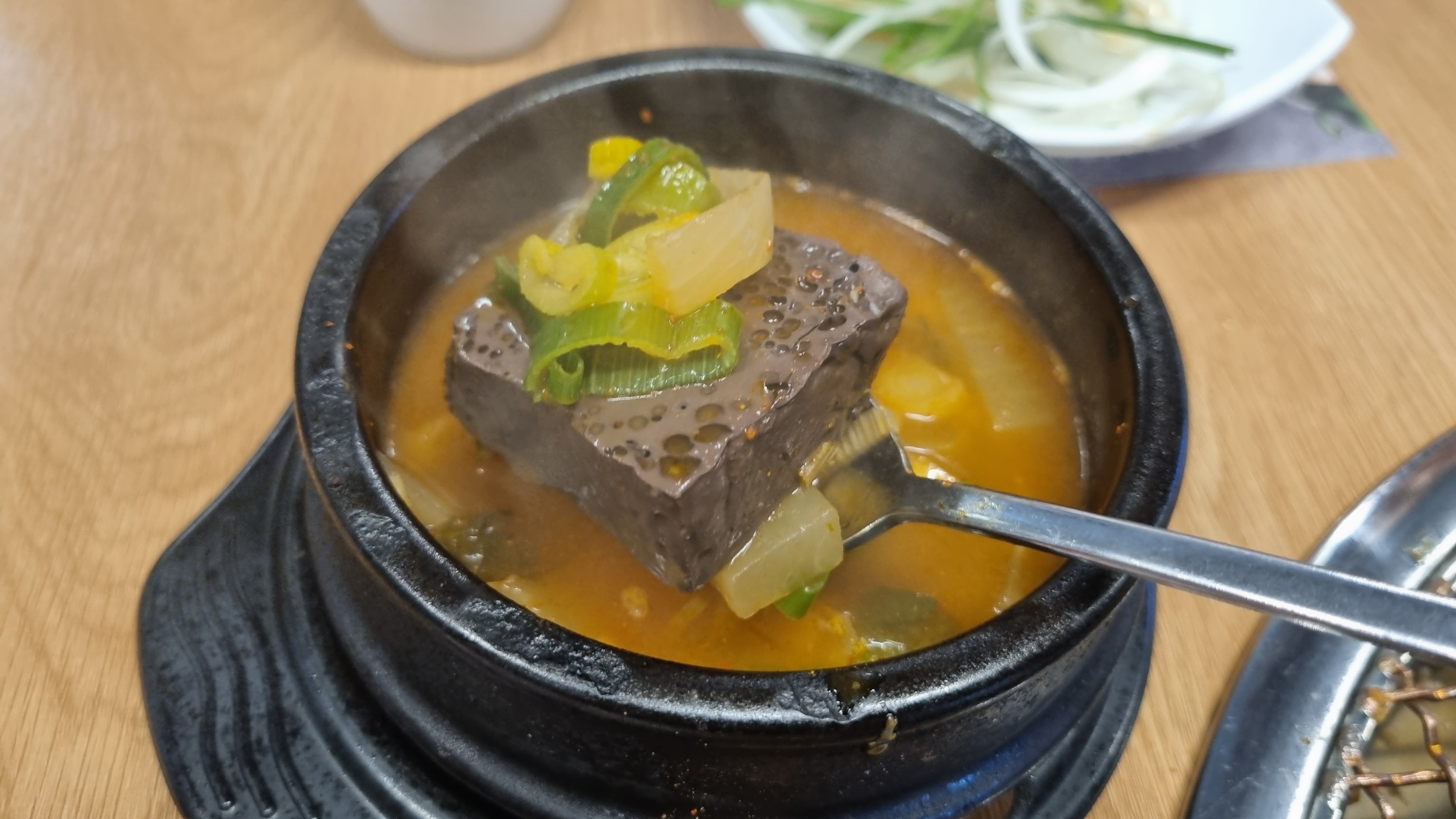 기본 반찬이 나오고 국물이 나왔는데 바로 선지국입니다. 근데 이것이 너무 맛있고 선지 덩이리가 맛있게 추가로 리필을 부탁하였습니다.