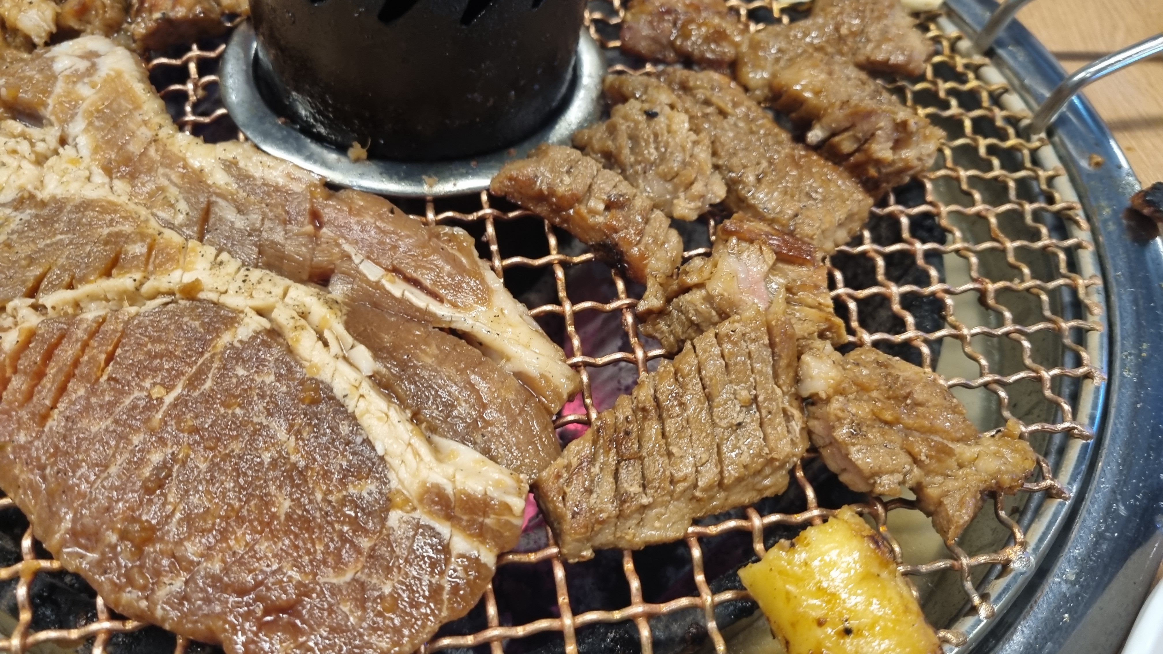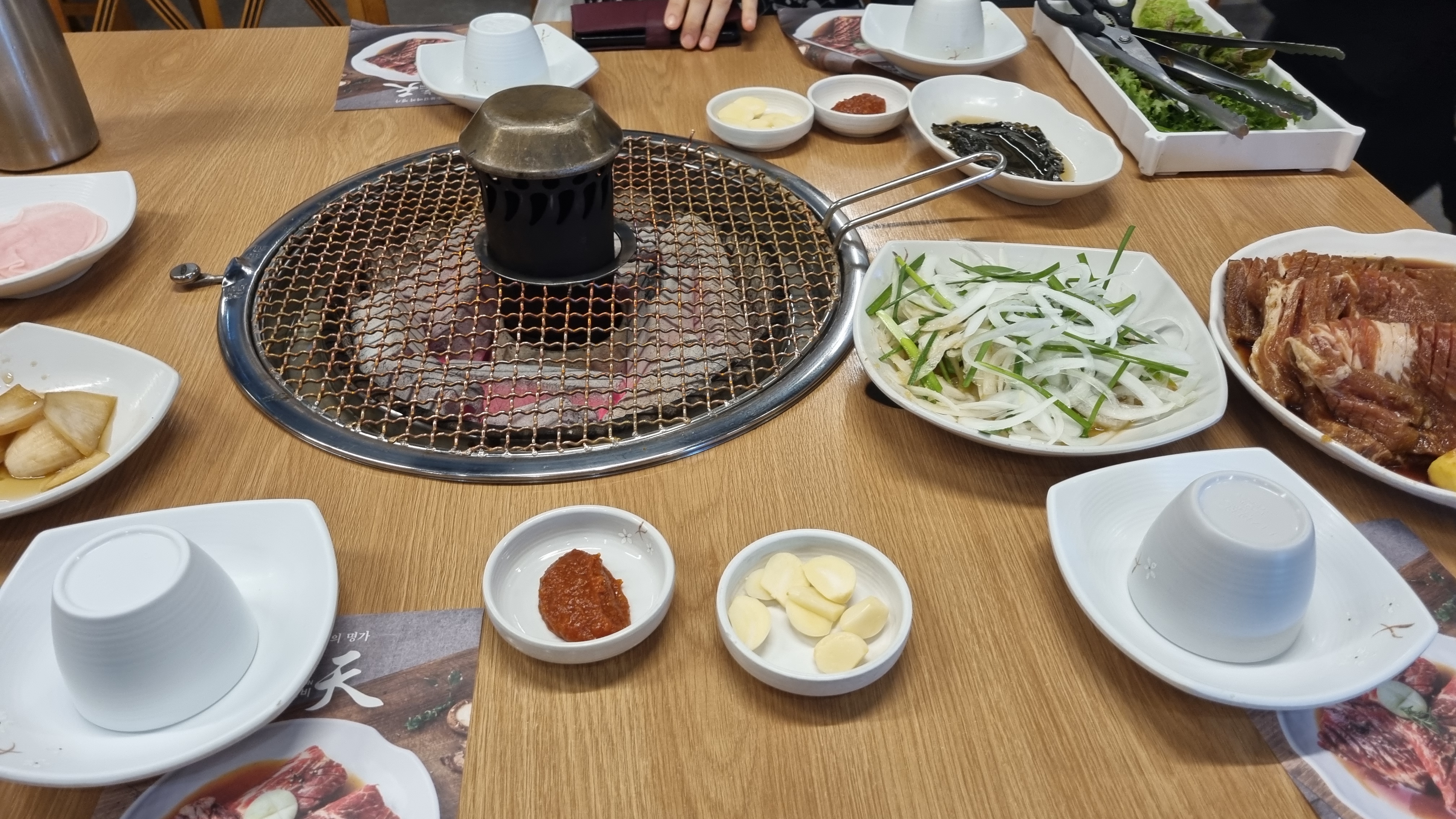 숯불도 불이 아주 좋고 고기를 덩어리 3개을 올려놓습니다. 4명이 식사하는데 초반에는 역시 굽는 속도가 먹는 속도를 따라가지 못했습니다.