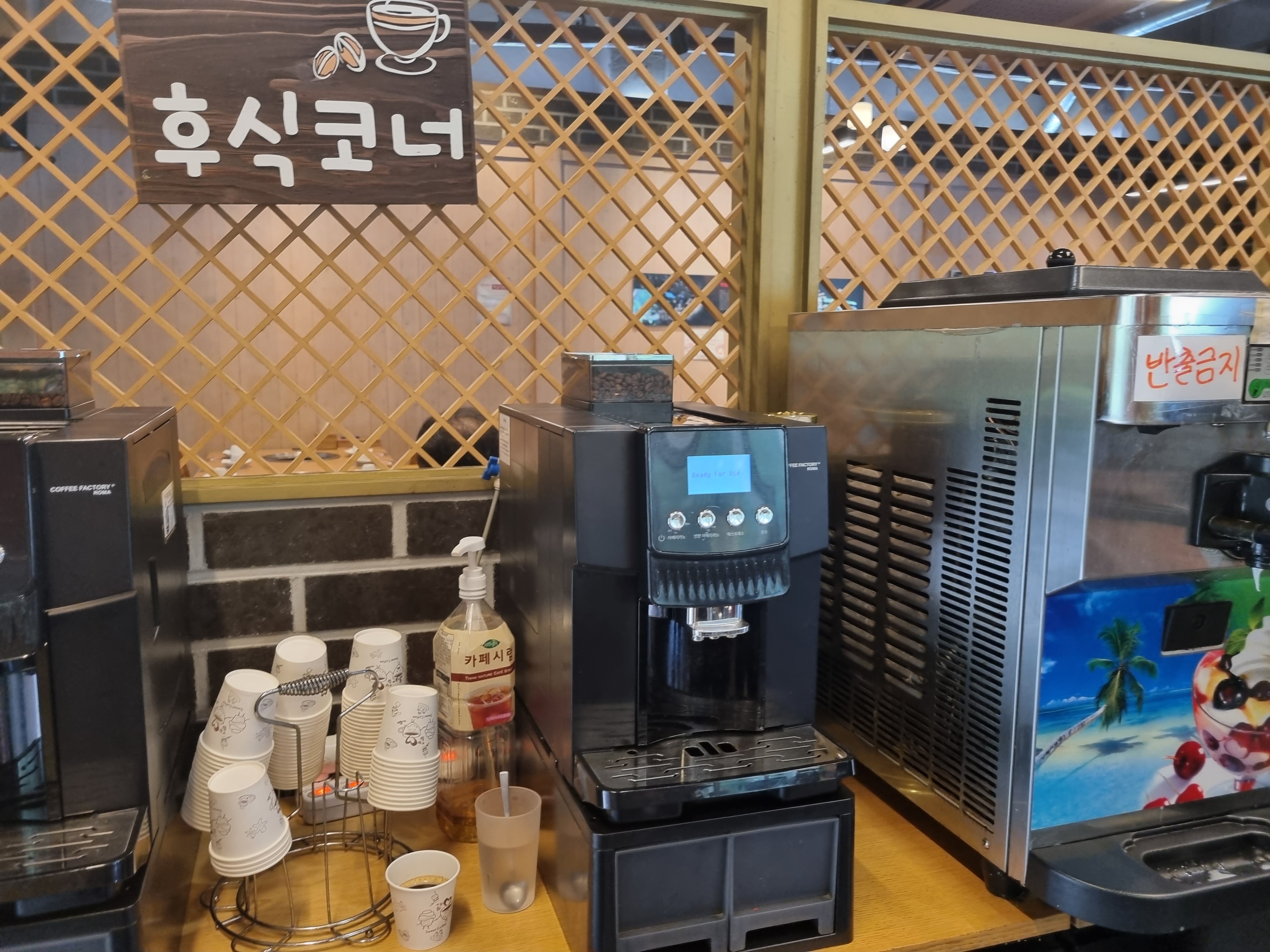 후식코너가 따로 있는데 커피와 아이스크림을 먹을 수 있습니다. 커피도 아메리카노이고 아이스크림도 고급스럽게 보이는데 드시는 것은 식당 내에서만 드셔야 합니다.