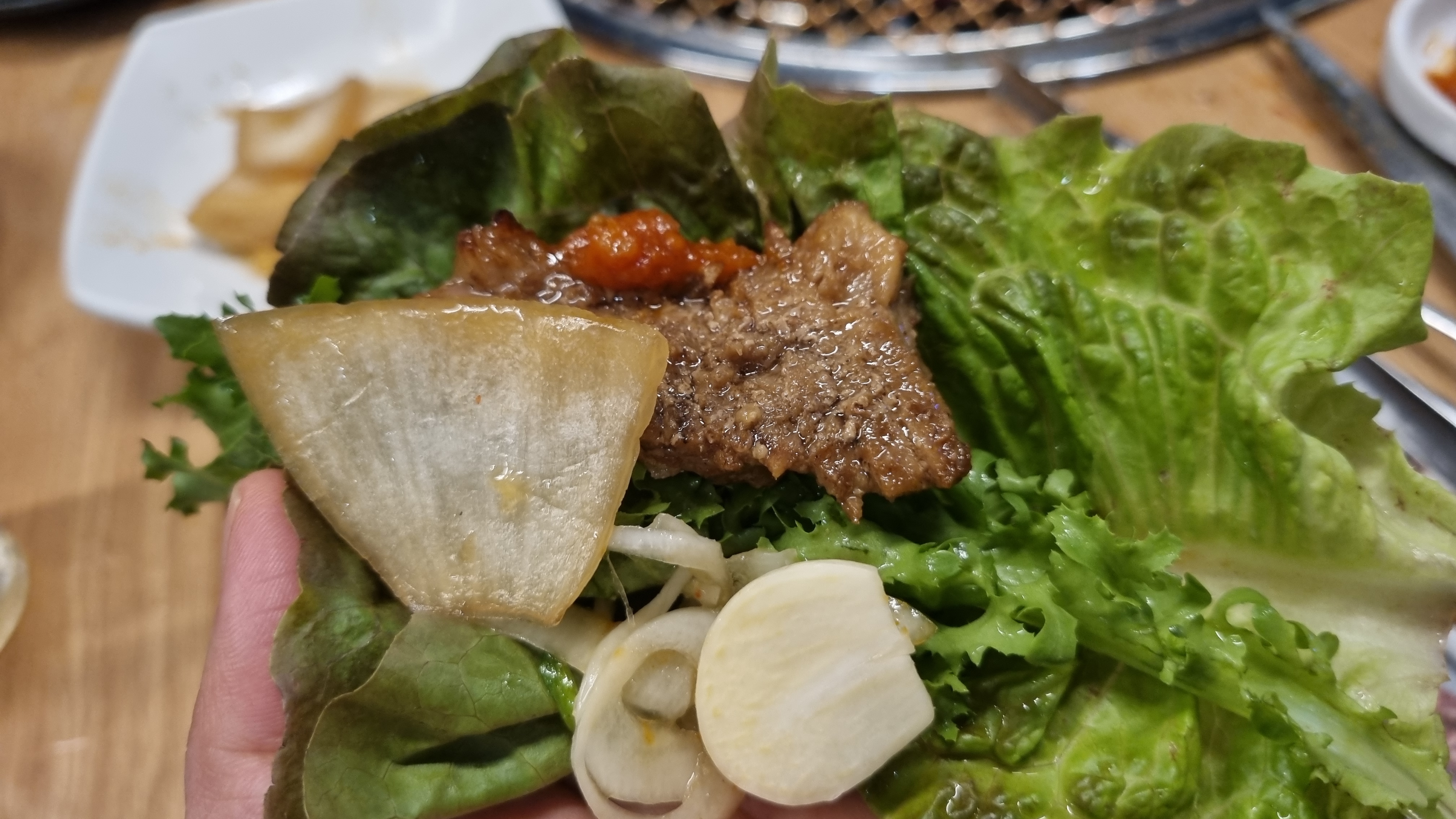 갈비가 맛있어 절반은 그냥 먹거나 된장만 발라 먹고 나머지 절반은 이렇게 상추쌈으로 먹었습니다.