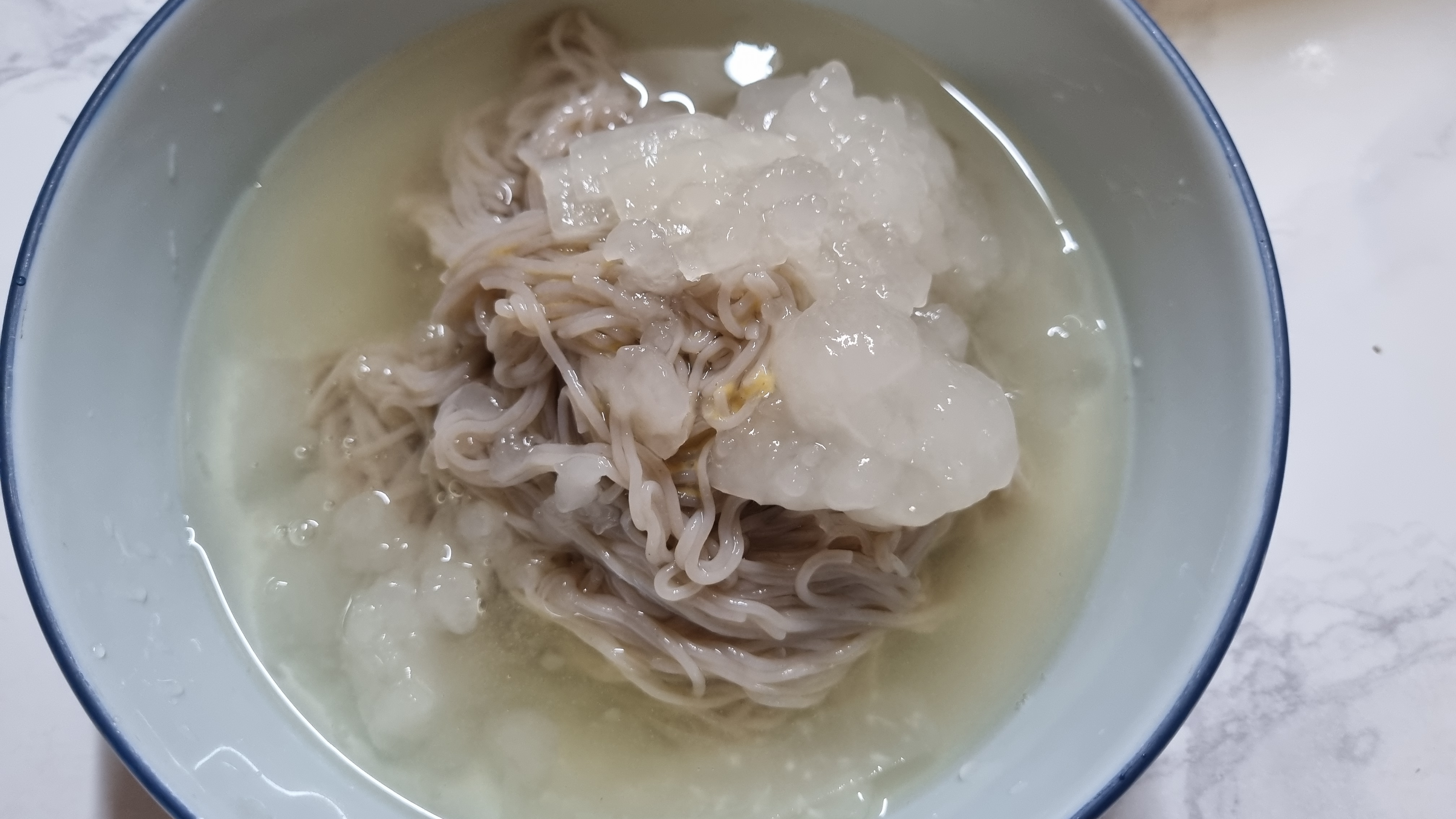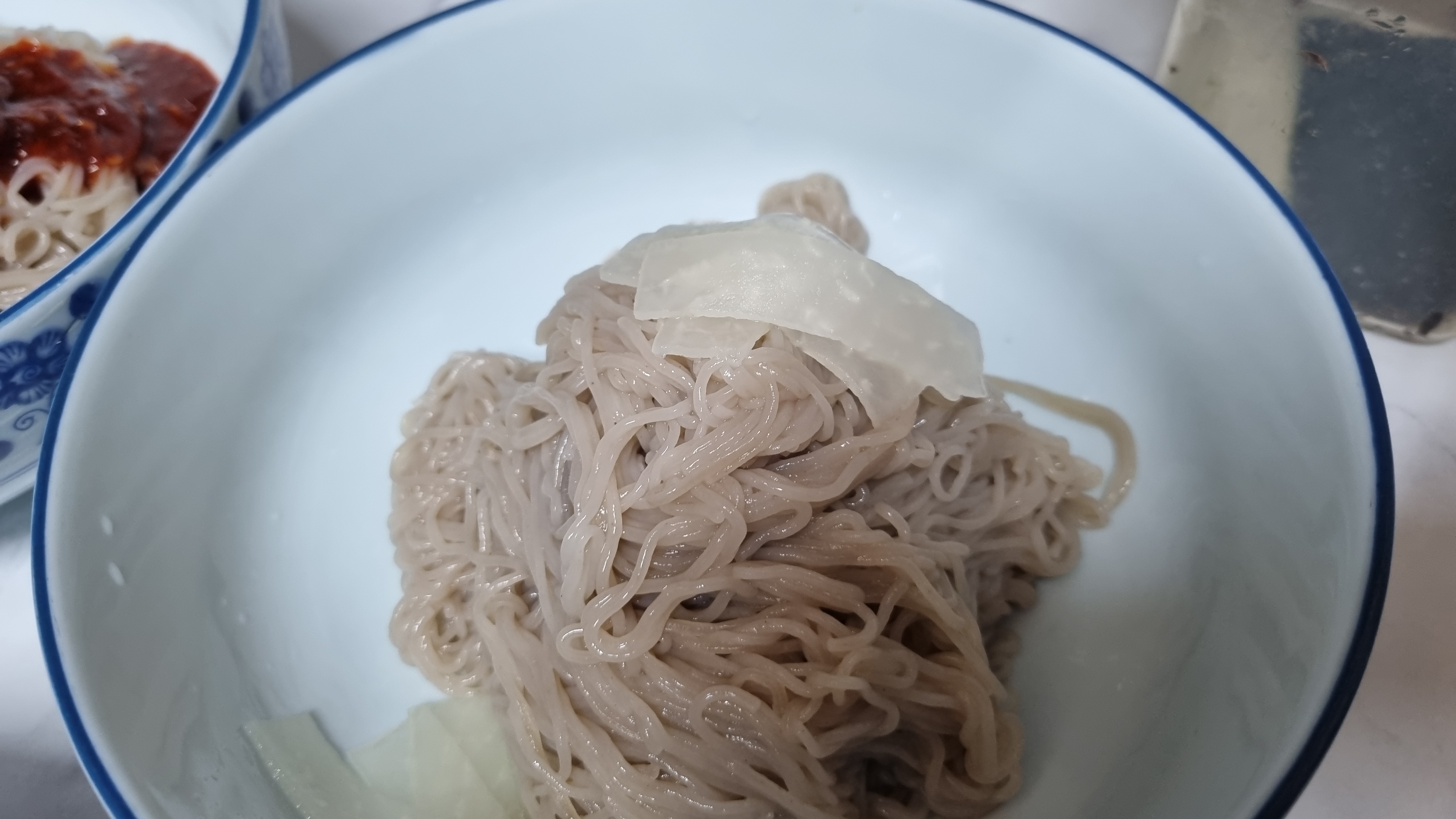 이렇게 간단하게 물냉면이 완성되었는데 보기에는 오이나 다른 재료가 없어 좀 그렇지만 시원한 육수와 쫄깃한 면발이 정말 맛있습니다.