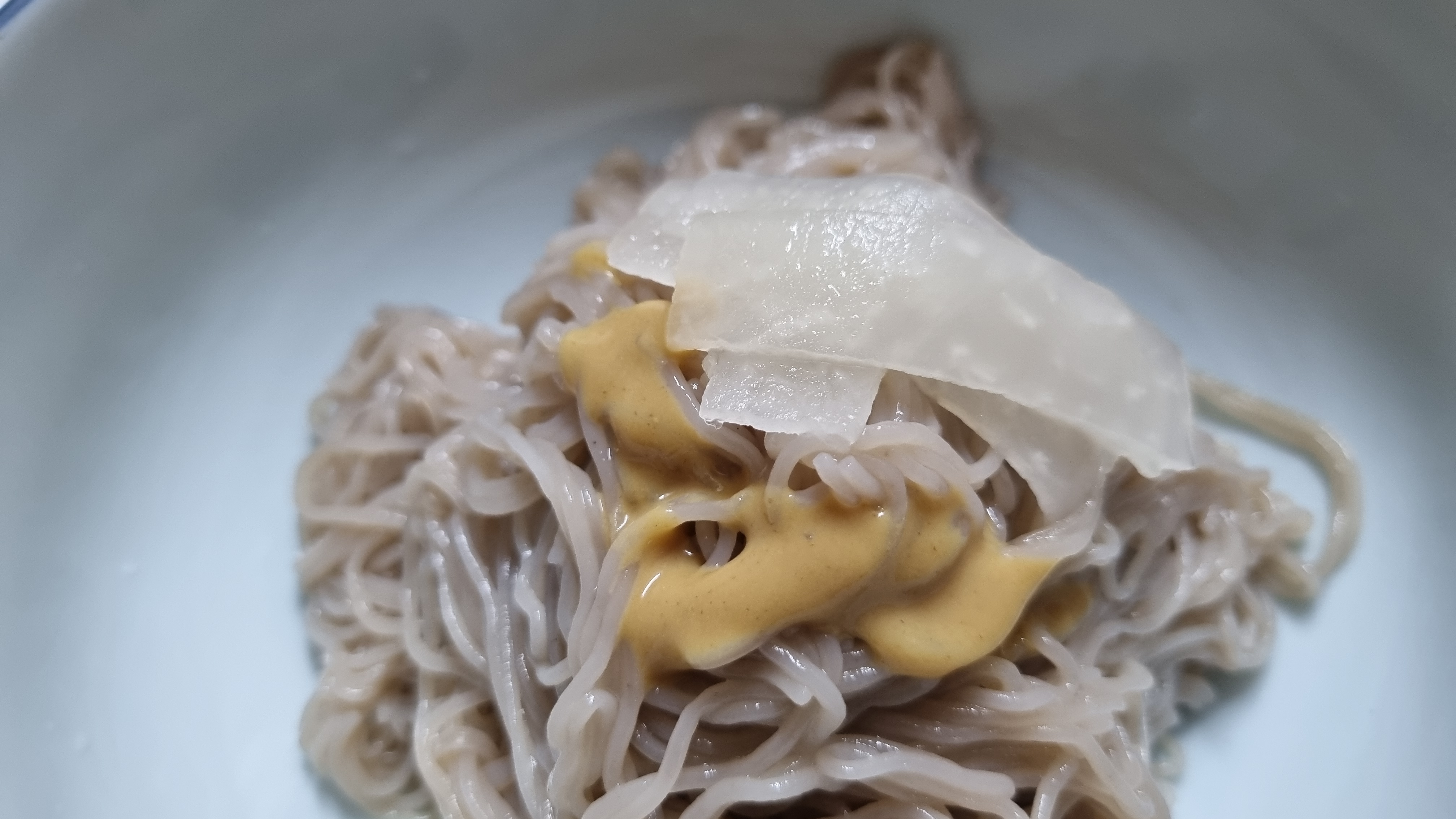 물냉면에 겨자소스를 한개 넣었는데 만약 더 진한 맛을 느끼고 싶다면 집에있는 겨자를 더 추가하시면 됩니다. 우리가 생선회 드실때 찍어먹는 겨자나 와사비를 넣으시면 괜찮습니다.