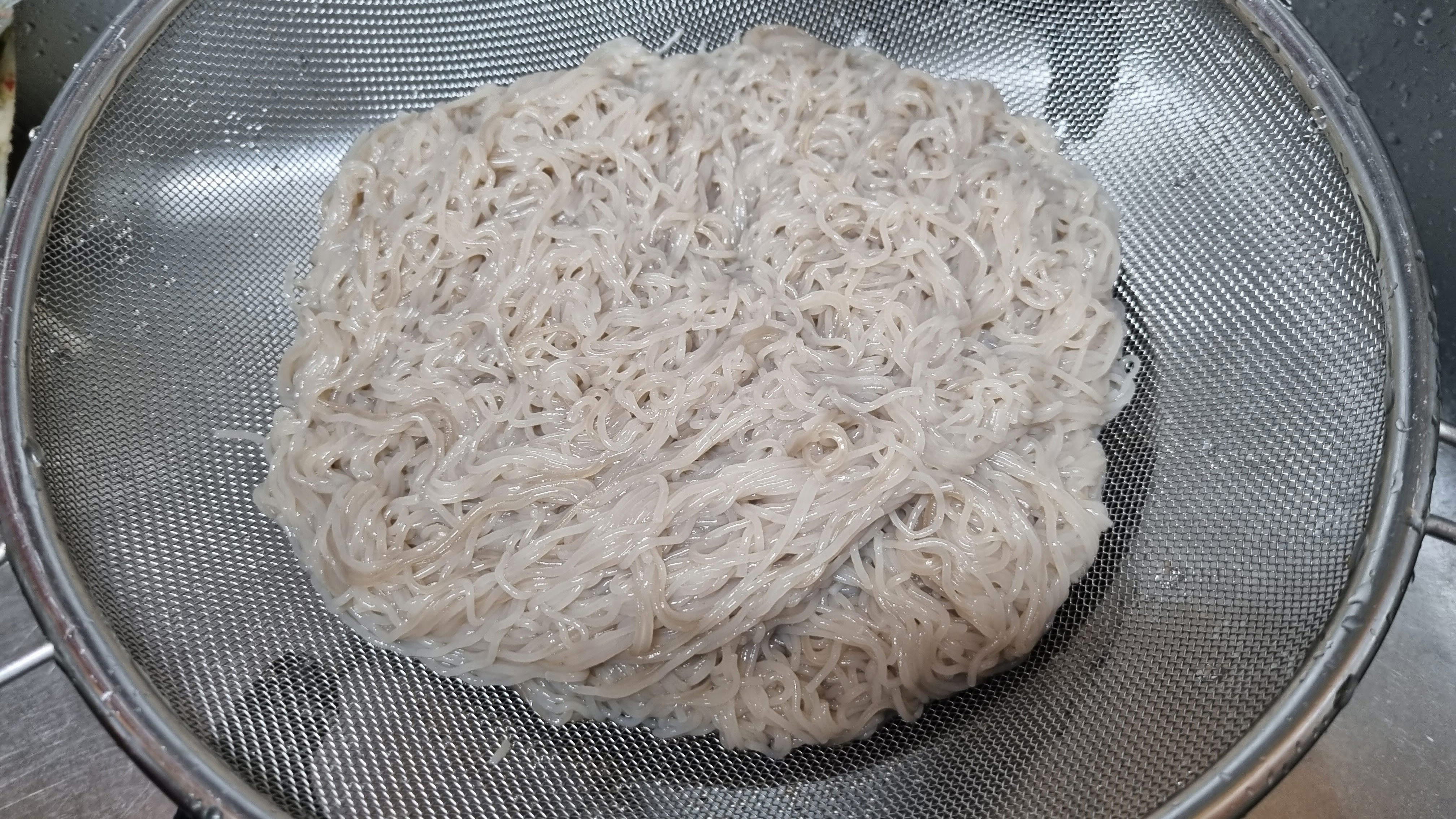 물을 끓일동안 냉면의 면을 풀어줘야 하는데 딱딱하게 붙어 있기 때문에 손으로 가볍게 힘을 주어 살짝 풀어준다는 기분으로 덩어리가 조금 풀리게 헤주시면 삶을때 더 잘 풀어집니다.