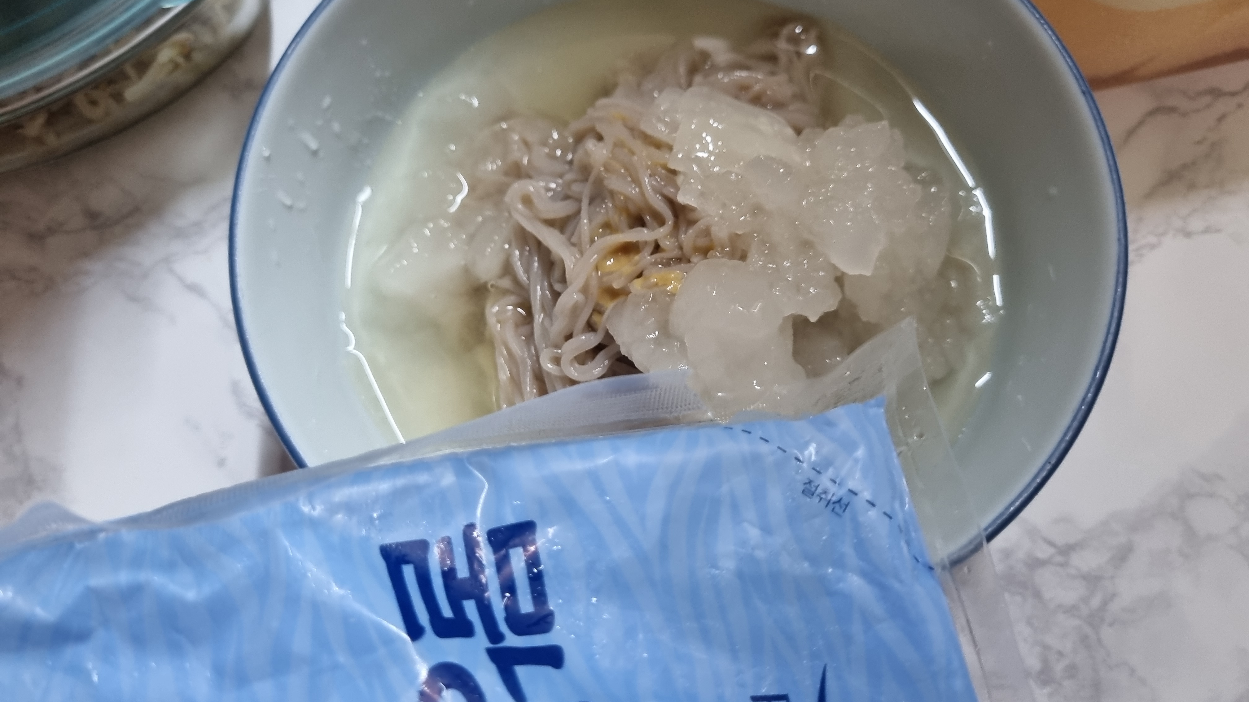 물냉면 육수는 냉동실에 보관한건데 아주 단단하게 얼려 있었는데 미리 해동을 조금 시켰는데 살얼음식으로 아주 좋게 되었습니다.
