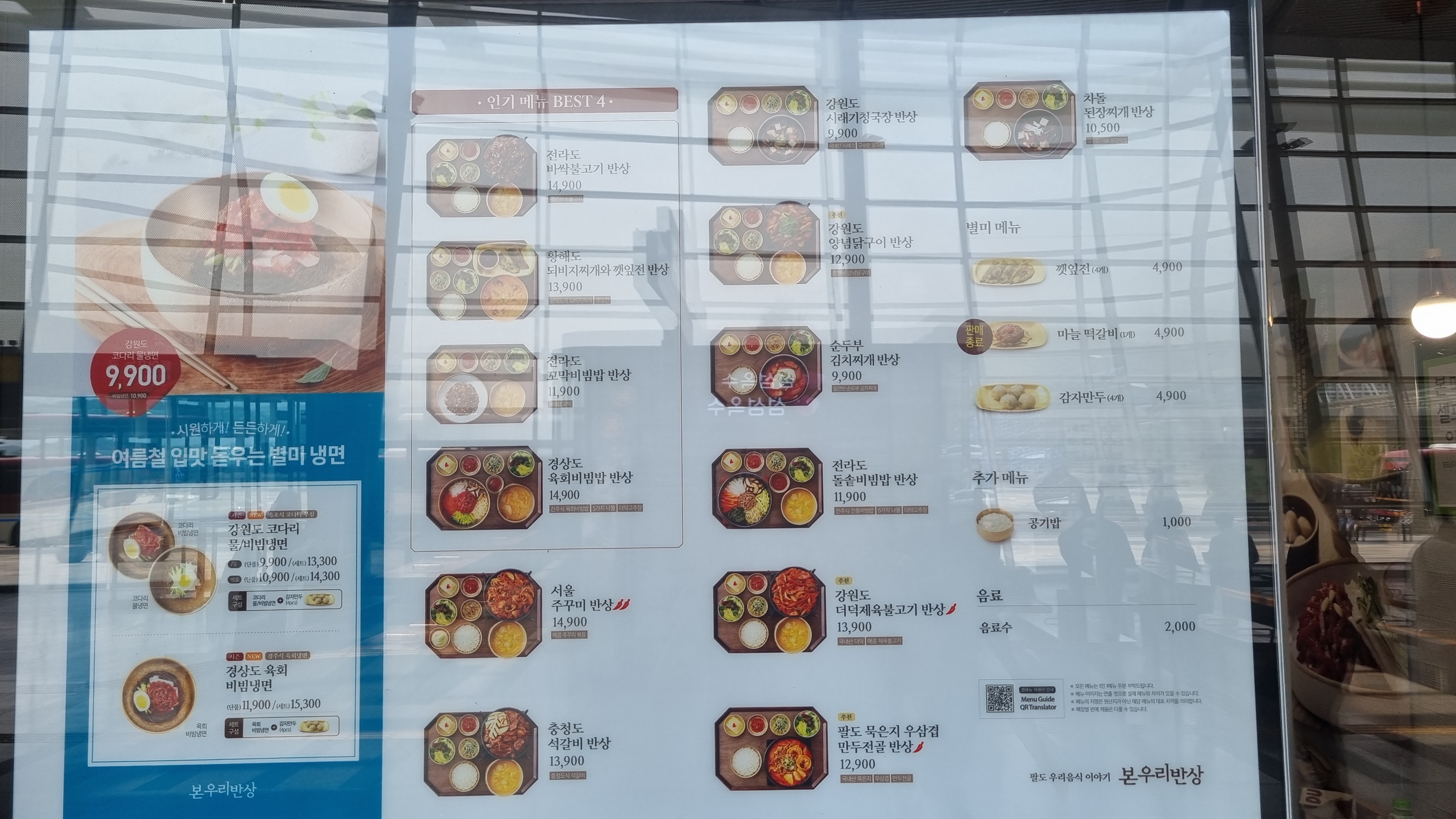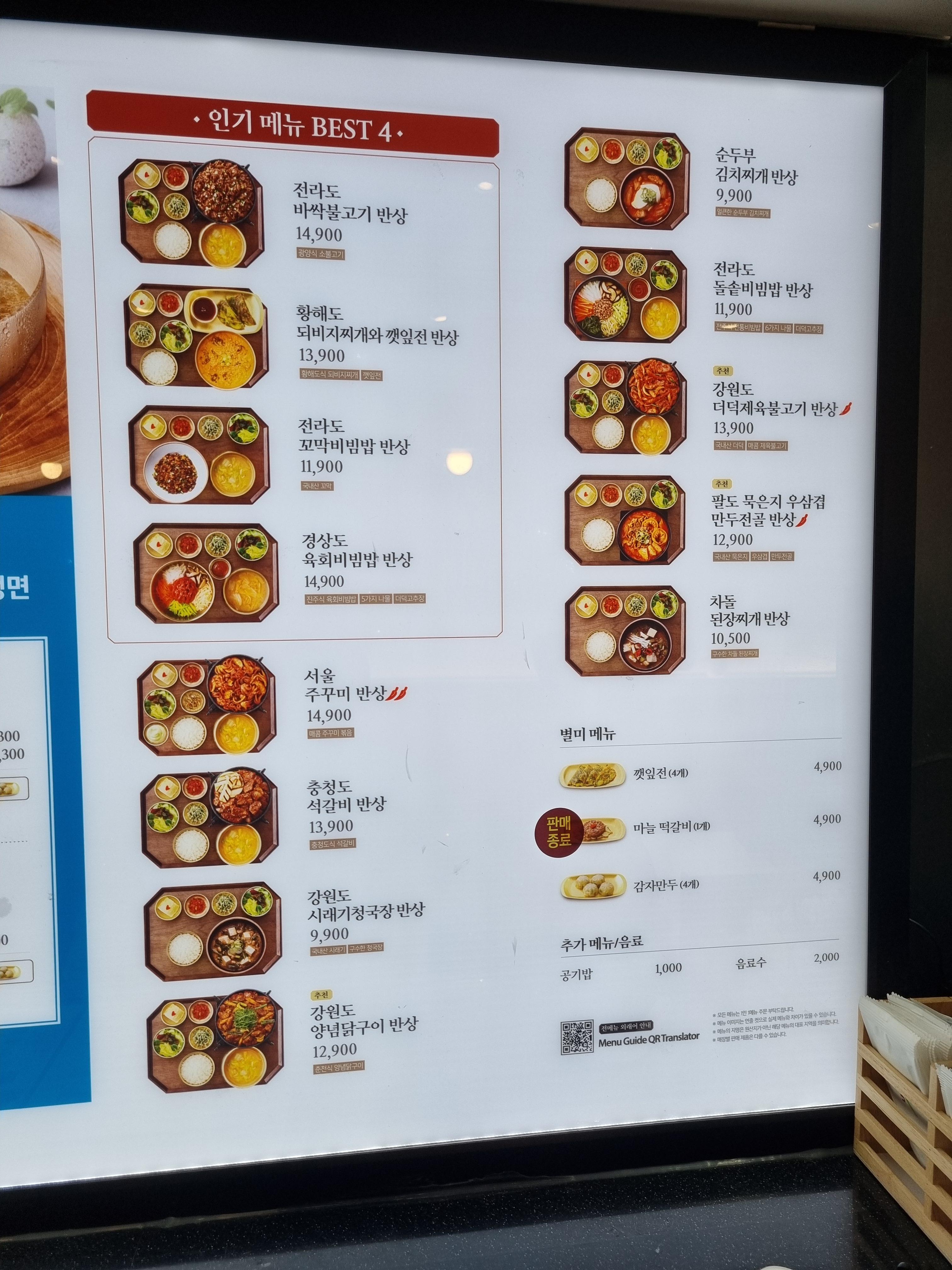인기메뉴가 따로 소개되었는데 전라도 바싹 불고기 반상이 14,900원, 전라도 꼬막비빔밥 반상이 11,900원, 경상도 육회비빔밥 반상이 14,900원으로 가격은 대부분 1만 원에서 1만 5천 원까지로 여러 메뉴들이 있습니다.