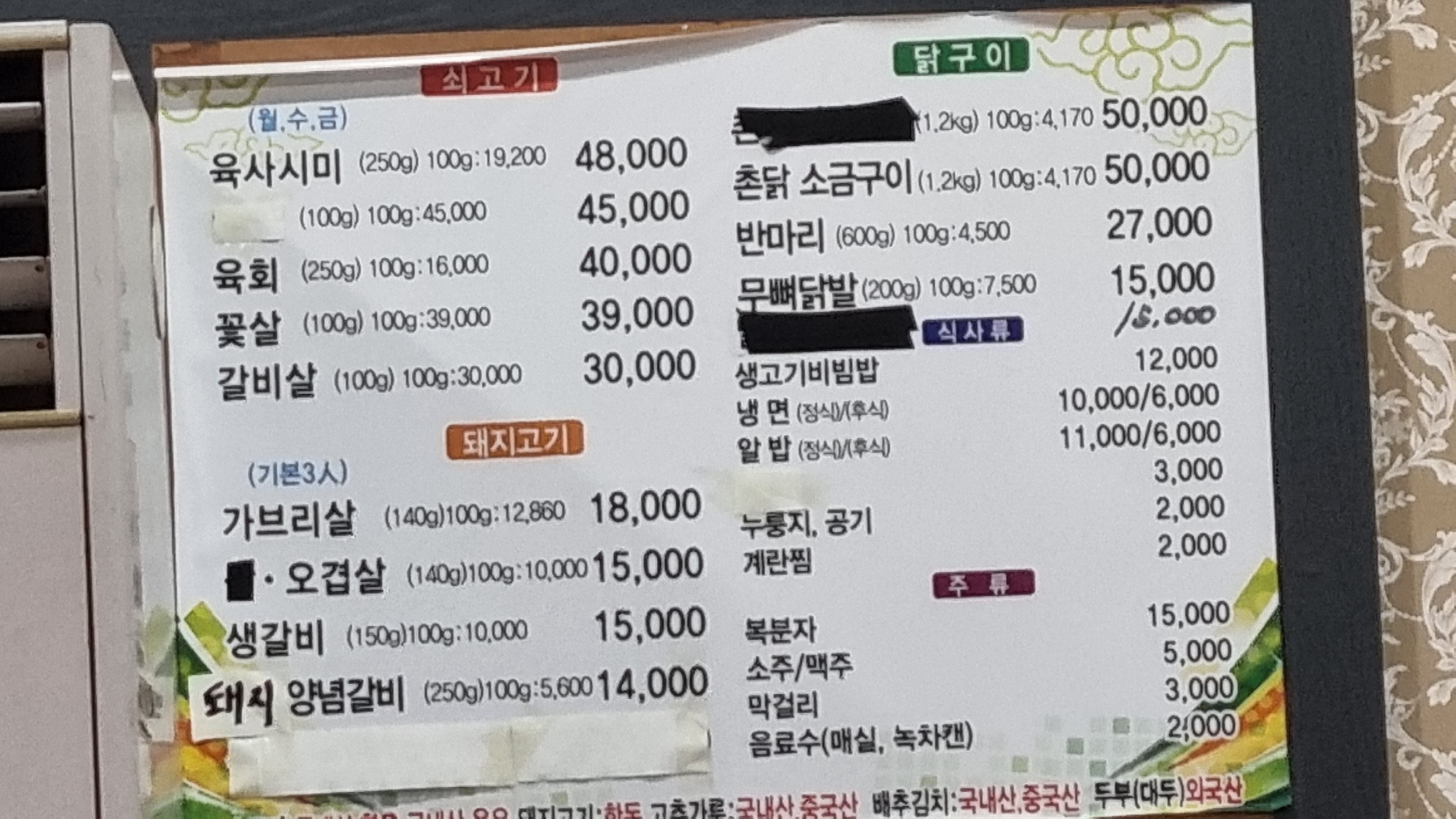 육사시미도 판매되는데 250g에 48,000원이며 촌닭 소금구이가 50,000원입니다. 후식으로는 냉면이 6천 원 누룽지 2천 원 등입니다.