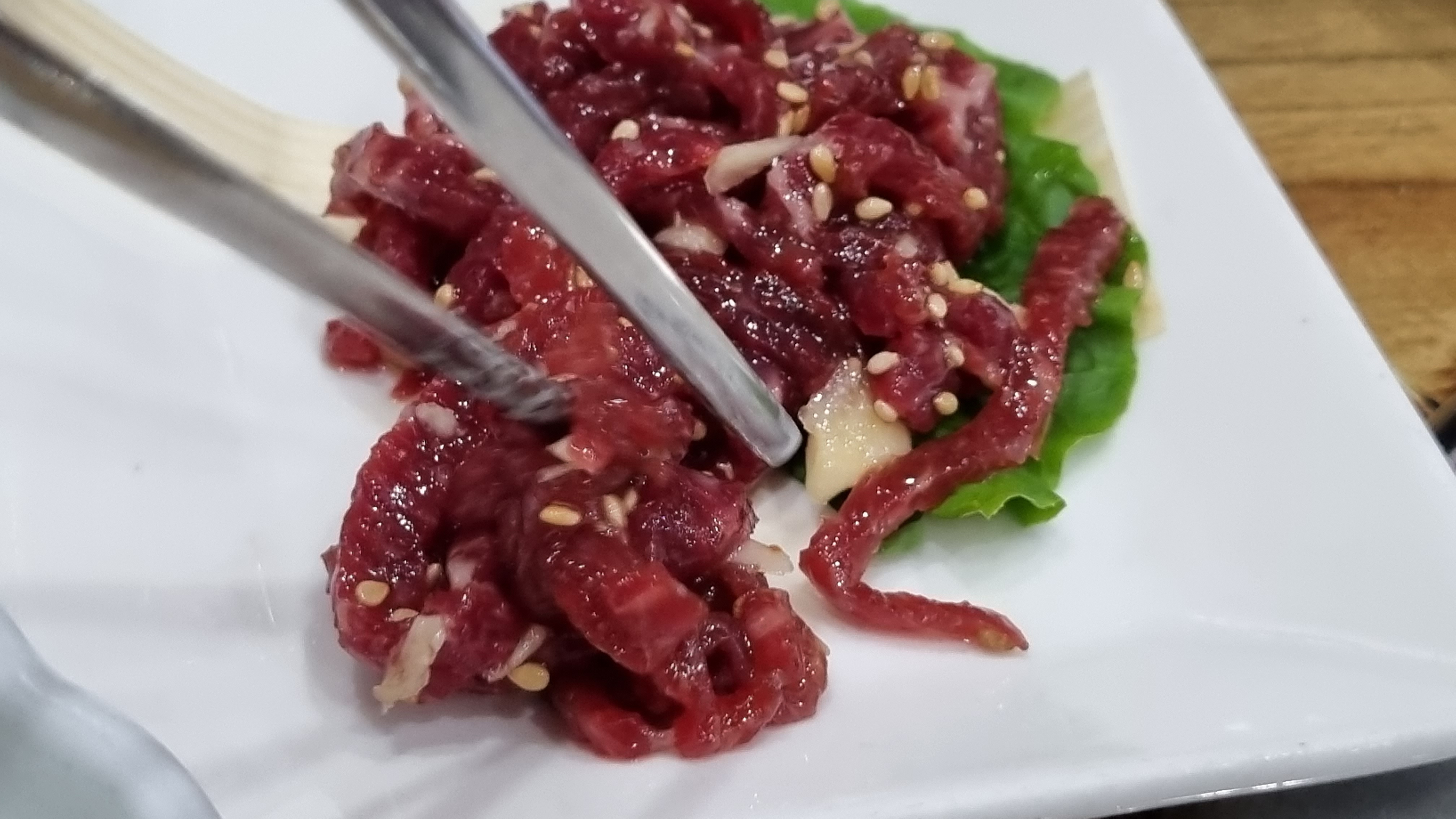 오겹살을 한참 먹고 있는데 소고기 육회서비스 음식이 나왔습니다. 양은 적지만 일행이 한 점씩 골고루 먹어볼 정도는 되는데 역시 소고기 육회 맛있습니다.