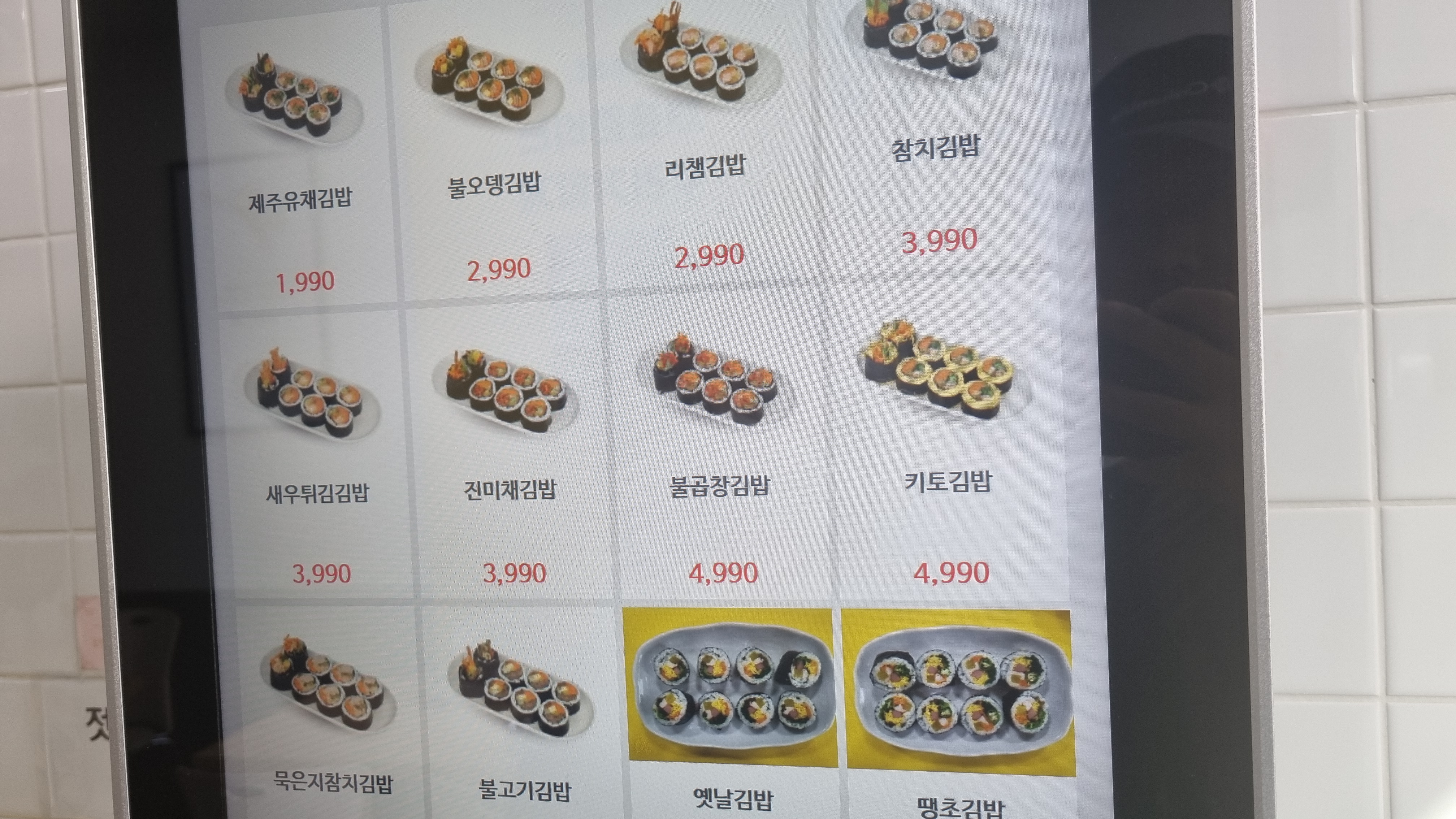 키오스 메뉴판인데 제주유체김밥 이름의 메뉴가 990원에 판매괴고 있습니다. 다른 메뉴의 가격은 1,900원에서 2,800원까지의 메뉴도 많이 있습니다.