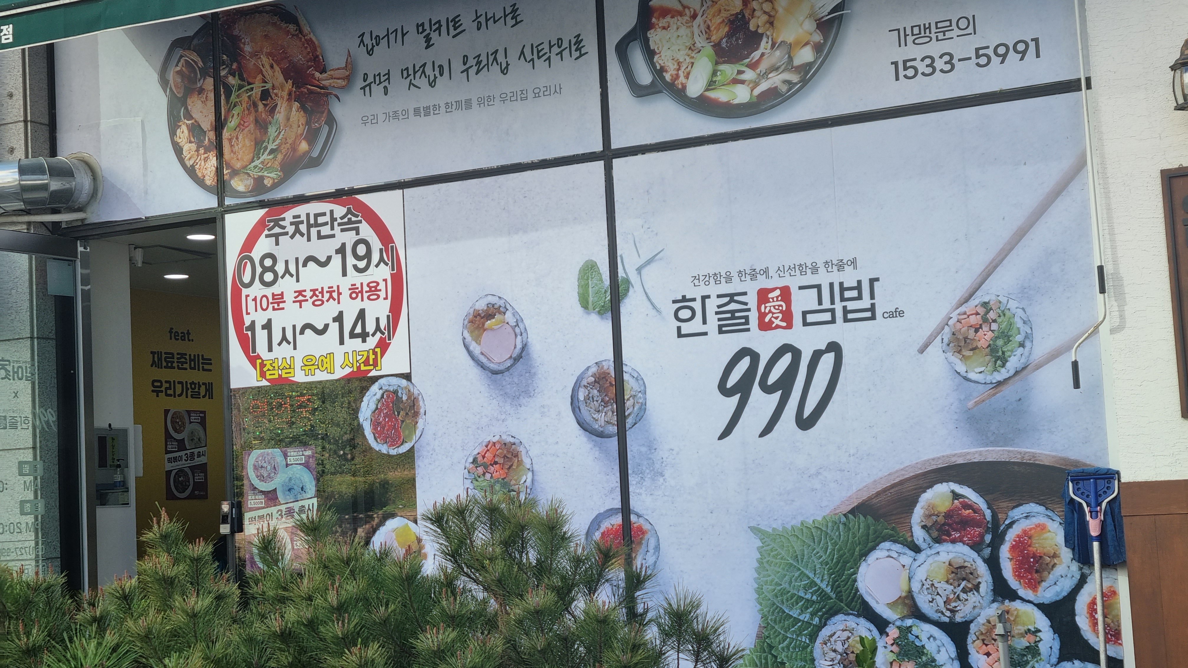 10년 전쯤인가 한 줄에 1천 원 김밥이 유행하여 많은 체인점이 생겨나고 즐겨 먹는 대표적인 음식이 되었는데 최근에 다시 하한줄에 990원 김밥이 있다 하여 방문하여 먹어보고 후기 평가해 보겠습니다.
