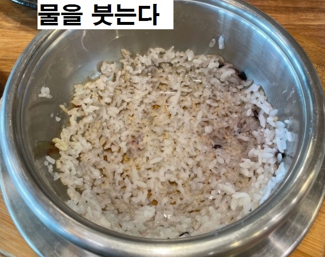 밥은 가마솥에 나오는데 열심히 드시고 거의 다 드시고 바닥에 누룽지만 남으면 따뜻한 물이 미리 나와 있는데 이곳에 부으면 됩니다.