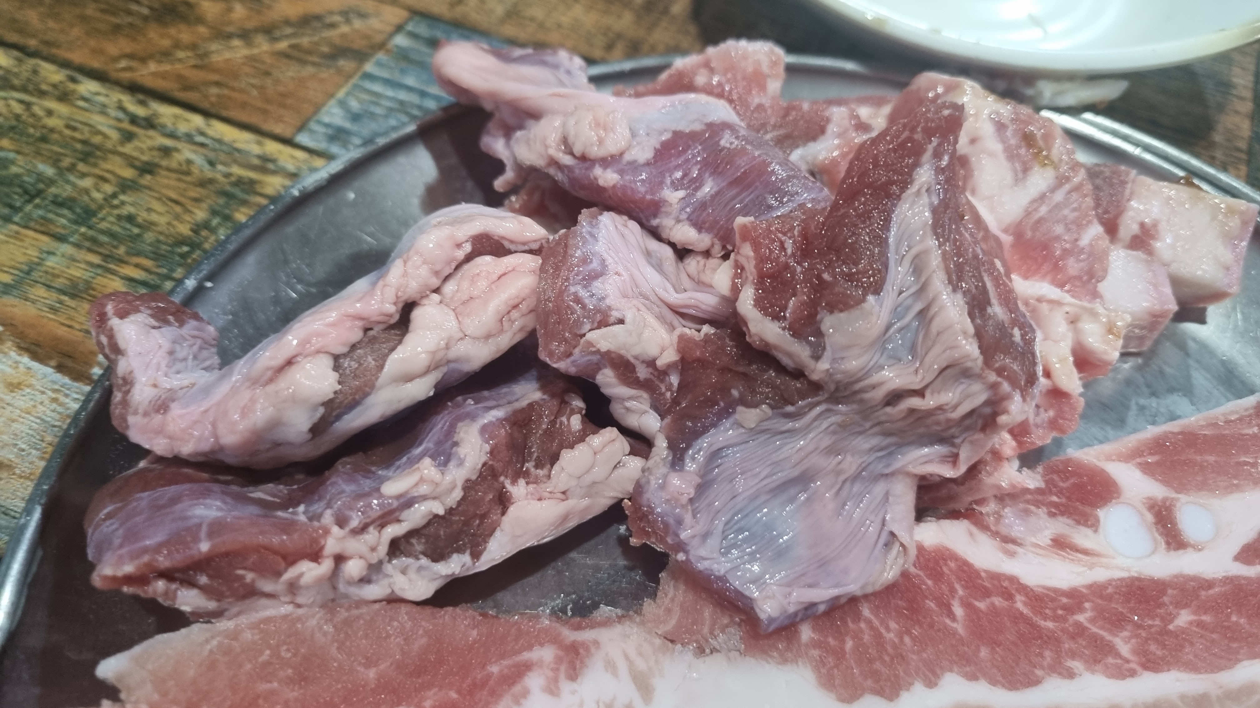 돼지고기 뒤다리도 있고 갈매기살도 있으며 돼지껍데기도 있습니다. 또한 고추장돼지양념도 보이네요.