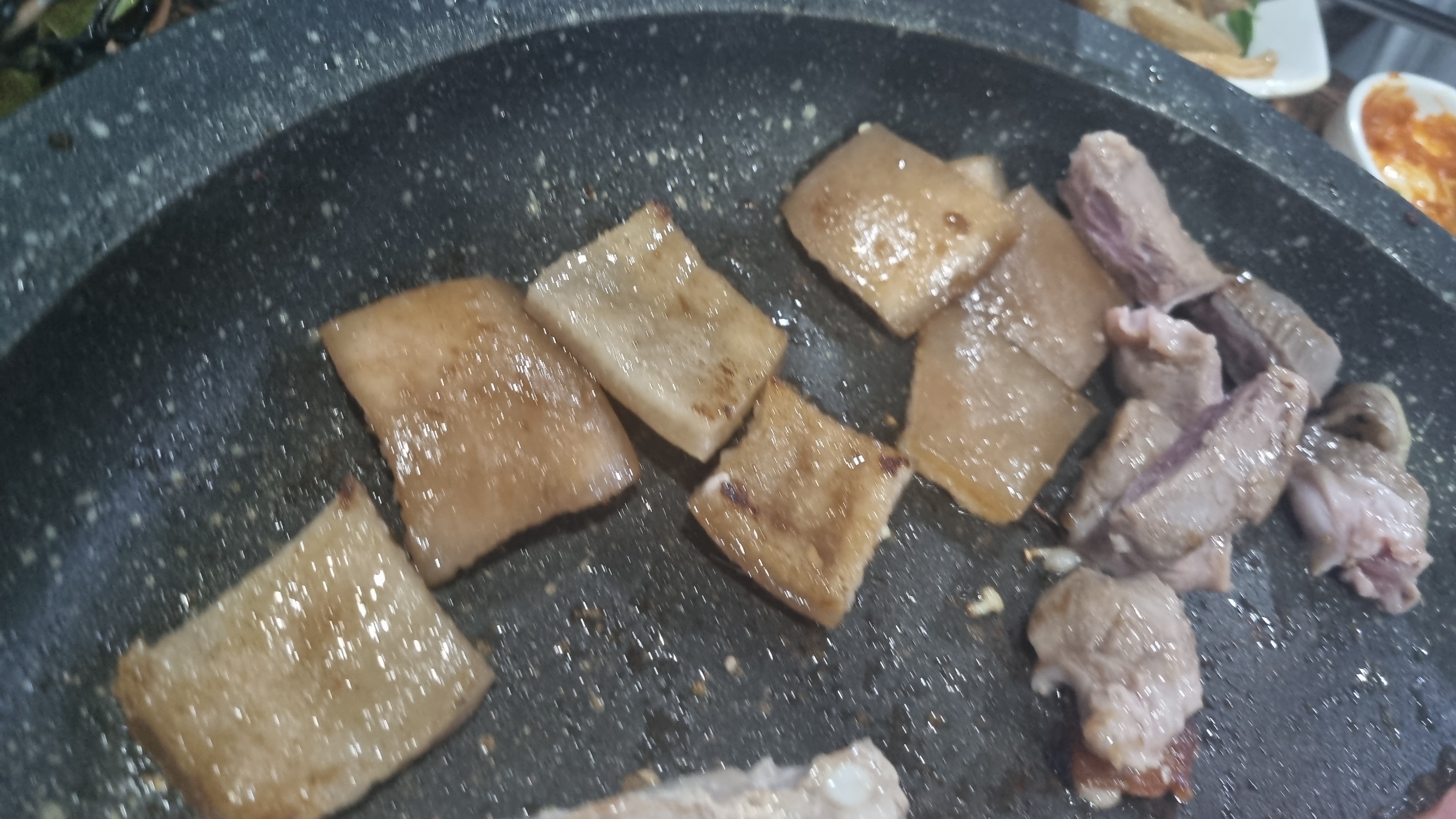 갈매기살과 돼지 껍데기도 구웠습니다. 무한리필집에서 갈매기살 같은 특수부위가 있어 좋았고 맛도 정말 맛있었습니다.