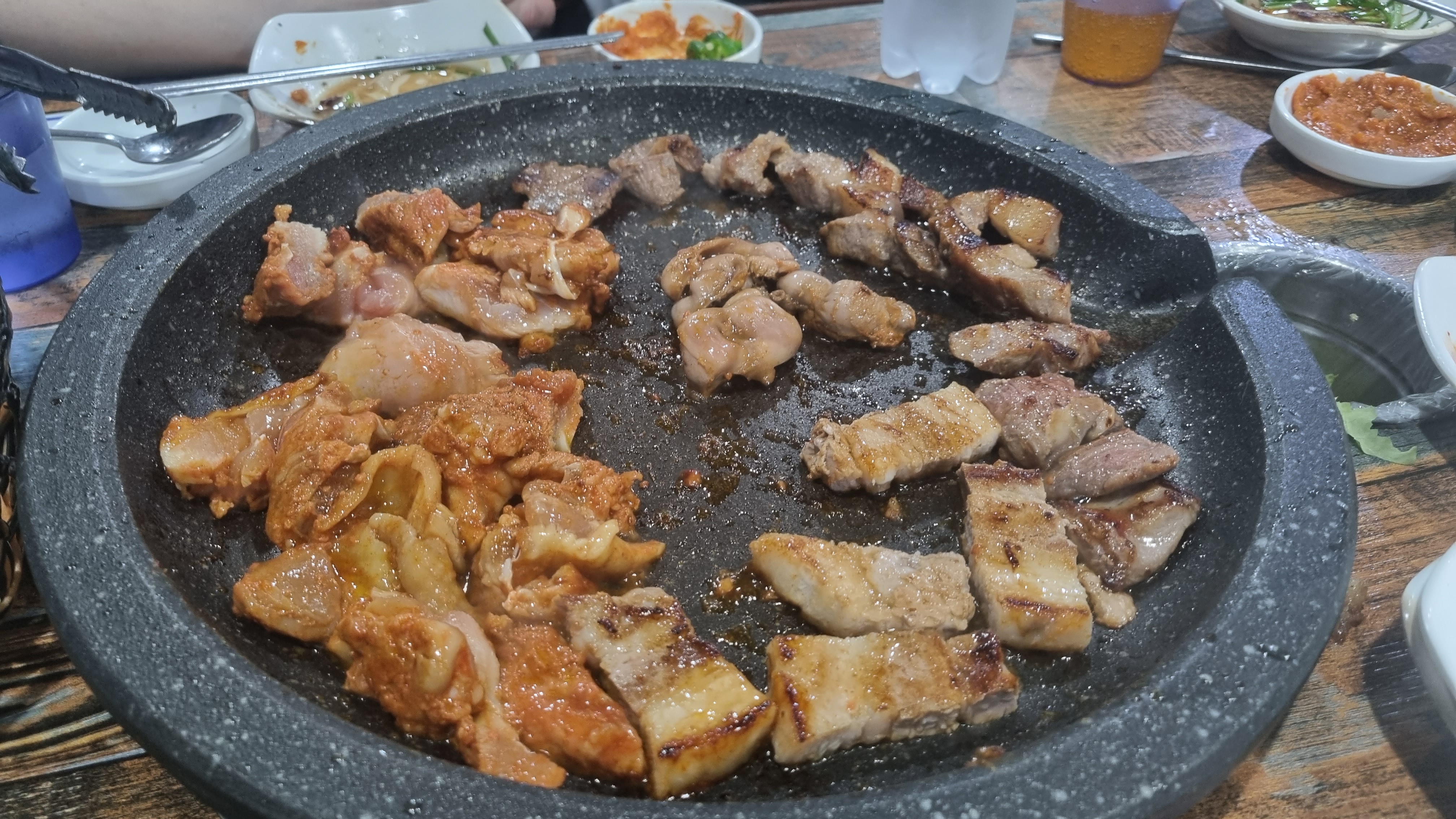 엄청나게 고기를 먹고 마무리 시점에서 양념 닭갈비와 닭똥집을 마지막으로 굽기 시작합니다. 닭갈비는 정말 부드럽고 양념맛이 좋으며 닭똥집은 쫄깃하여 계속 먹게되어 추가하여 더 먹었습니다.